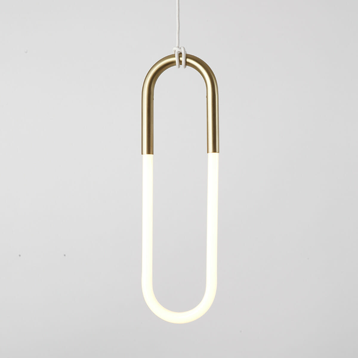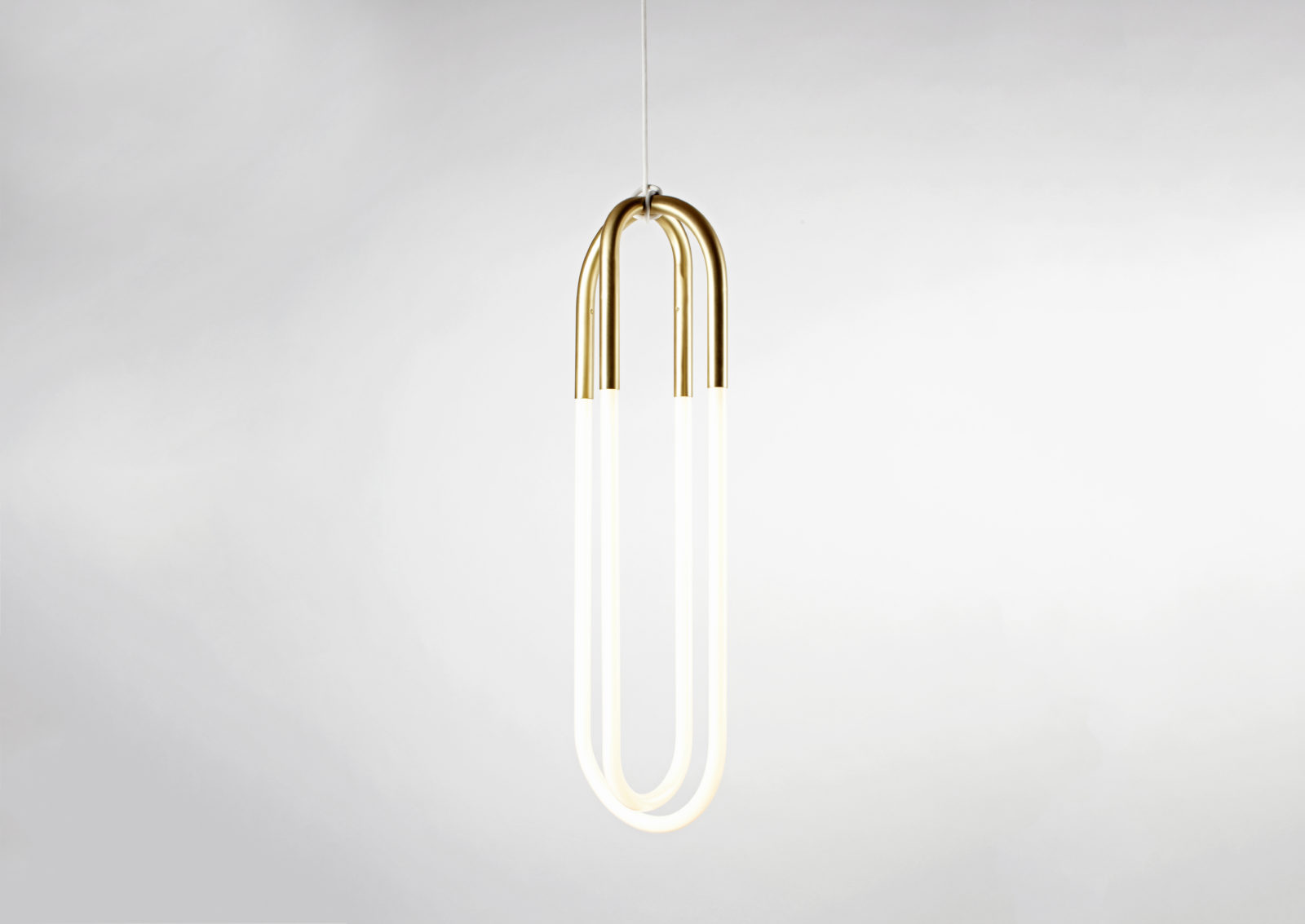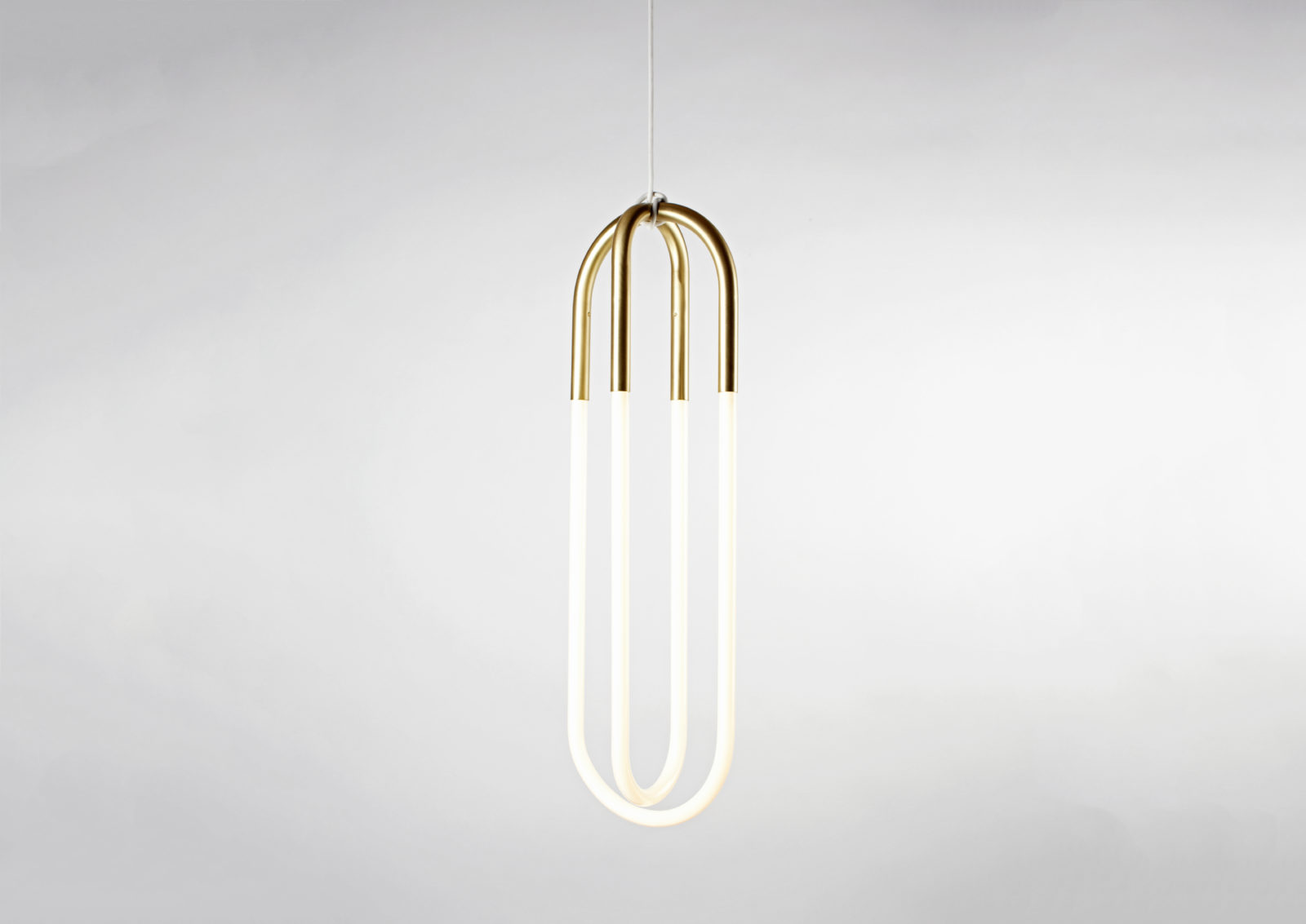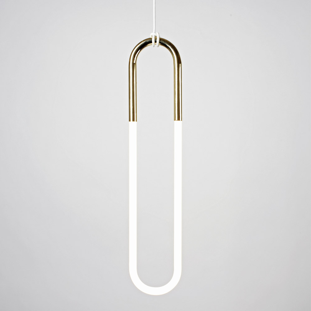 Jewelry is the inspiration for Rudi, a series of pendant lamps named after Lukas Peet's father, a jeweler. Rudi is made from bent metal tubes that hold handmade cold cathode lamps. The fixtures hang from their cords, which are hand-knotted around metal tubes.