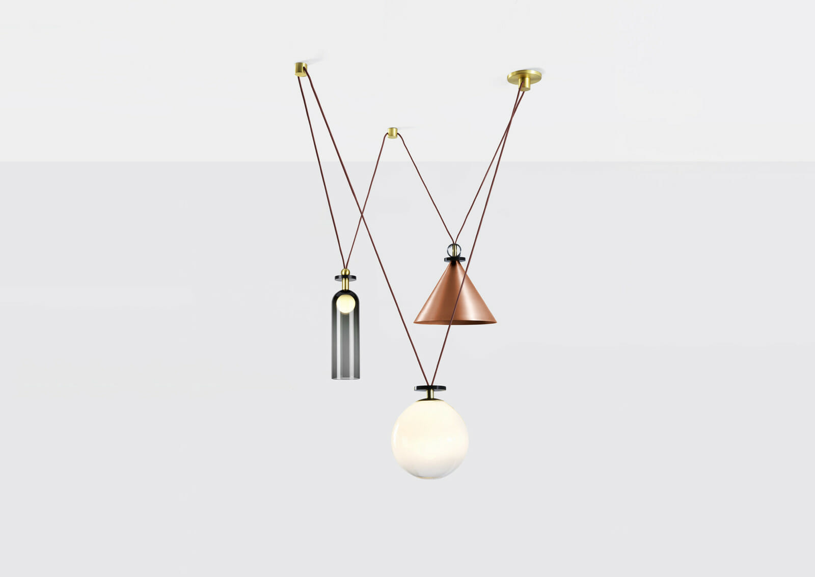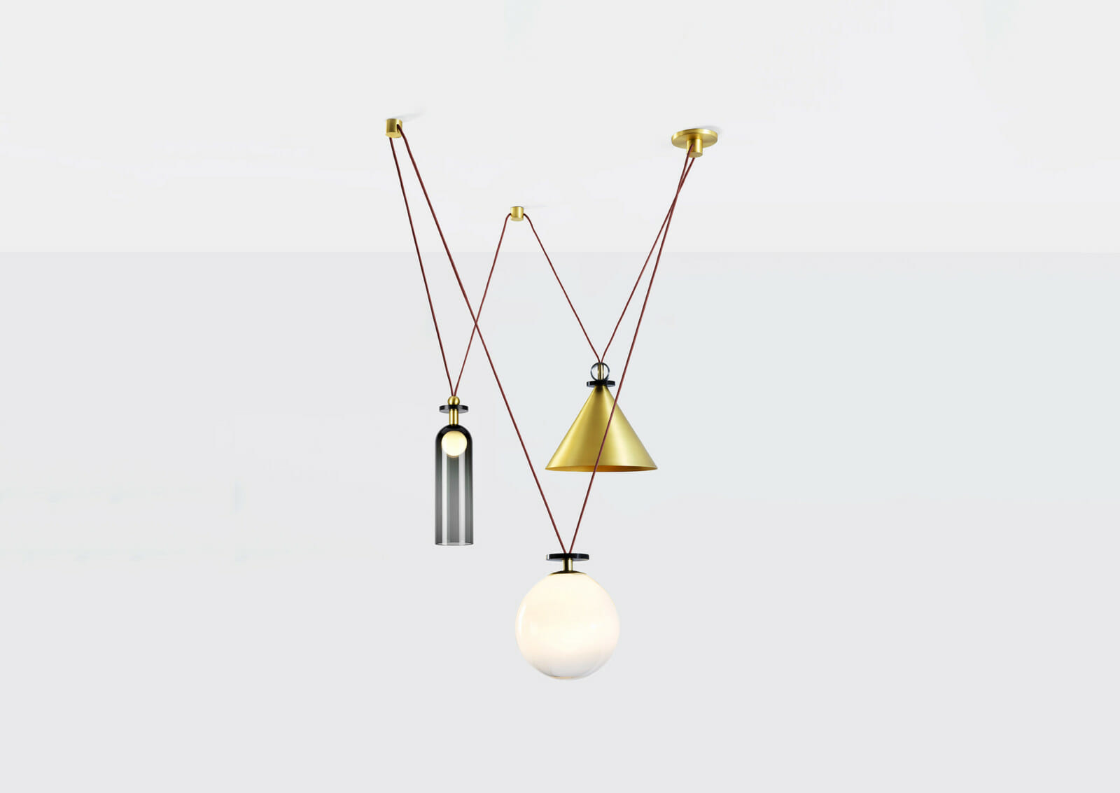 Shape Up is a versatile lighting series that celebrates bold geometric shapes: the playful juxtapositions upend traditional notions of symmetry in favor of a dynamic spatial harmony. The modular system allows the shapes to be suspended and composed in response to a space's architecture and function, its shades discreetly networked via connecting cords and hubs.