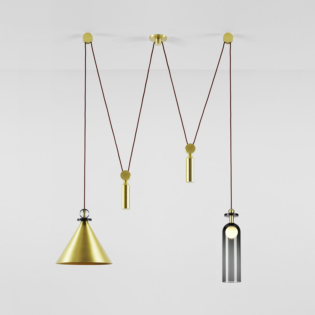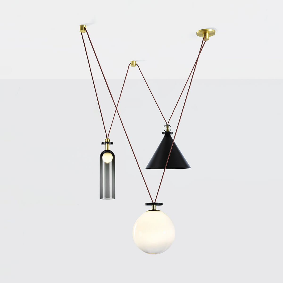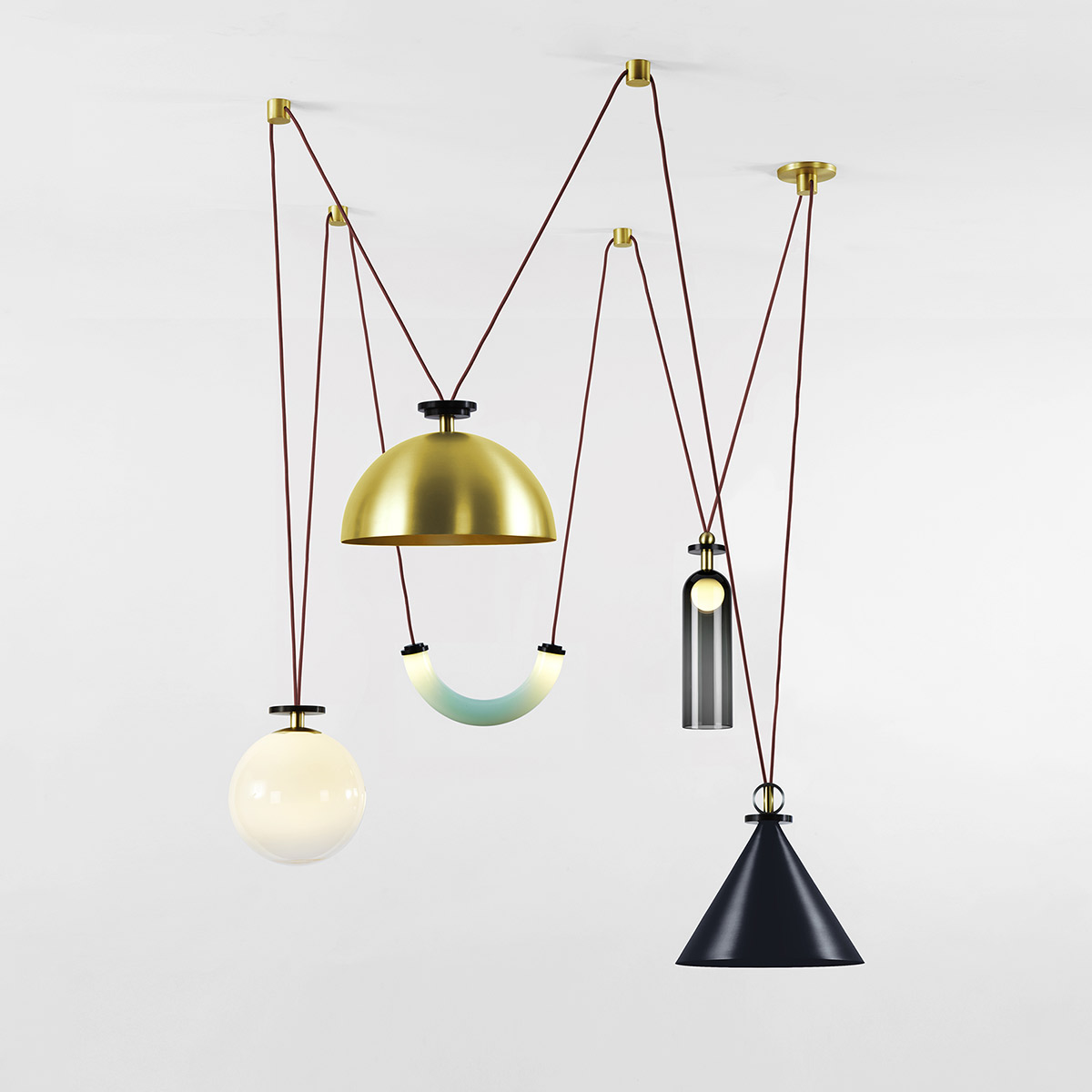 Shape Up is a versatile lighting series that celebrates bold geometric shapes: the playful juxtapositions upend traditional notions of symmetry in favor of a dynamic spatial harmony. The modular system allows the shapes to be suspended and composed in response to a space's architecture and function, its shades discreetly networked via connecting cords and hubs.