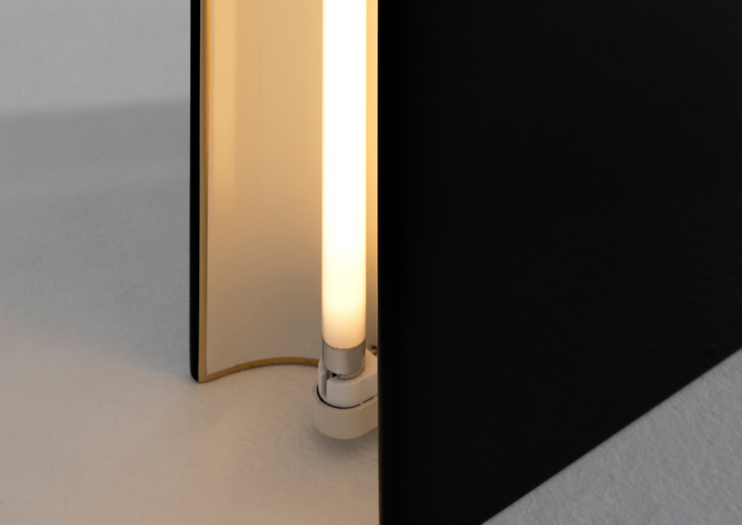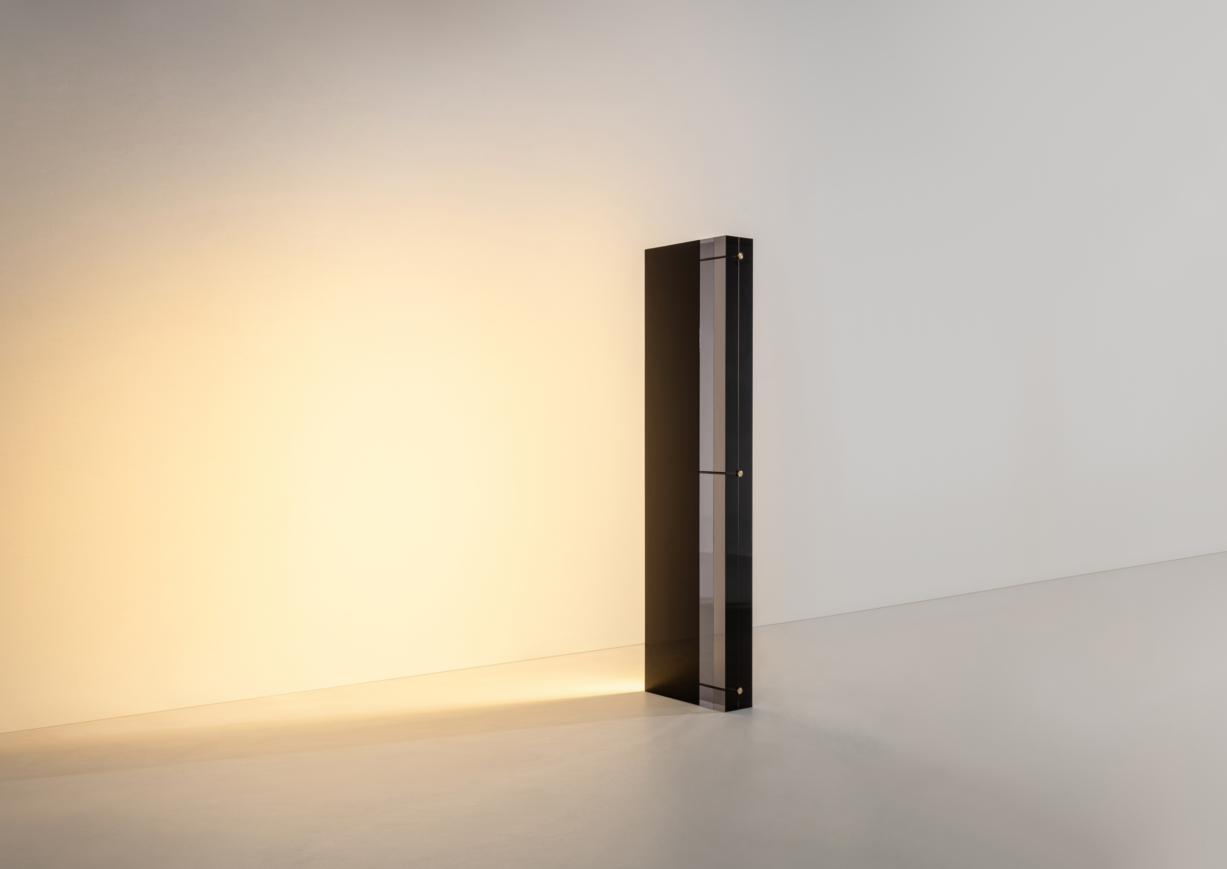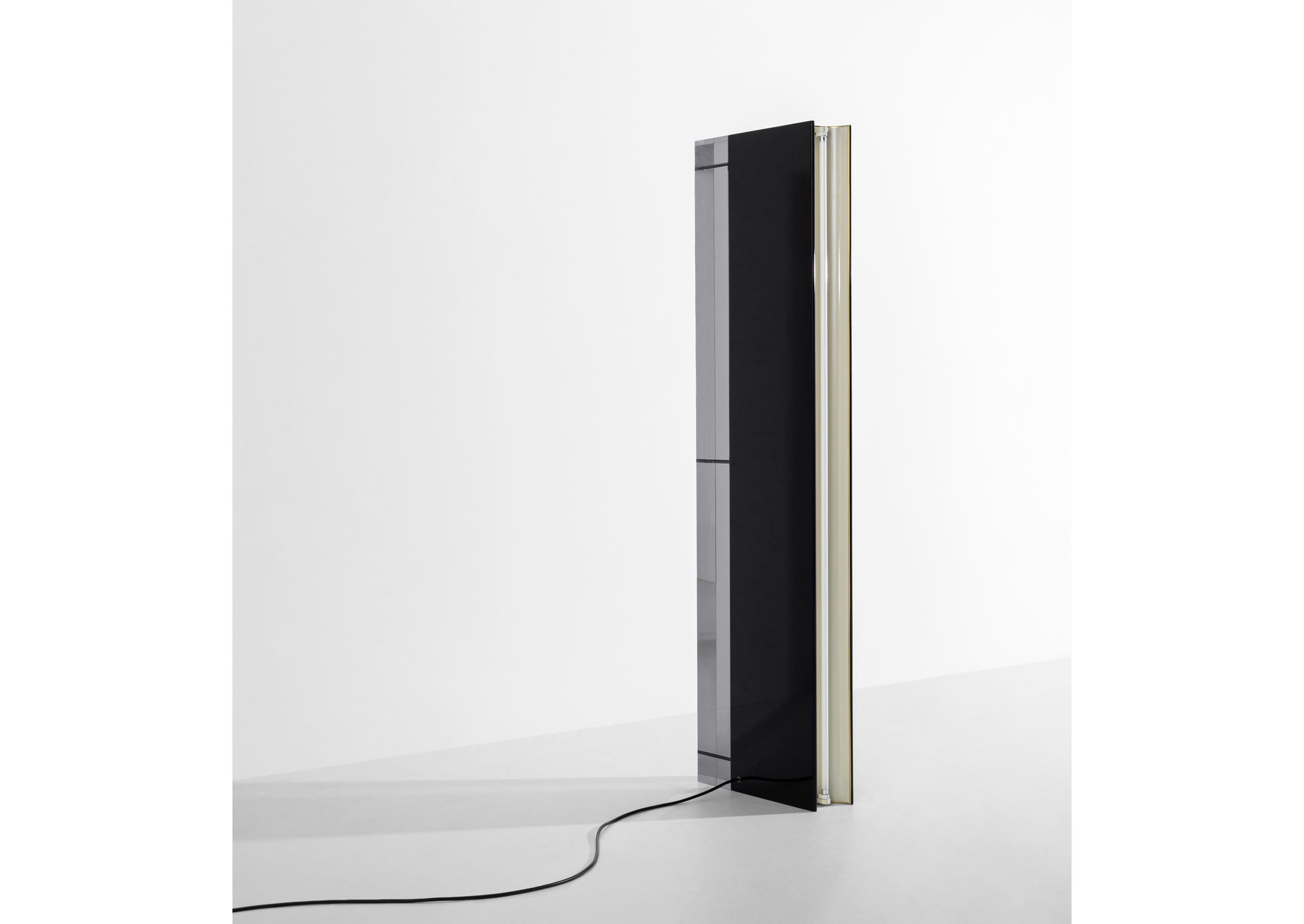 Floor sculpture lamp with structure in plexiglass fumè and glossy black painted wood. Handmade golden details.