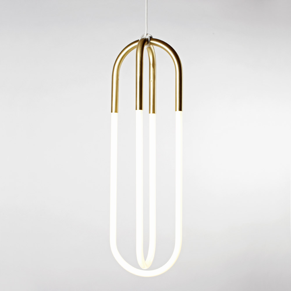 Jewelry is the inspiration for Rudi, a series of pendant lamps named after Lukas Peet's father, a jeweler. Rudi is made from bent metal tubes that hold handmade cold cathode lamps. The fixtures hang from their cords, which are hand-knotted around metal tubes.