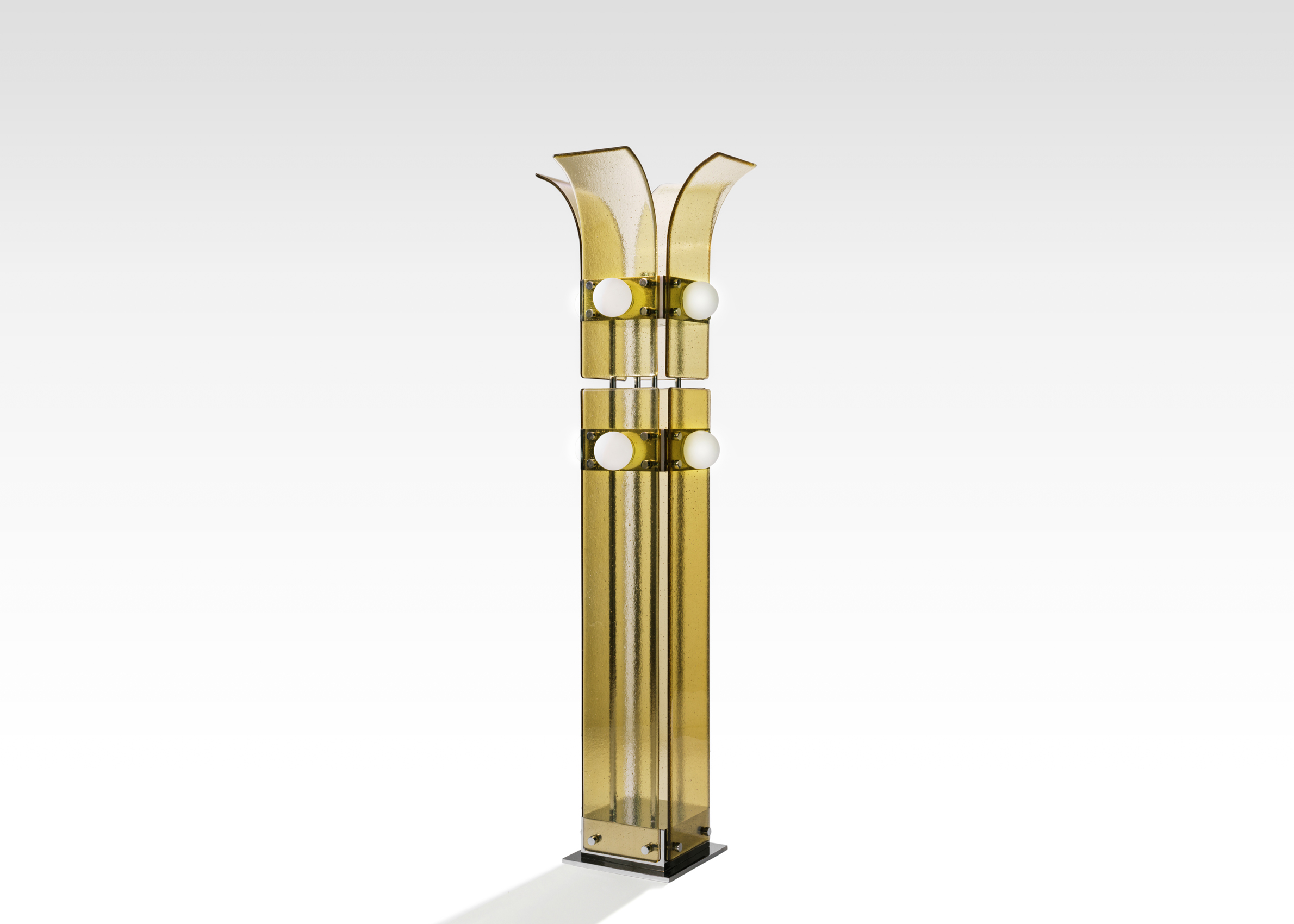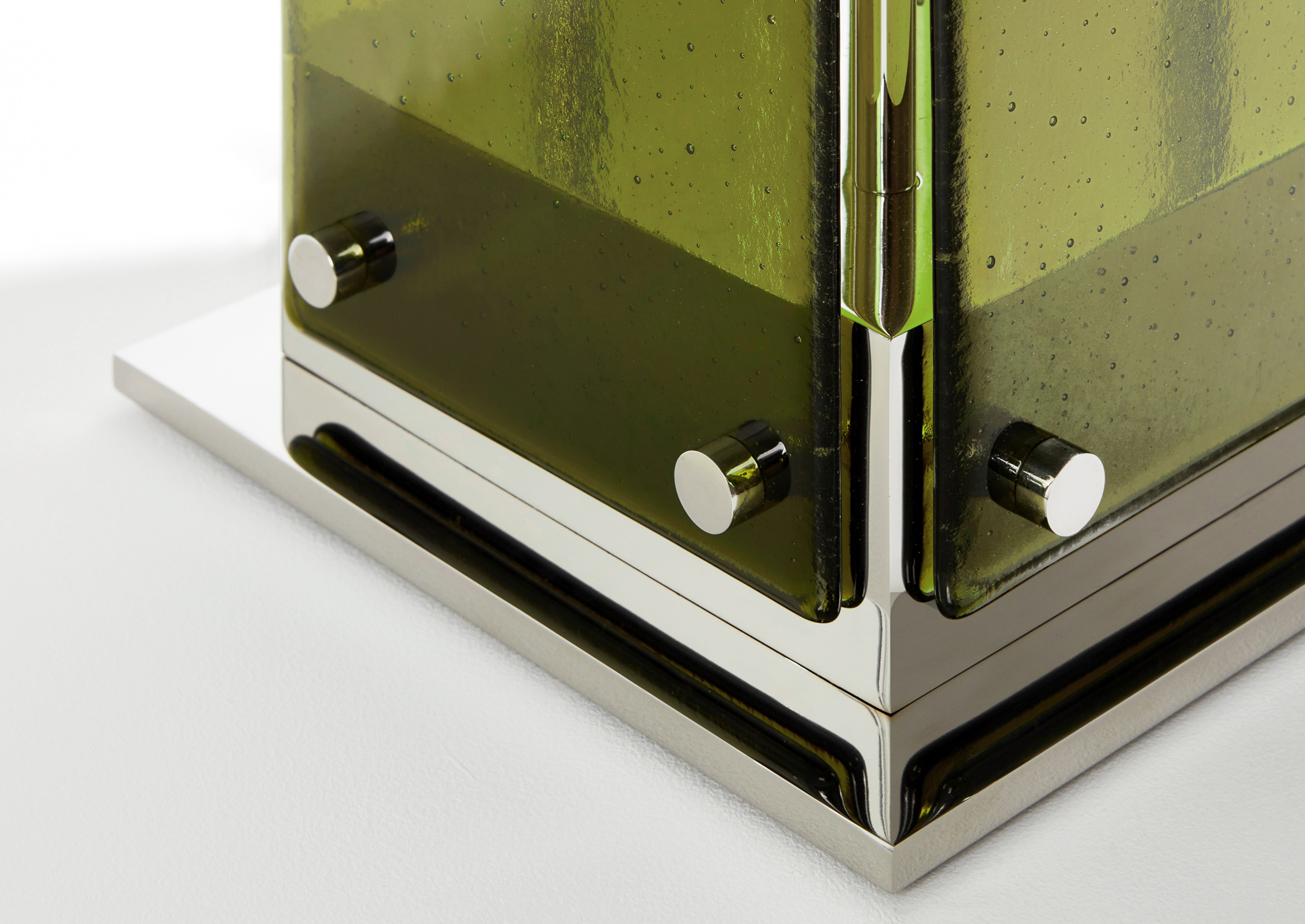 Drawing inspiration from the beach modernism of the Fire Island Pines, the Palm series combines hand rolled, kiln slumped glass and precision machined steel or brass elements. The subtle texture and soft edge of the glass provides a warm counterpoint to the metal’s strict lines. Slumped Glass in 6 standard colors - Bronze, Plum, Lily Pad Green, Steel Blue, Pigeon Gray, Light Amber.