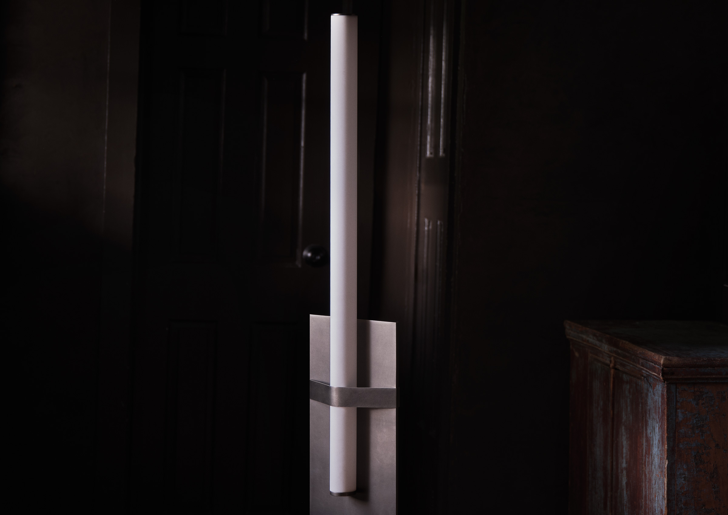 In a strikingly simple design, an illuminated tube is strapped to a geometric steel base which is hand-finished in a soft nickel patina.