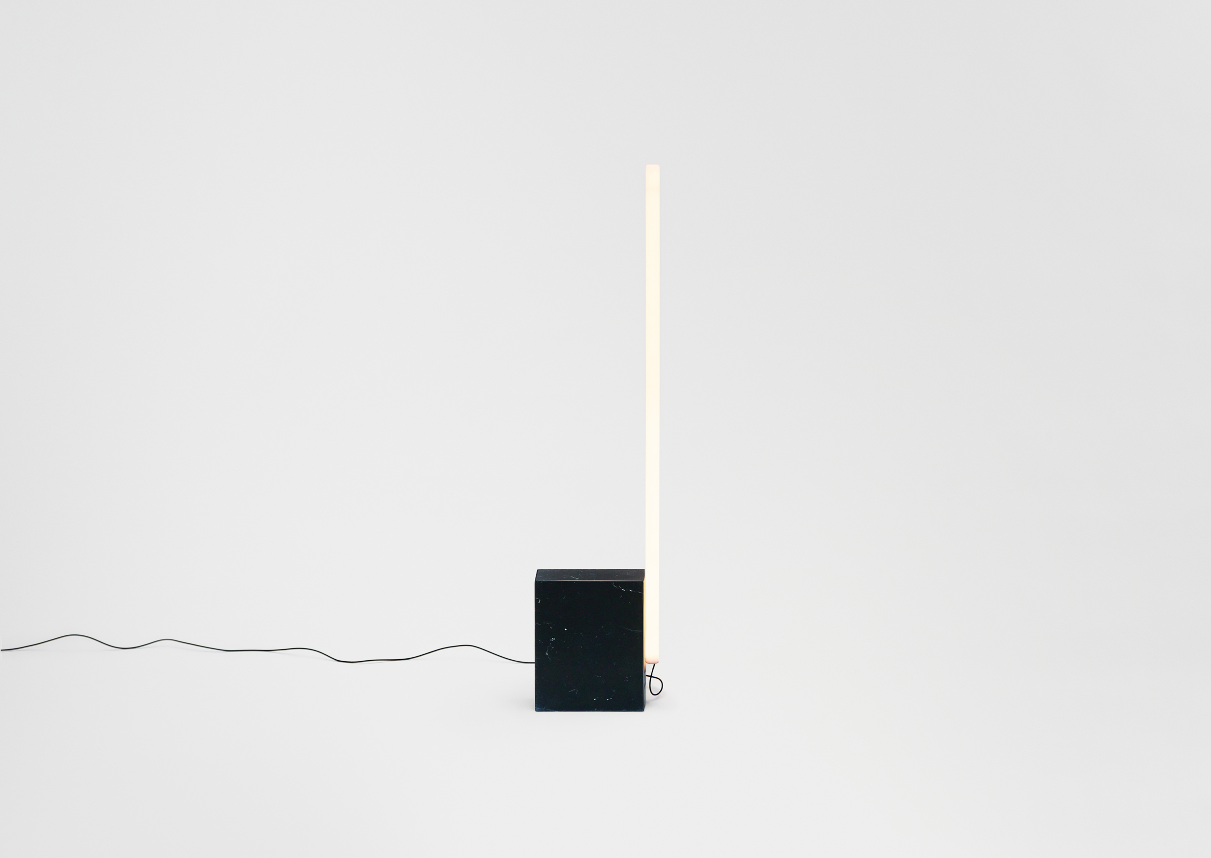 This family of floor lamps proposes an interchangeable lighting solution attached to a marble block. The exercise is an attempt to provide minimal support for the linear lighting elements through the simple gesture of touching the marble base with an invisible magnetic connection. The result is a distilled composition of basic elements.