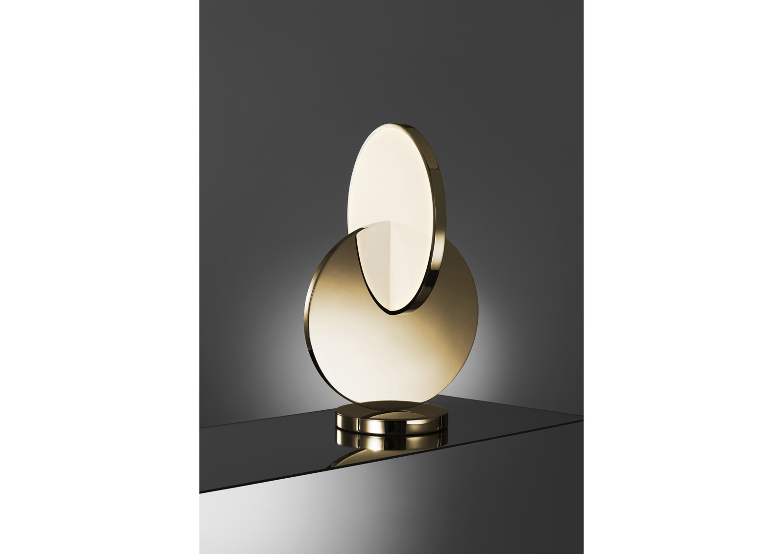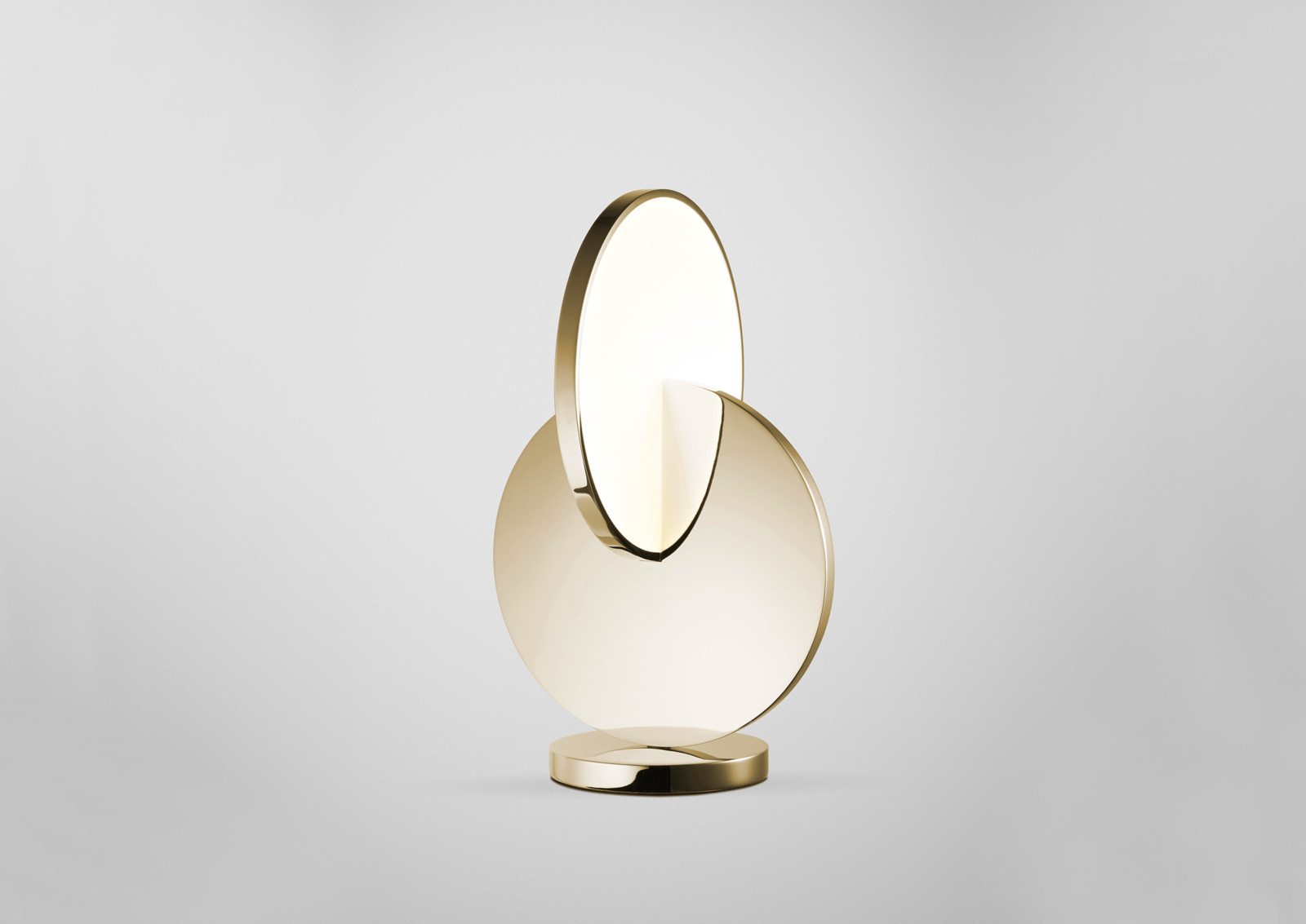 Eclipse Table Lamp has a sculptural silhouette with a mobile-like quality that changes at every angle. Gold and acrylic discs supported by a mirror-polished base rotate by ninety degrees to angle the diffusion of light and reveal multiple silhouettes. Eclipse is available as a singular pendant light, tiered chandelier and table lamp in polished chrome and polished gold finishes.
