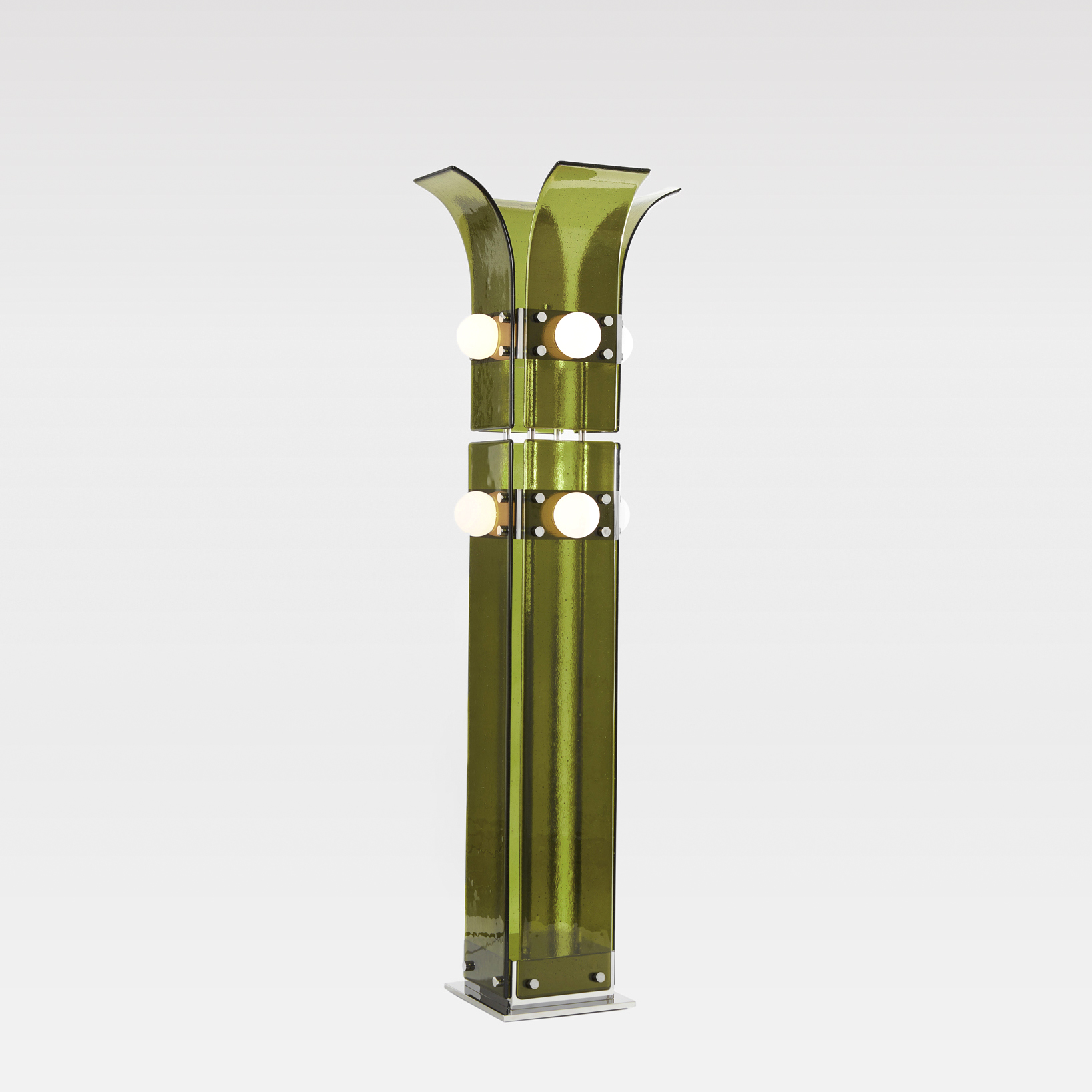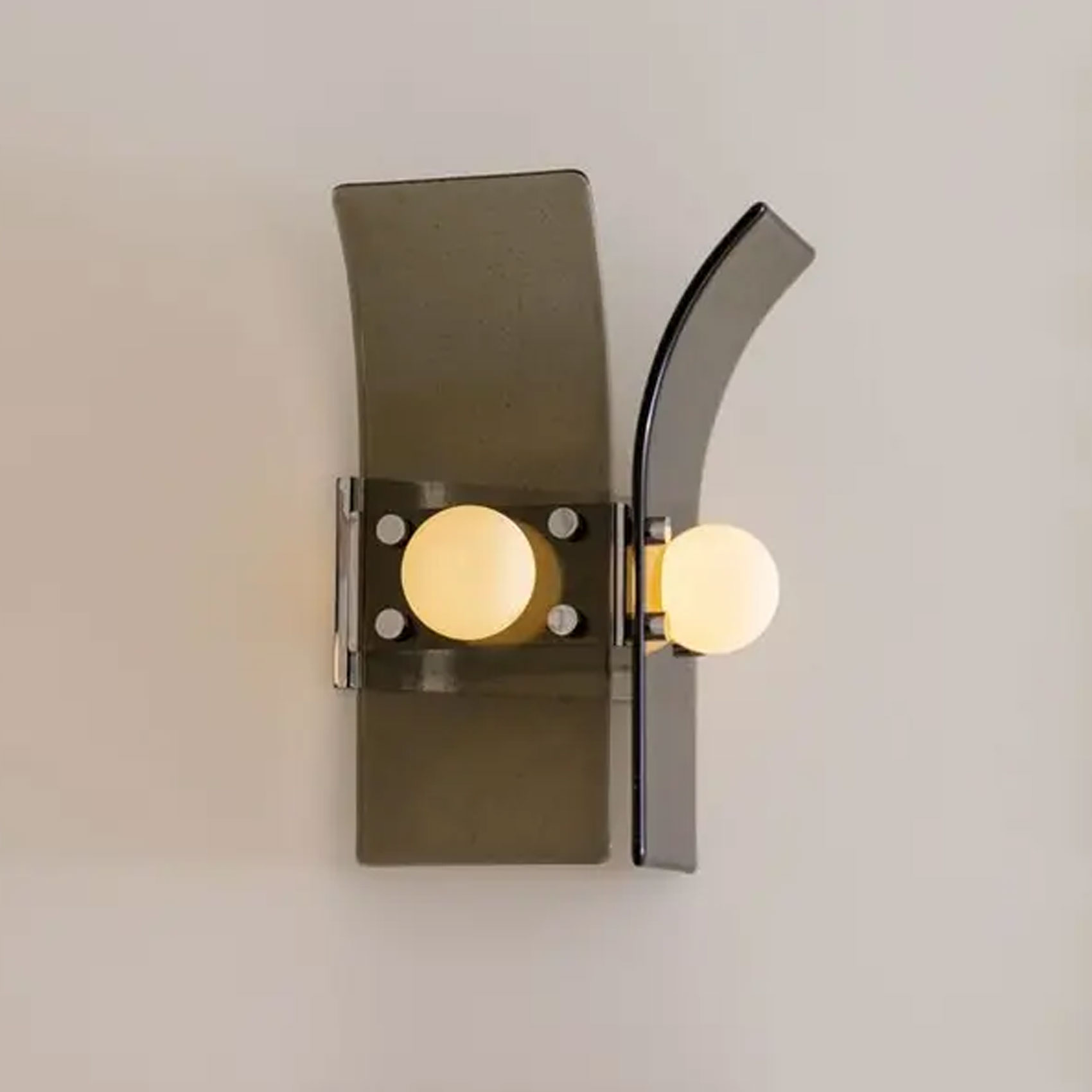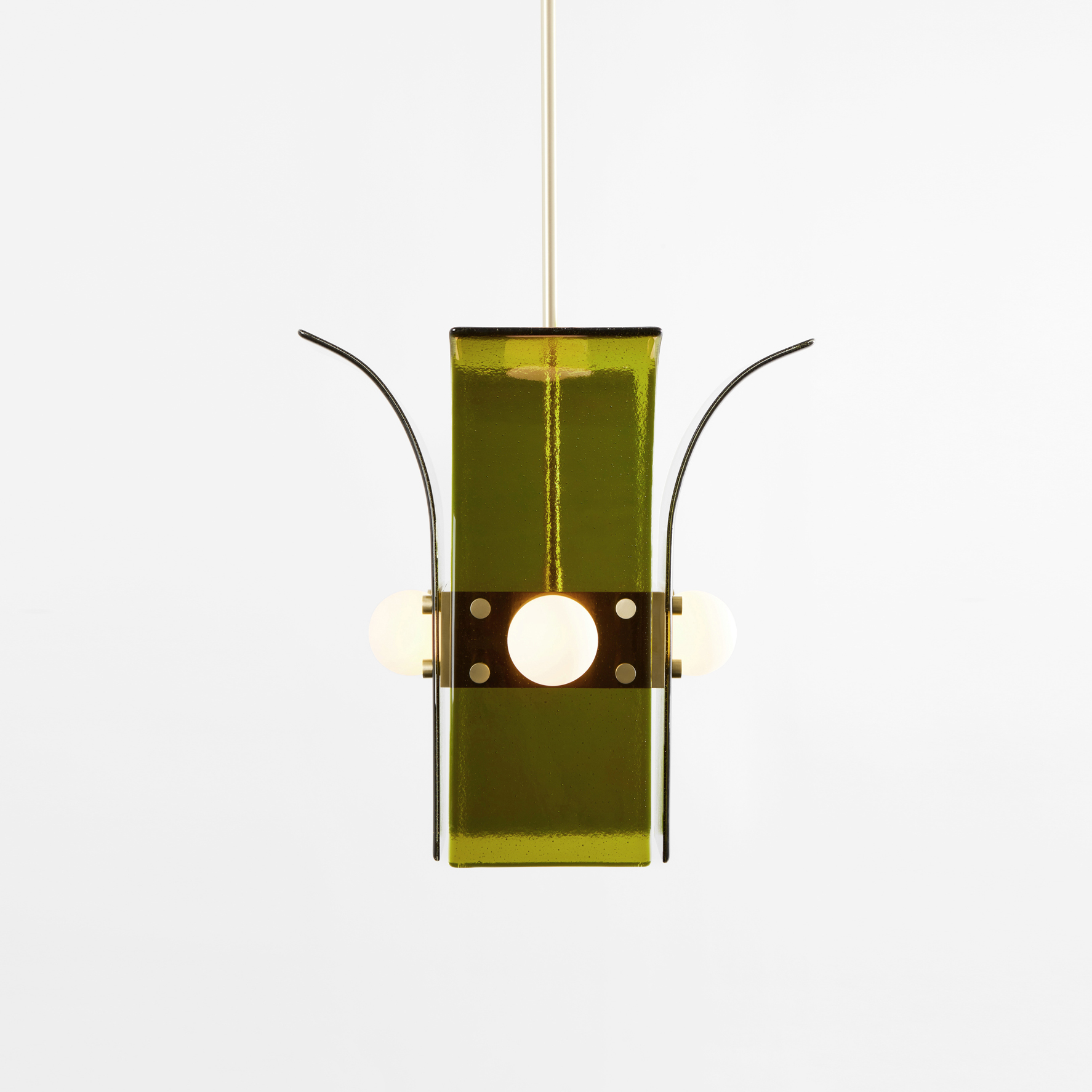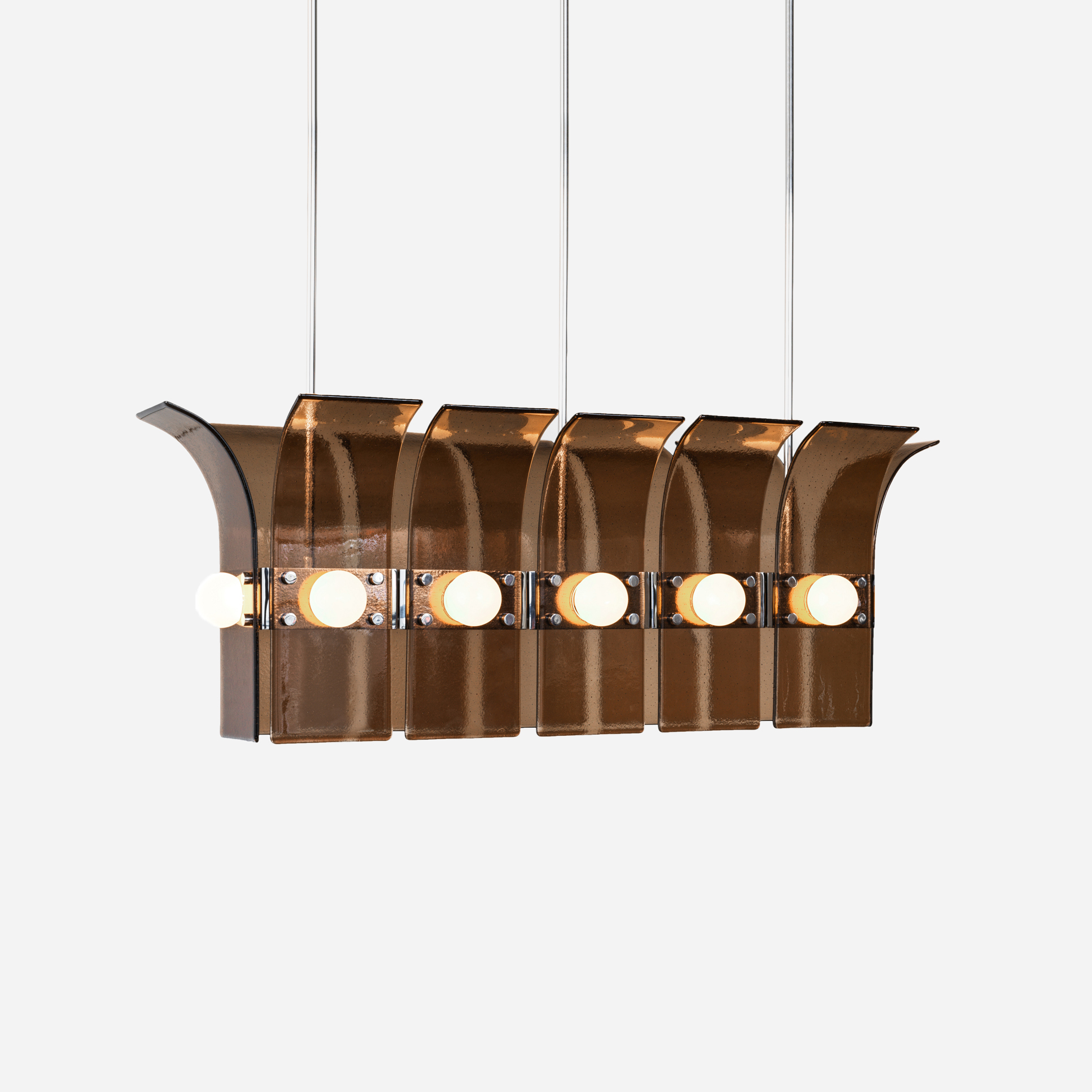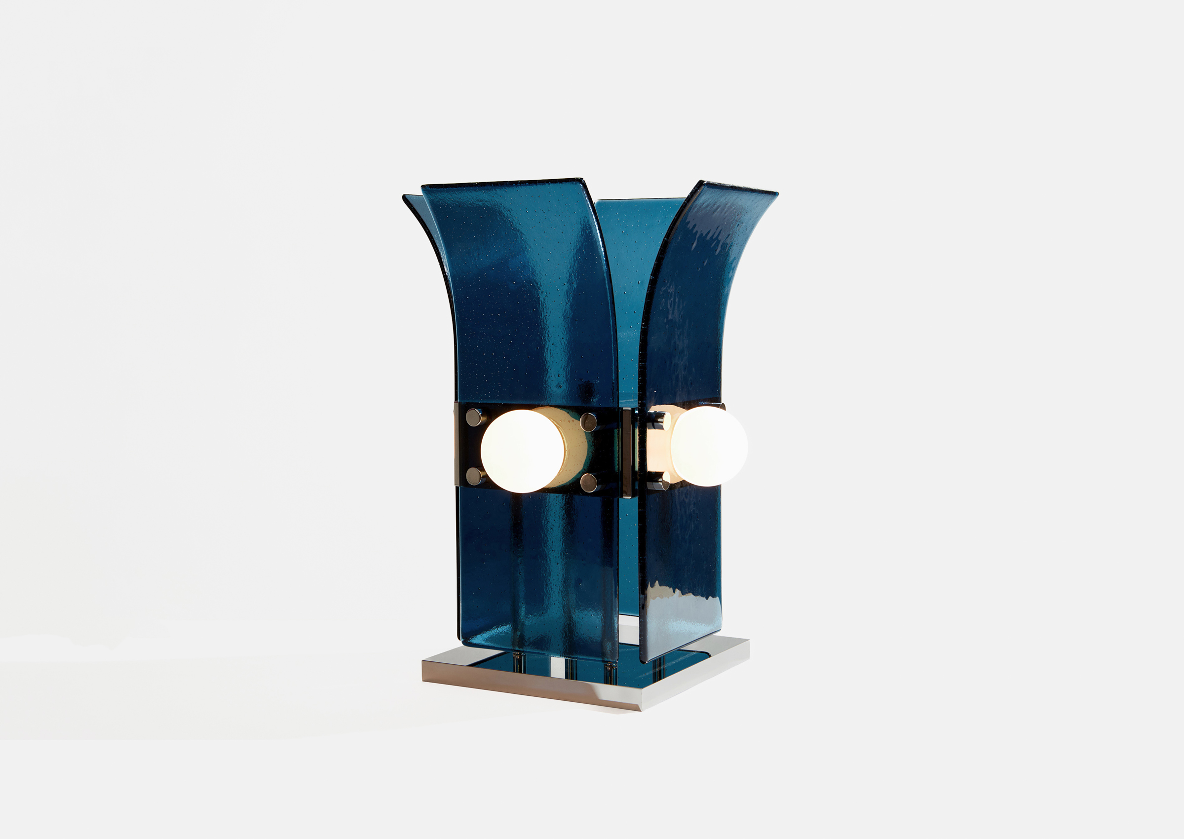 Drawing inspiration from the beach modernism of the Fire Island Pines, the Palm series combines hand rolled, kiln slumped glass and precision machined steel or brass elements. The subtle texture and soft edge of the glass provides a warm counterpoint to the metal’s strict lines. Slumped Glass in 6 standard colors - Bronze, Plum, Lily Pad Green, Steel Blue, Pigeon Gray, Light Amber.