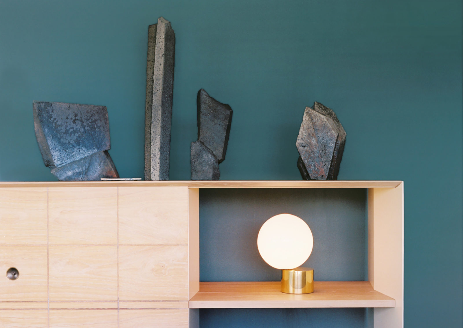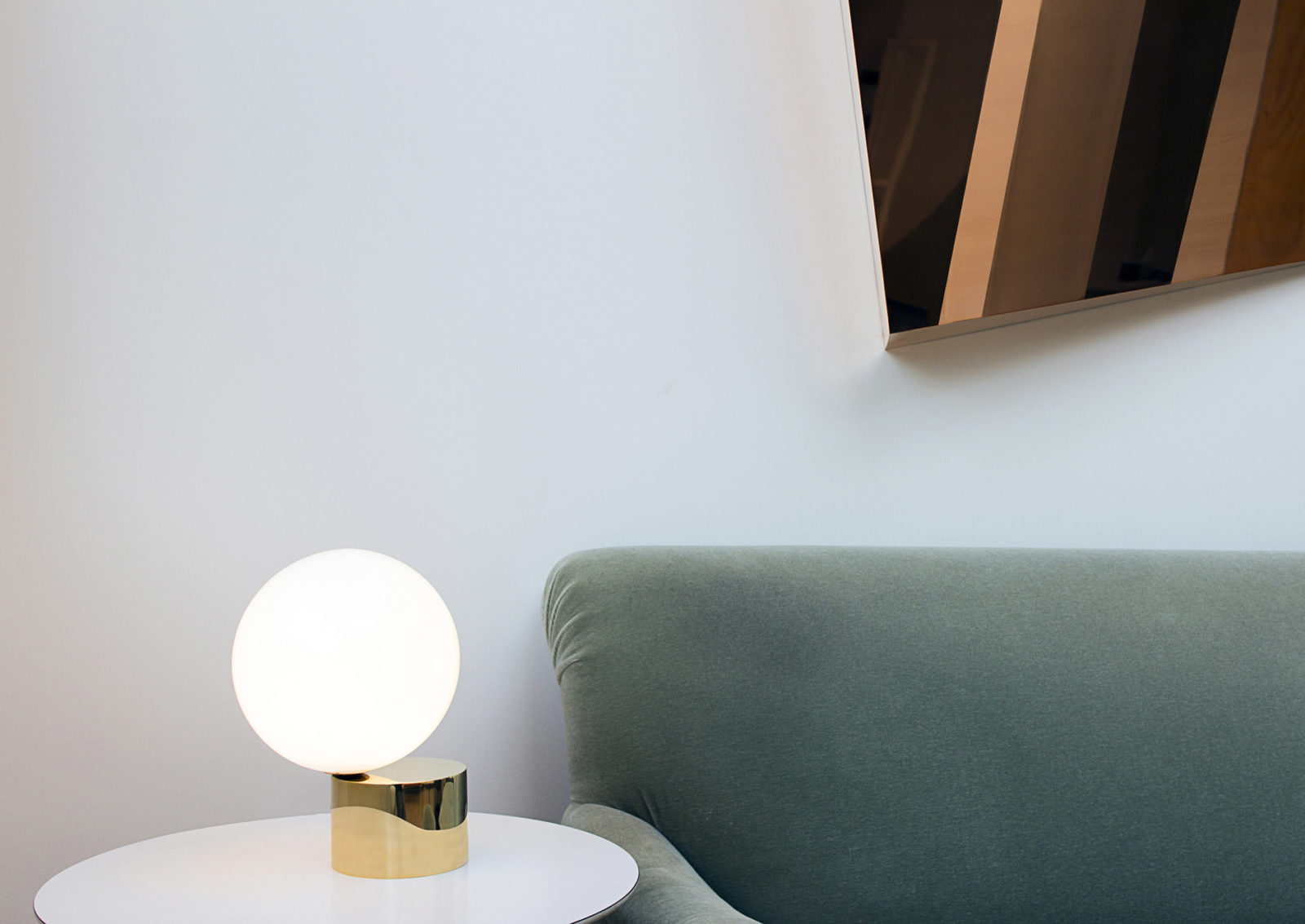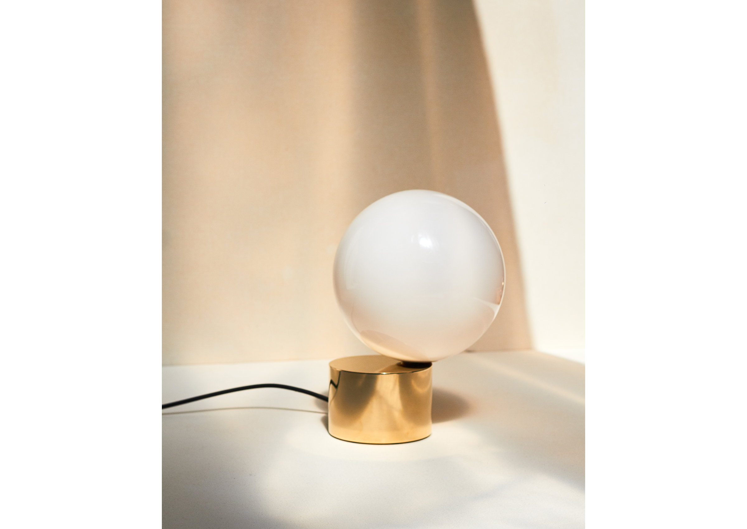 The Tip of the Tongue light, a finely crafted table fixture from Michael Anastassiades, is made with mouth-blown opaline glass, which is formed into a sphere, and placed atop a polished brass base.