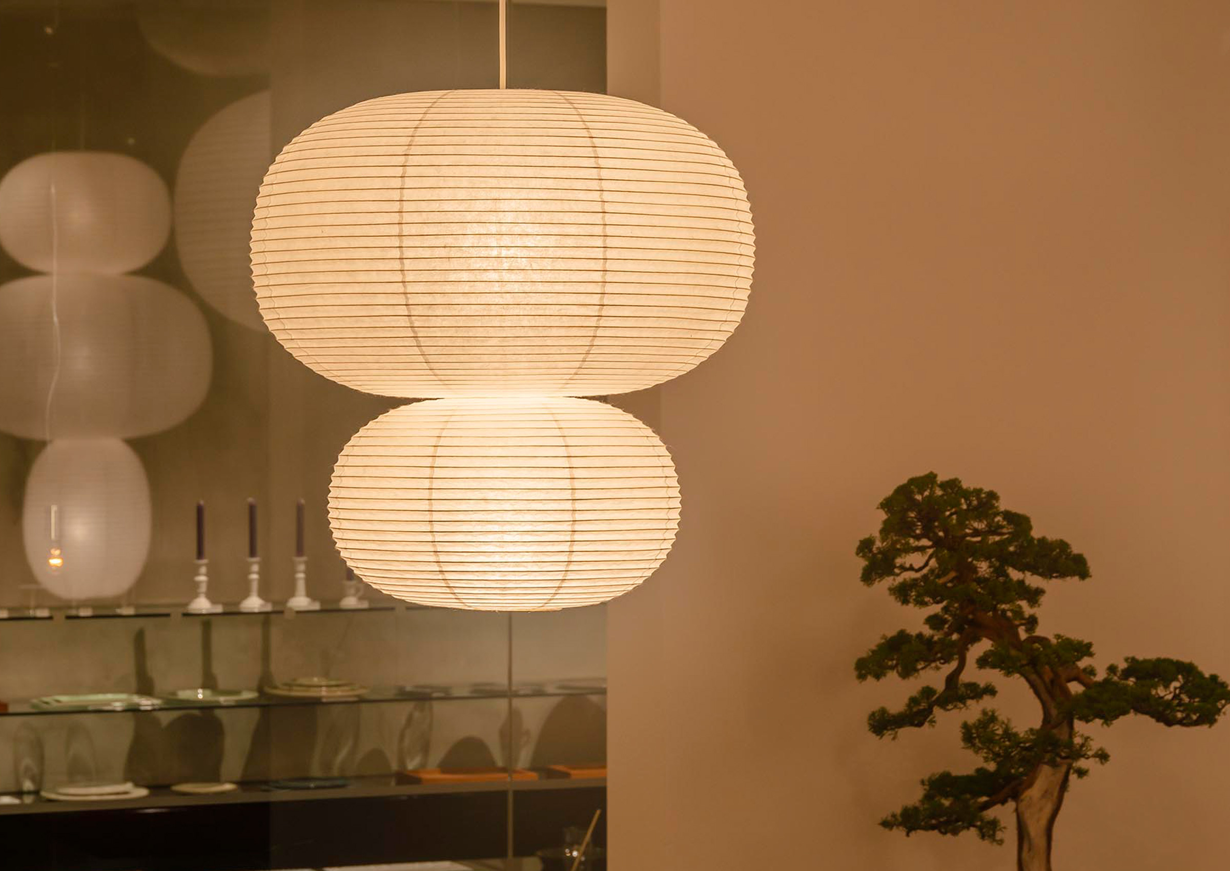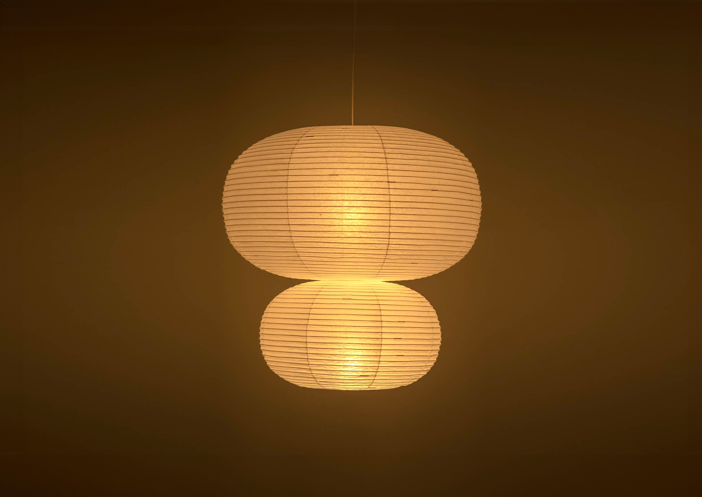 Suifu lanterns are made in one of a few producing areas that carry forward old-fashioned handmade manufacturing methods using bamboo strips and washi. Doing so creates shadows from uniformly thin and beautiful strips, but bamboo strips lend an expression to the shadows they throw, creating a soft impression for the lantern as a whole. Sekishu washi is made in the only place where its source material, kozo pulp, is cultivated in the same area. This washi has an ecru colour that comes from the use of kozo pulp complete with the endocarp, and is also characterized by its strength. It is thanks to the robust construction of Suifu lanterns and to Sekishu washi, that we were able to create such a large paper lantern. The modeling of light born of natural materials and Japanese tradition illuminates modern spaces and gives rise to richly expressive scenes.