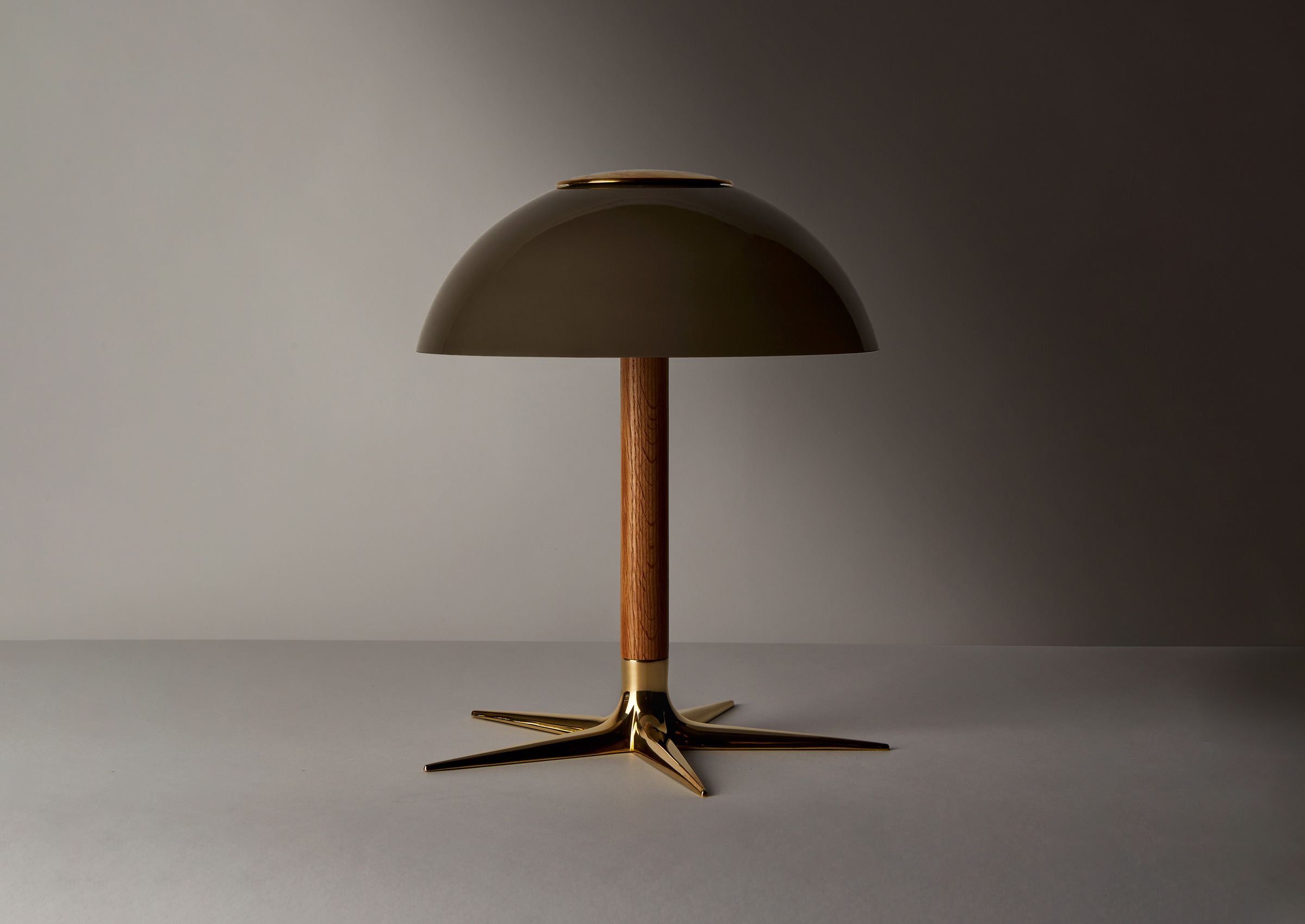 A star-shaped, unlacquered brass base anchors a white oak stem and Italian glass shade. Composed of three unique elements perfectly mixed to create a graceful table lamp embracing the old and the new, stars and mushrooms.