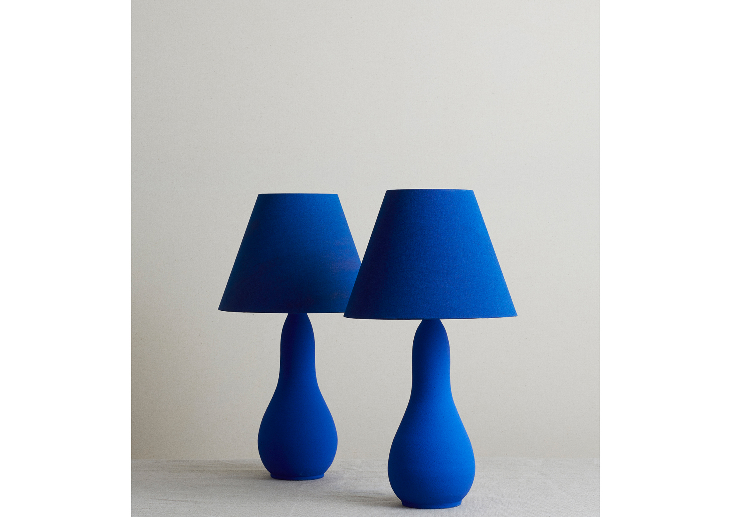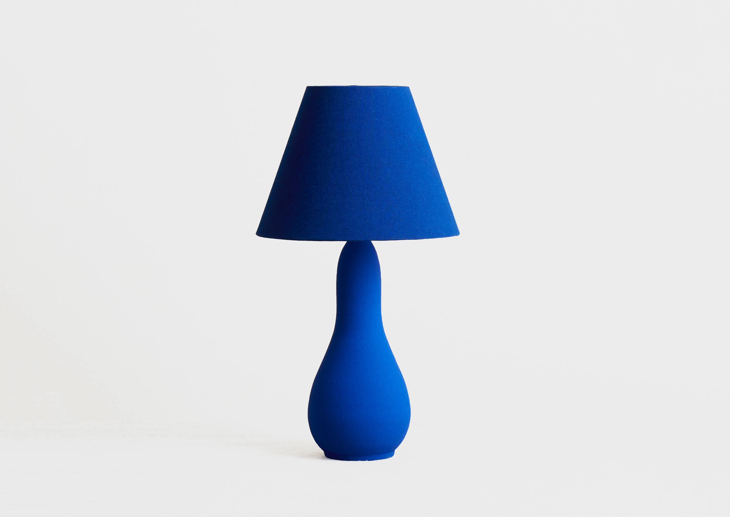 The True Blue ceramic lamps are beautiful utility objects and works of art. The monochrome ultramarine pigment used for the lamps bears a resemblance to Yves Klein. Every lamp is unique and varies slightly in color and size while the lampshades are made from hand-painted fabric. The inspiration comes from among other sources Pre-Columbian terracotta works and ancient Japanese craft traditions, including special glazing techniques and raku firing.