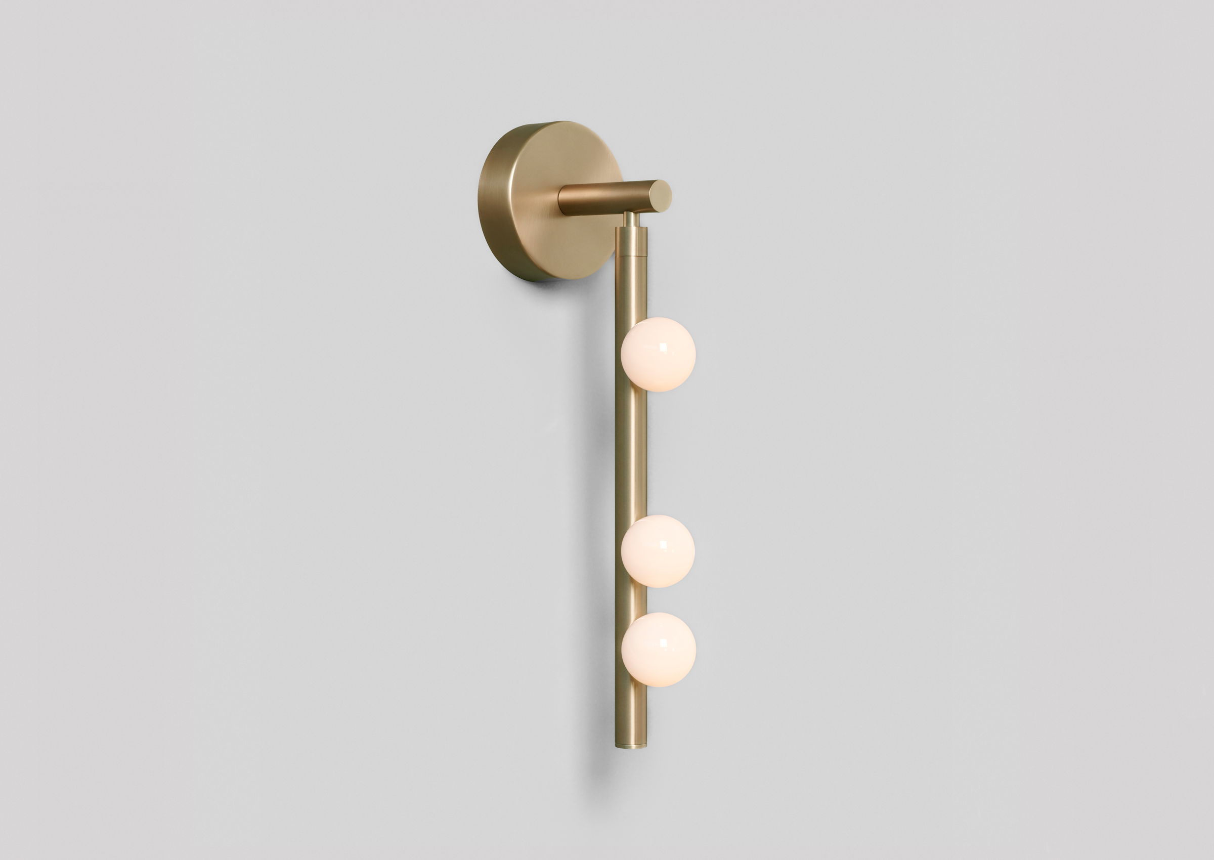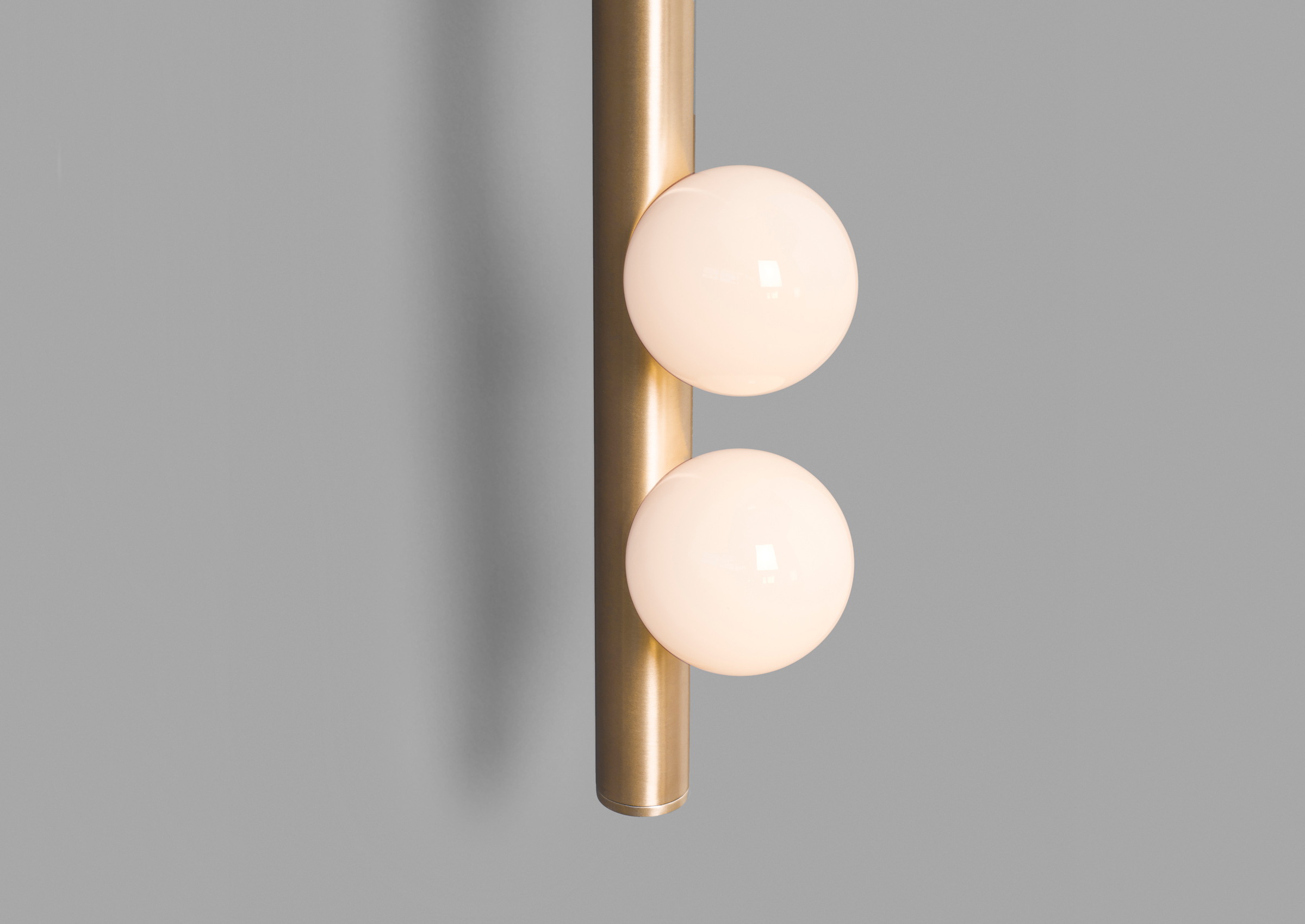 Piet Mondrian's influence on modern abstraction inspired Lindsey's Drop System, where she used brass tubing and glass globes to explore the balance between rigidity and fluidity. The custom-configurable fixture elegantly plays with vertical and horizontal elements while offering various finishes for a unique collection.