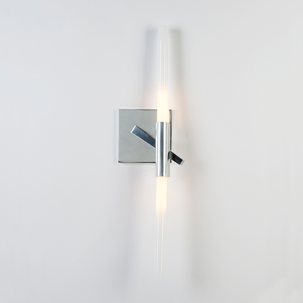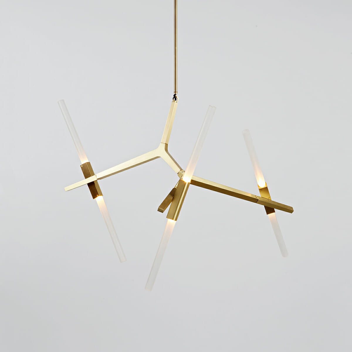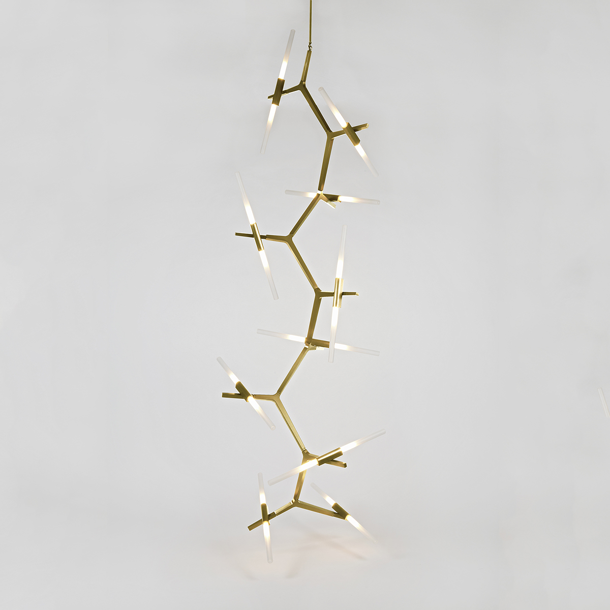Originally conceived as a candelabra, Agnes takes its inspiration from the fictional heroine of the same name, a worker in the world's oldest profession during the 1849 California Gold Rush. The modular system would allow Agnes easy setup in her makeshift "workspace." In this version, glowing glass tubes replace the candles. Articulated joints allow the glass to be arranged in a multitude of ways.