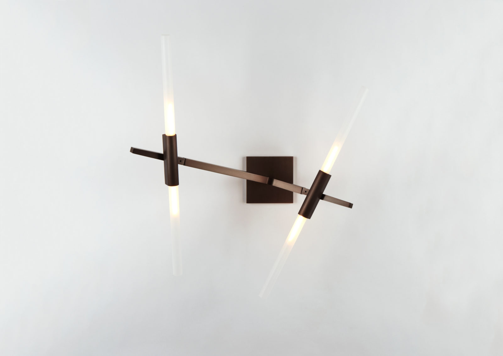 Originally conceived as a candelabra, Agnes takes its inspiration from the fictional heroine of the same name, a worker in the world's oldest profession during the 1849 California Gold Rush. The modular system would allow Agnes easy setup in her makeshift "workspace." In this version, glowing glass tubes replace the candles. Articulated joints allow the glass to be arranged in a multitude of ways.