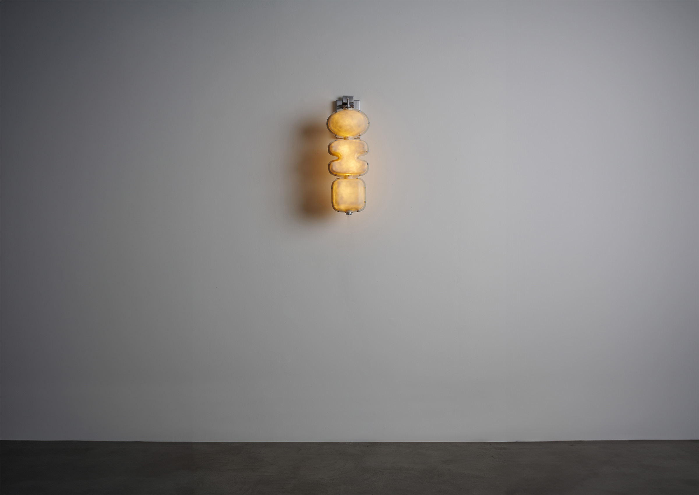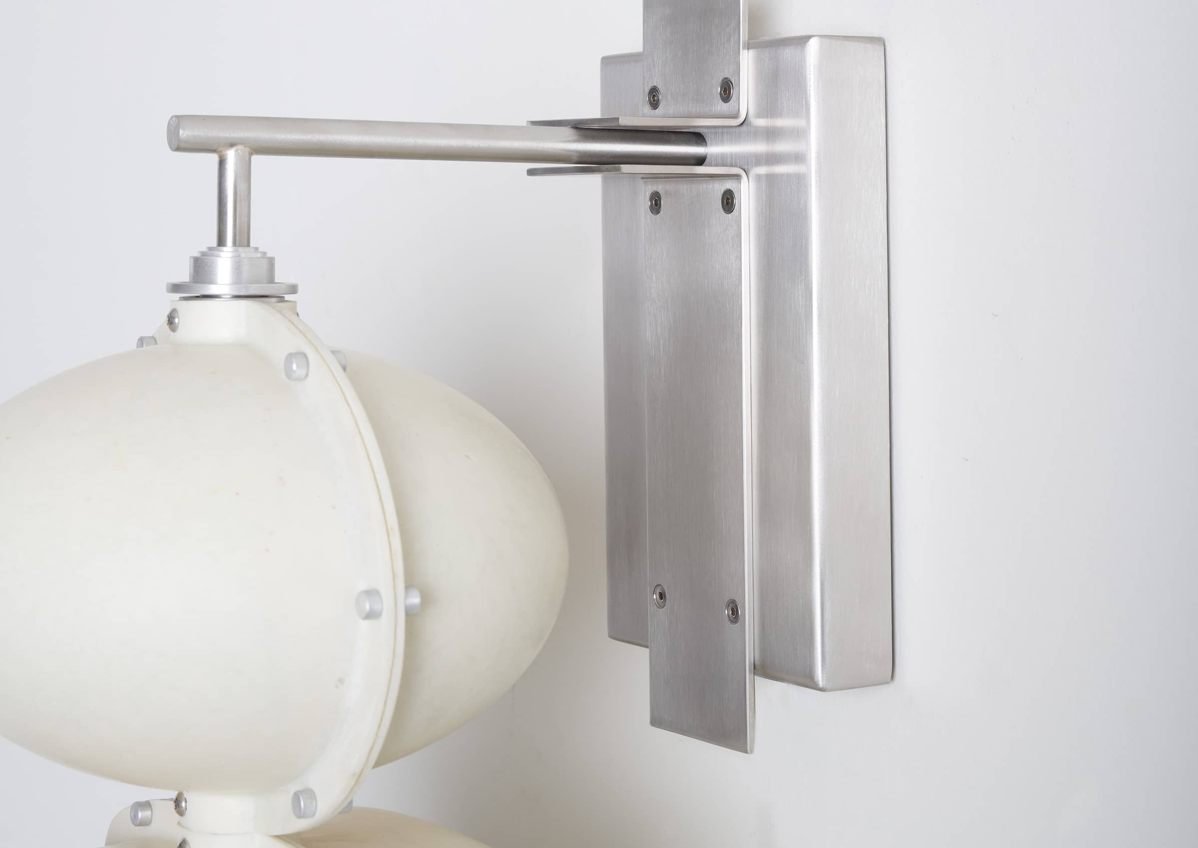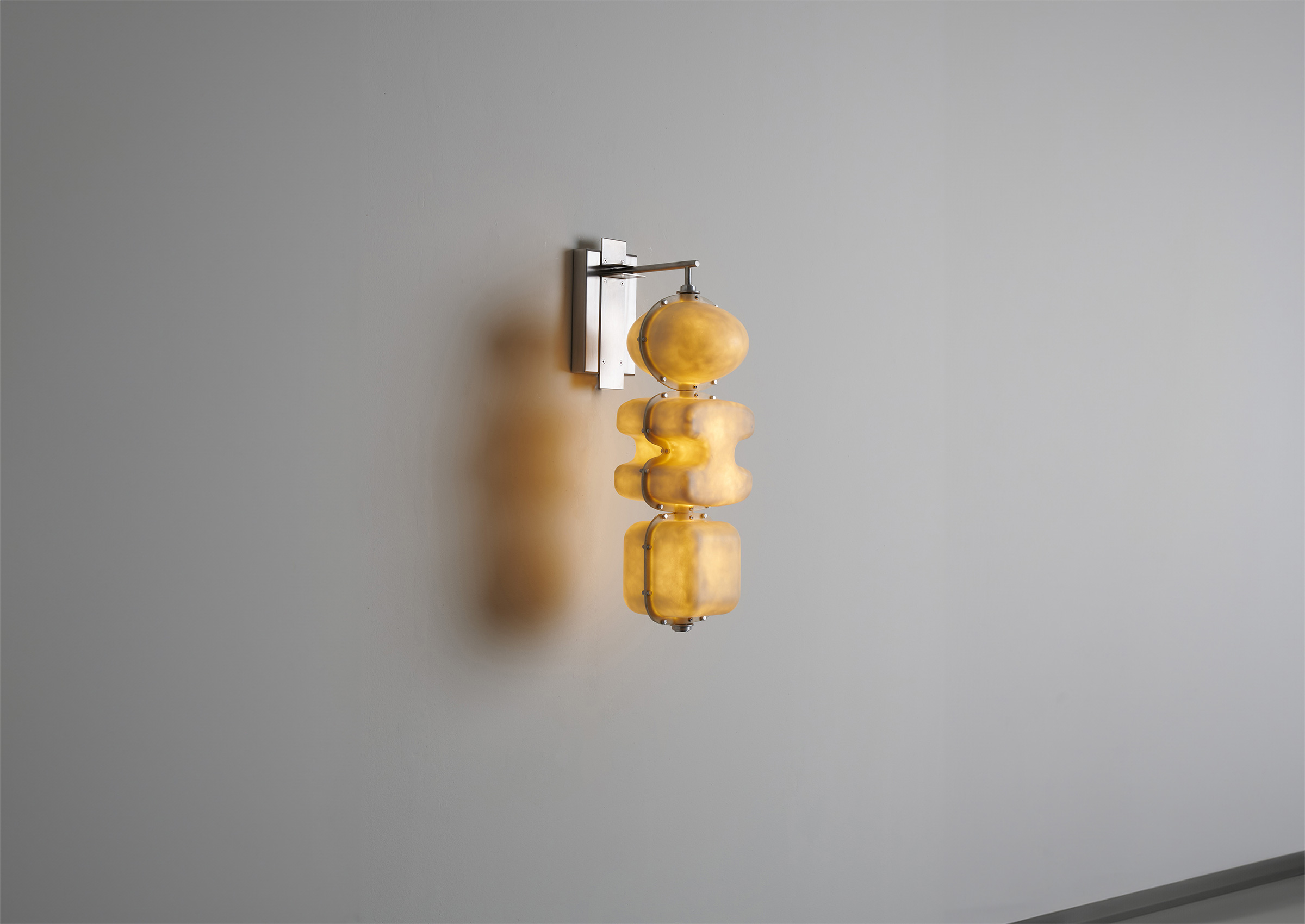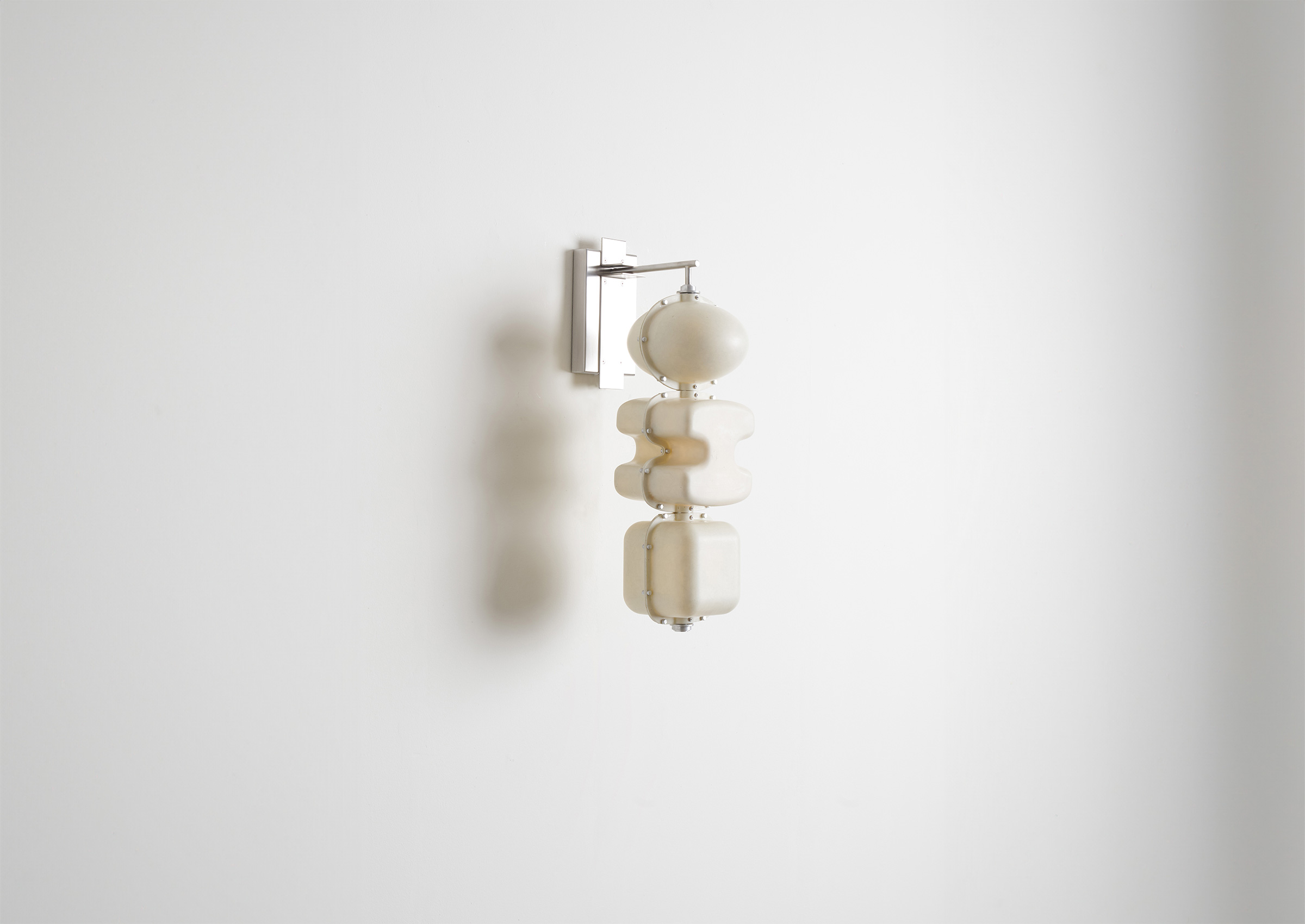 Sculptural forms are stacked along a hand-finished tube, with a central light source providing a soft, organic glow that accentuates the inherent texture of the fiberglass material. The outlines of the forms are punctuated by an aestheticized interpretation of rivets. Stainless steel structure, fiberglass shades, LED light source.