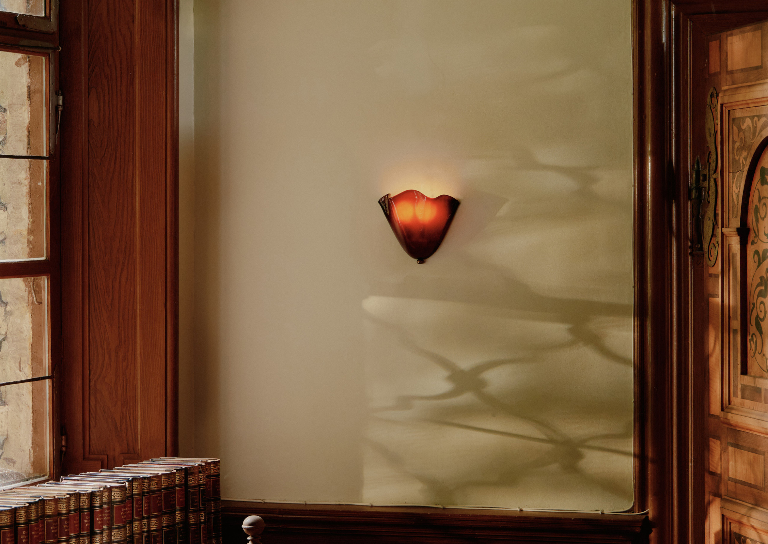 A slumped glass sconce designed to meld seamlessly into its surroundings. To create its delicate floral shape, sheets of cut glass are placed in a kiln over specially made plaster molds; as the kiln heats, gravity forces the malleable glass to drape over the molds. Fitted with hand-finished brass details and a side-by-side duo of dim-to-warm bulbs.