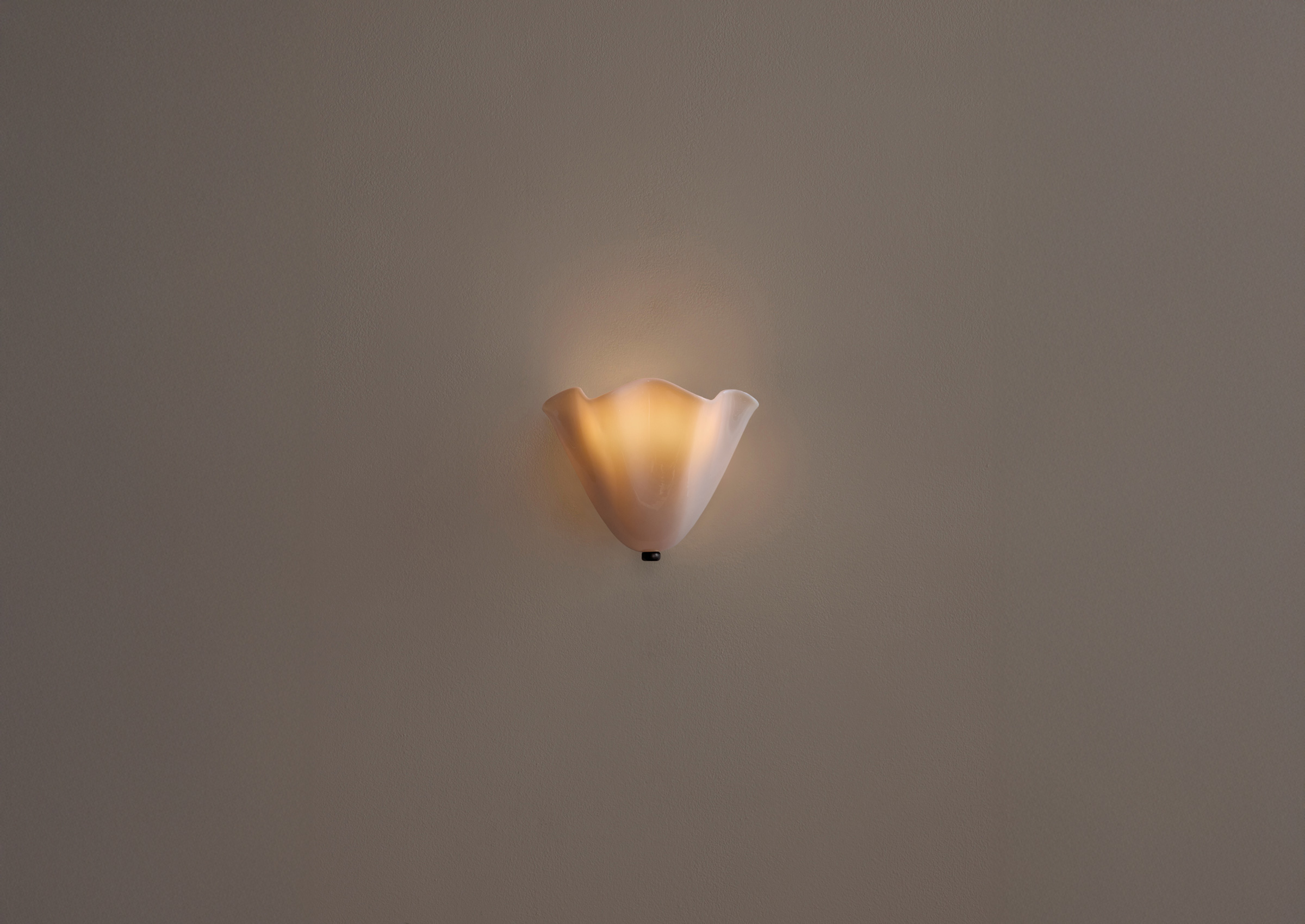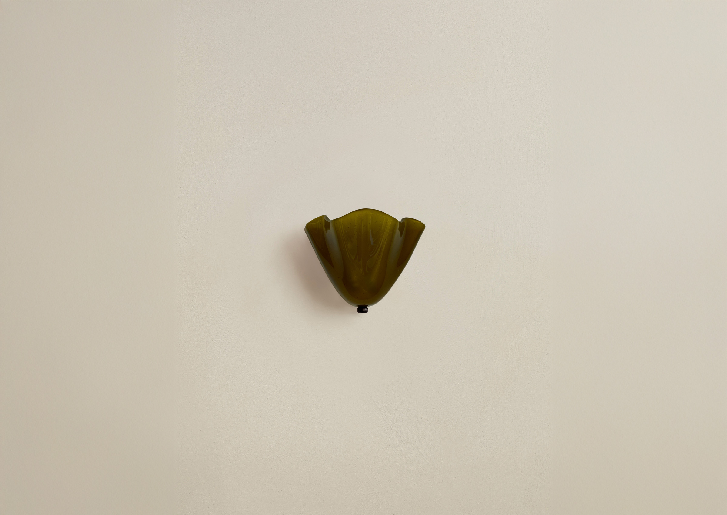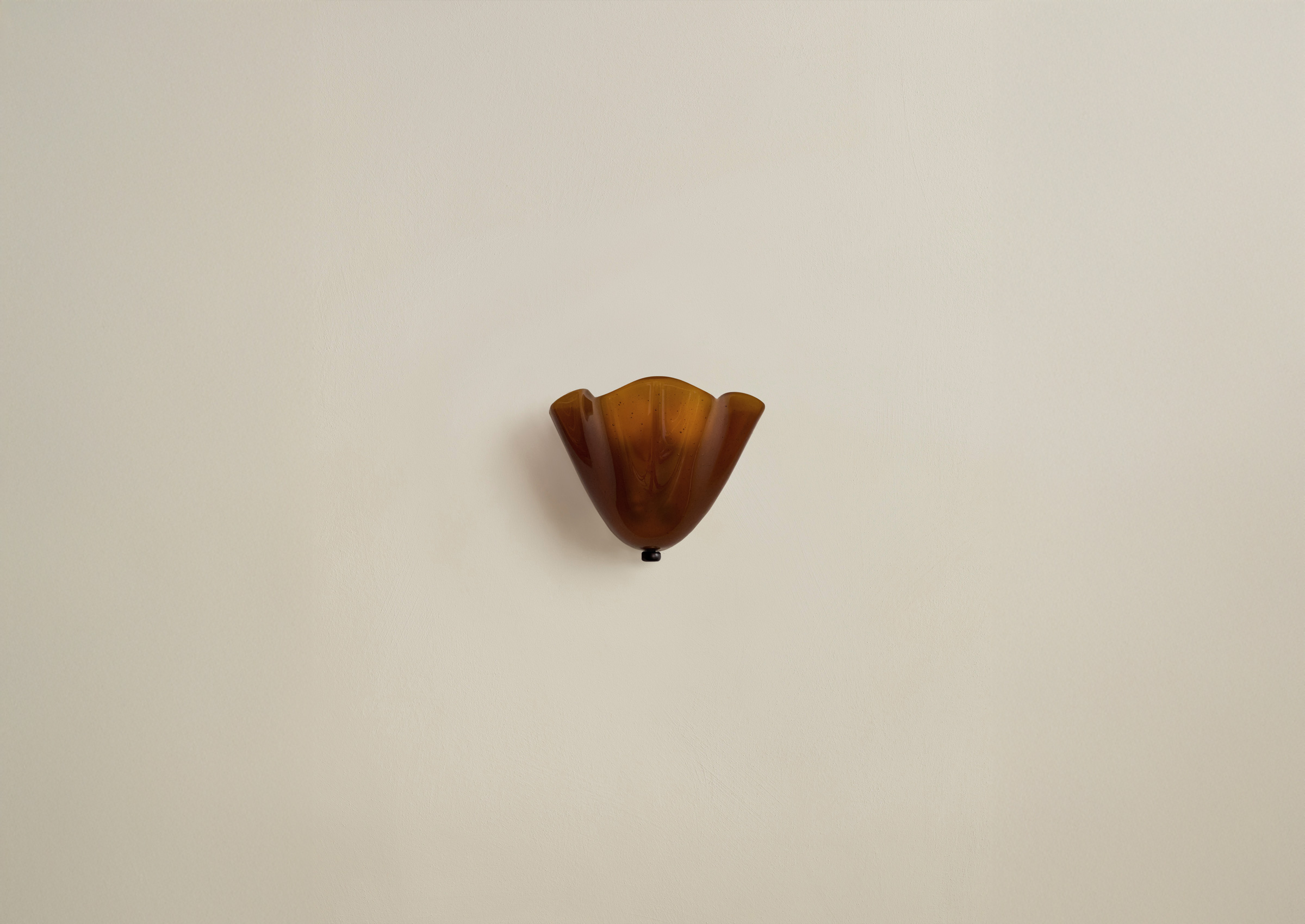 A slumped glass sconce designed to meld seamlessly into its surroundings. To create its delicate floral shape, sheets of cut glass are placed in a kiln over specially made plaster molds; as the kiln heats, gravity forces the malleable glass to drape over the molds. Fitted with hand-finished brass details and a side-by-side duo of dim-to-warm bulbs.