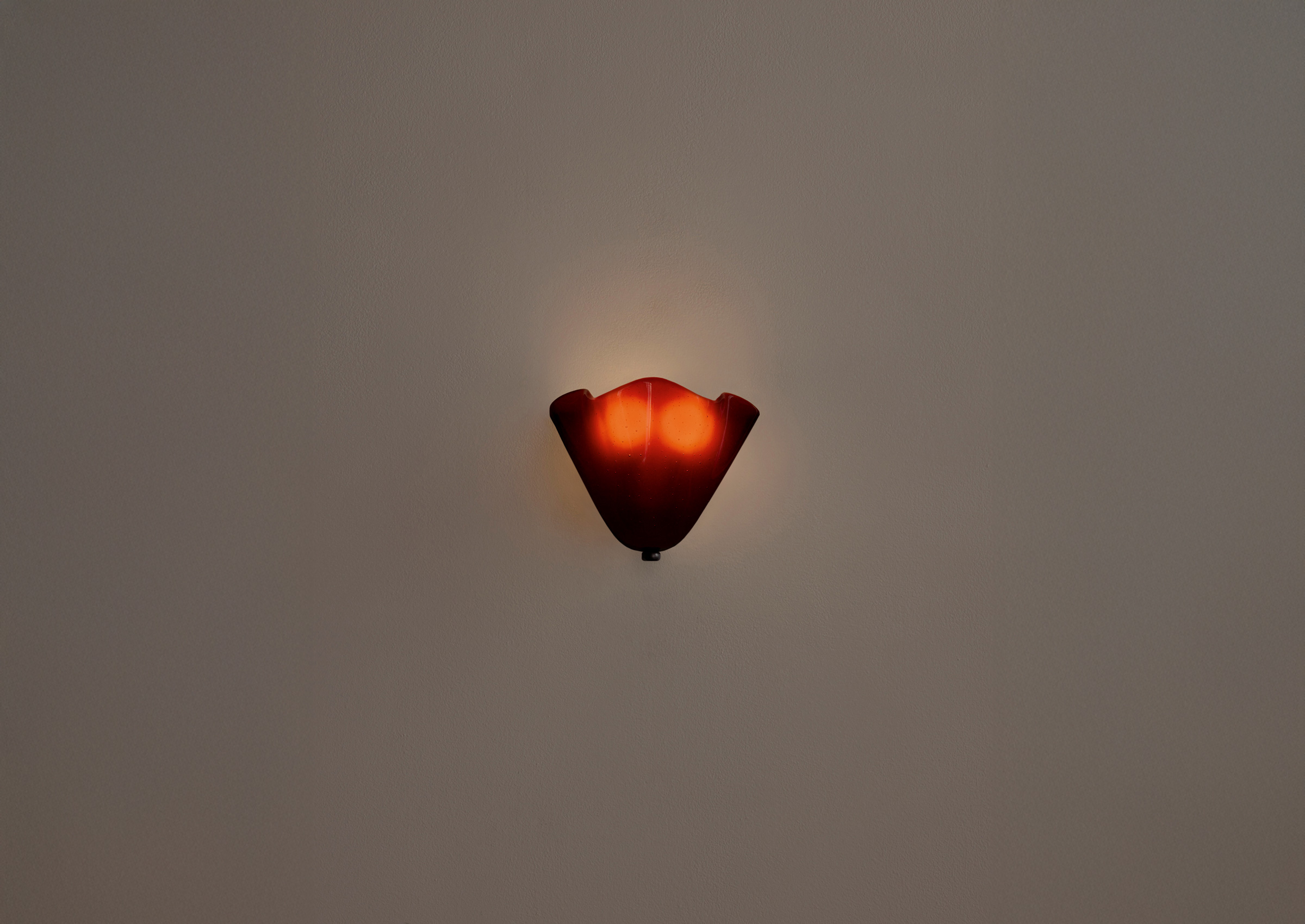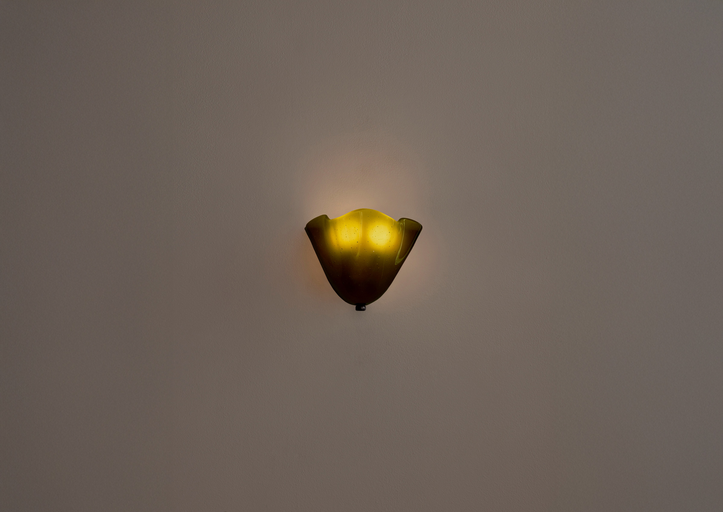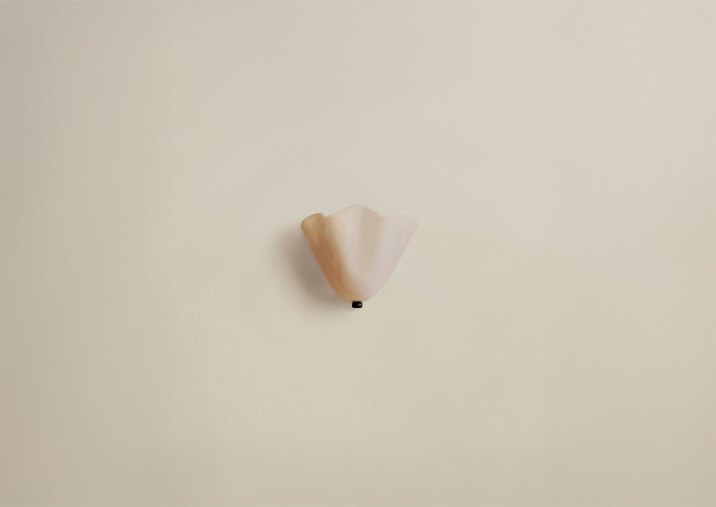 A slumped glass sconce designed to meld seamlessly into its surroundings. To create its delicate floral shape, sheets of cut glass are placed in a kiln over specially made plaster molds; as the kiln heats, gravity forces the malleable glass to drape over the molds. Fitted with hand-finished brass details and a side-by-side duo of dim-to-warm bulbs.