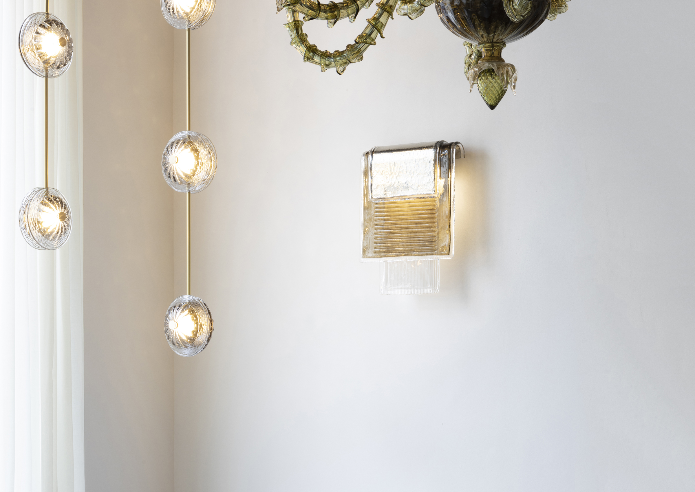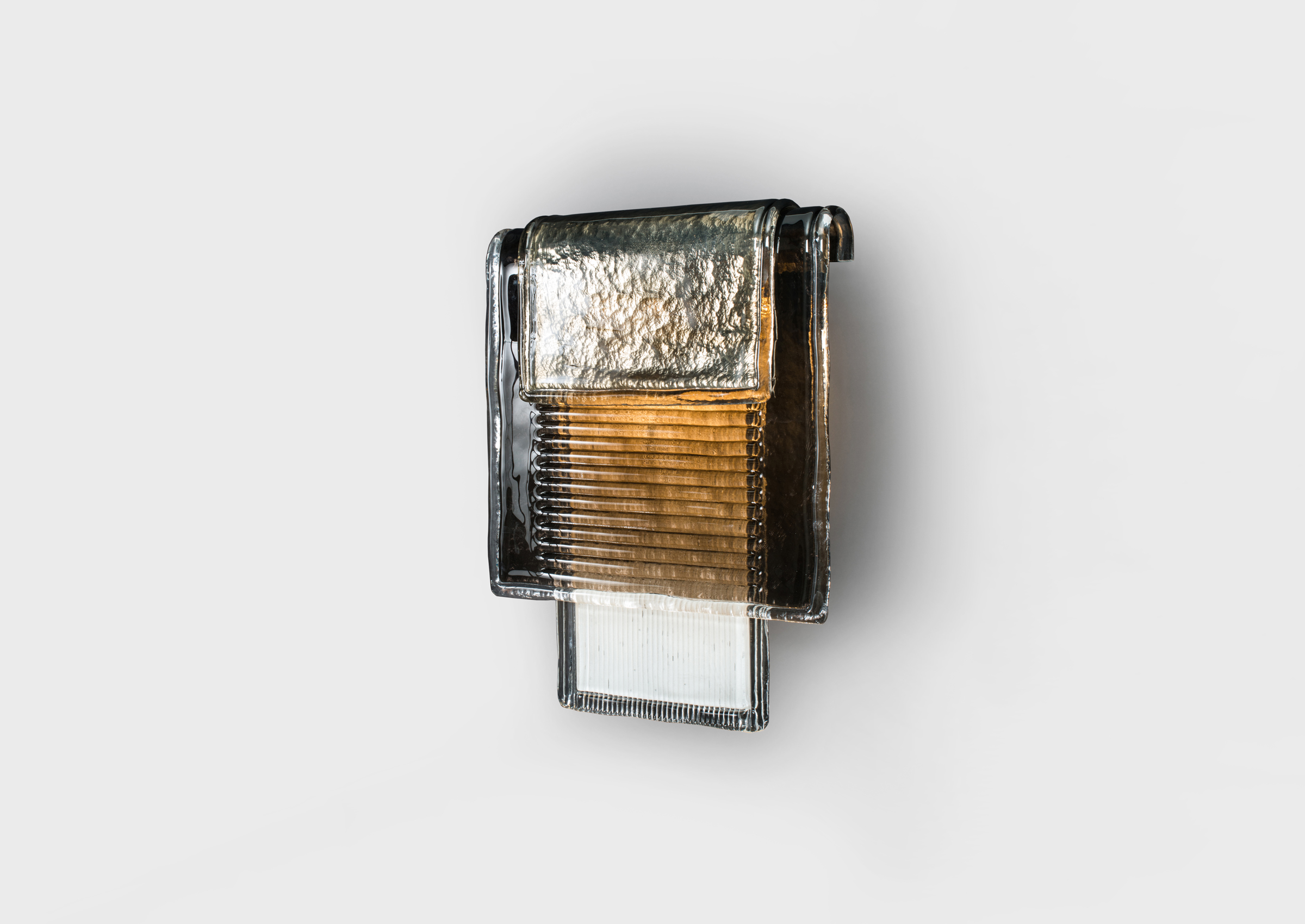 YSA is the interplay of complementary, yet diverse, Murano glass techniques, textures and colors. The design's simple shape masks its intricate game of contrasts and the endless details. YSA is a collection of three overlapping sheets of Murano glass, each of which has its own unique attribute. The top smaller layer is of streaked frosted crystal Murano glass. The second layer is smoked Murano glass with a stripe motif applied under heat. The third layer is a Murano glass with an application of mirror. Further adding to the details of each sheet is a soft crystal border outlining each one like a well-tailored hem.