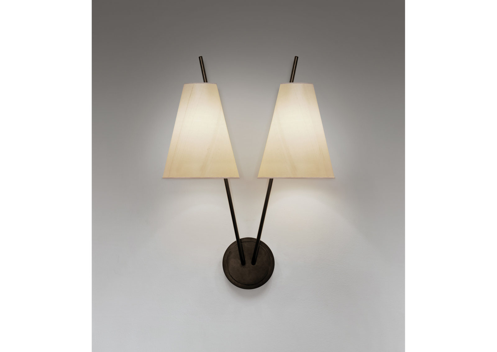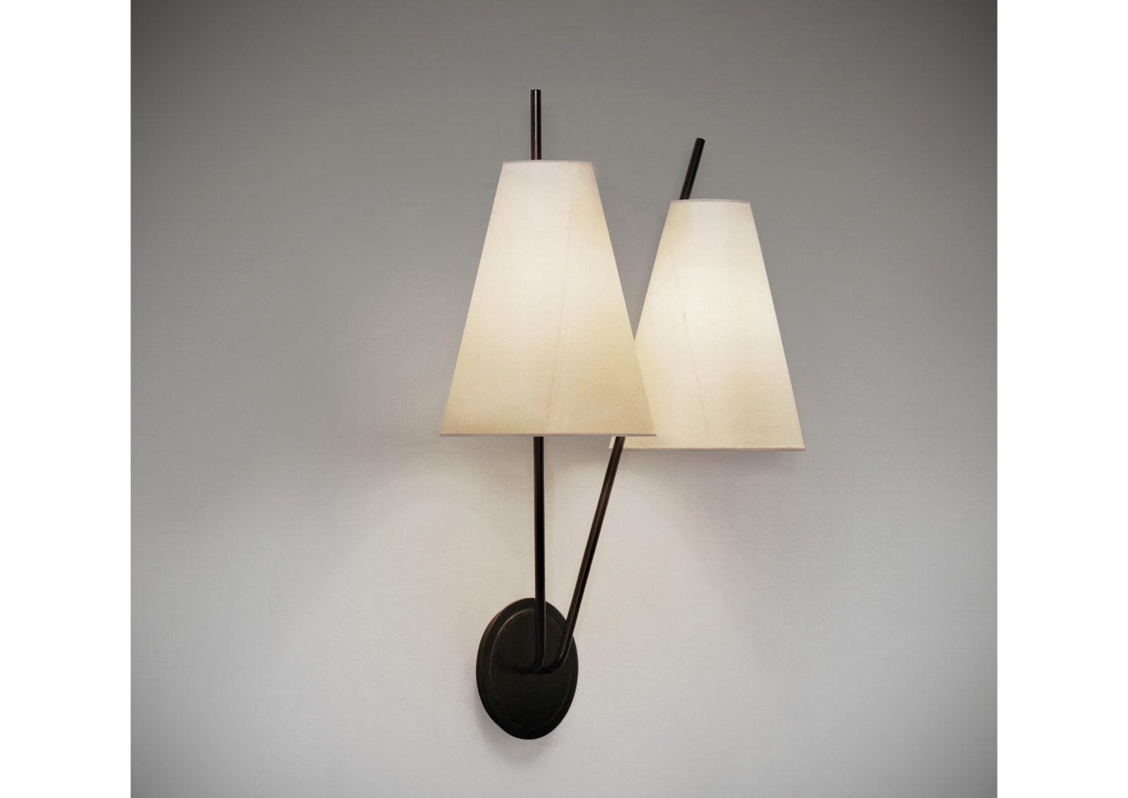 Conceived by J.T. Kalmar for anterooms, corridors, or as accent lighting, this early-1950s double sconce produces soft ambient and downlight. Two shades are finished in natural, textured silk. The milled brass wall plate and arms can be specified in one of four finishes: polished brass, black bronze, matte black lacquer, or polished nickel.