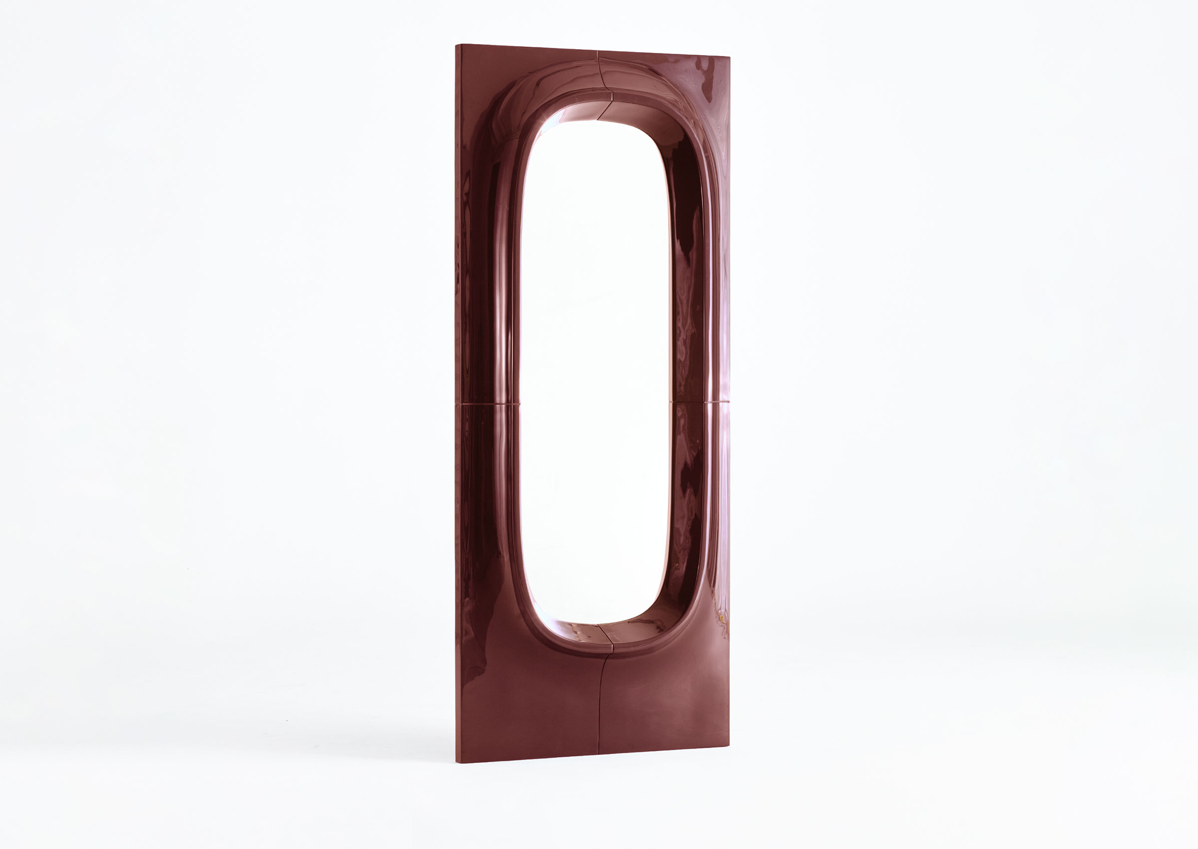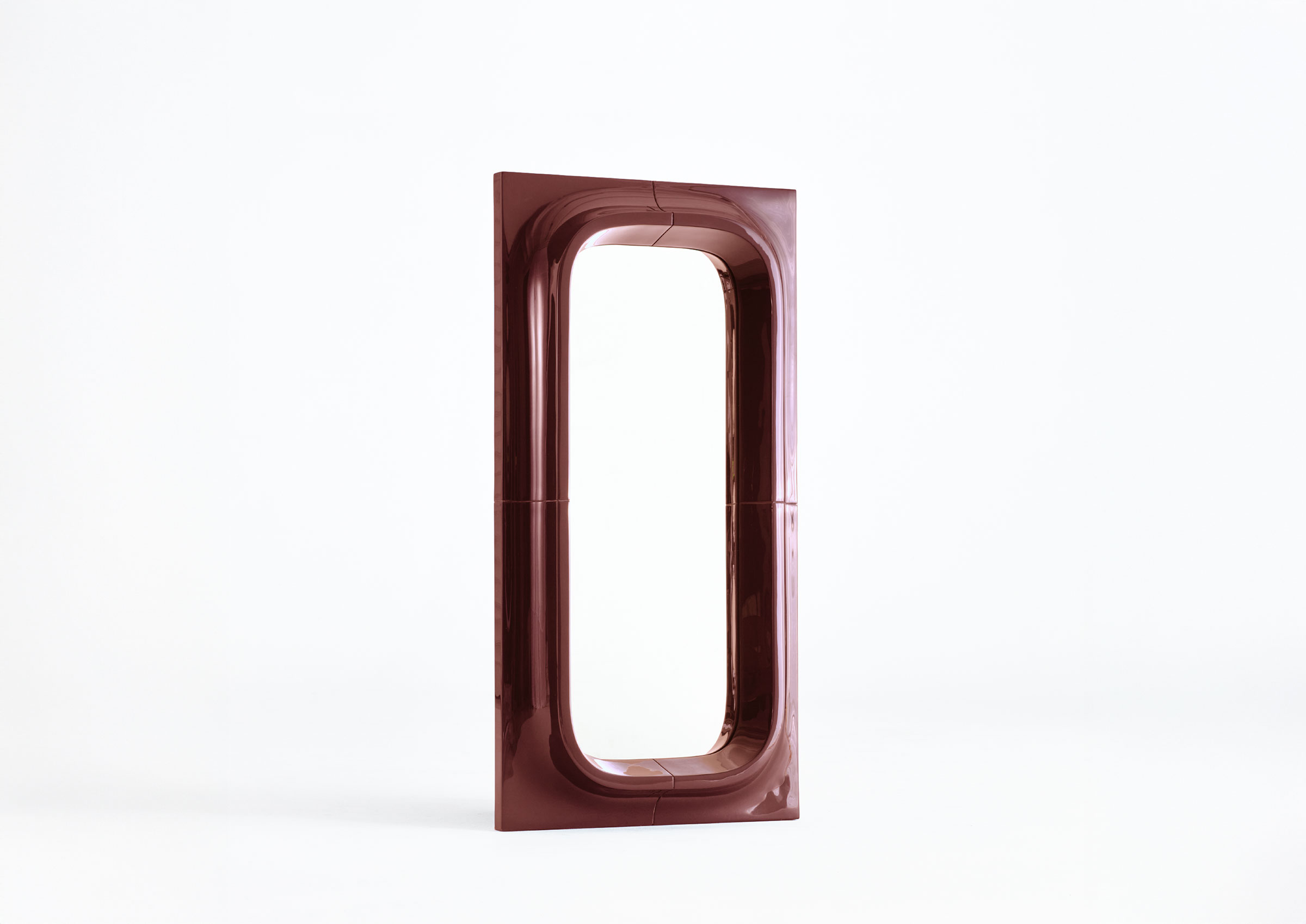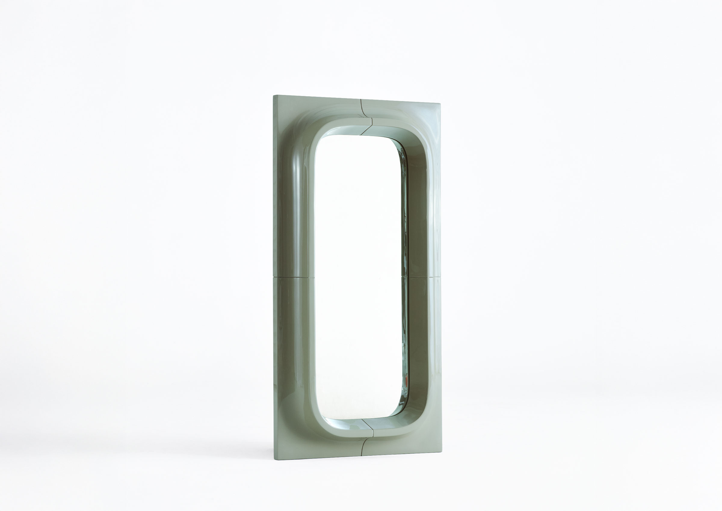 The Porthole Mirror is designed by Willo Perron for NO GA. It’s part of a collection based on the idea of modularity which features six tables and two mirrors in different sizes that can be combined in various configurations. Each Porthole Mirror is meticulously handcrafted by master artisans using fiberglass, which is first cast in molds and then manually coated and polished multiple times to achieve different high-gloss finishes. The Porthole Mirrors come in five colors; white, brown, green, red and anthracite.