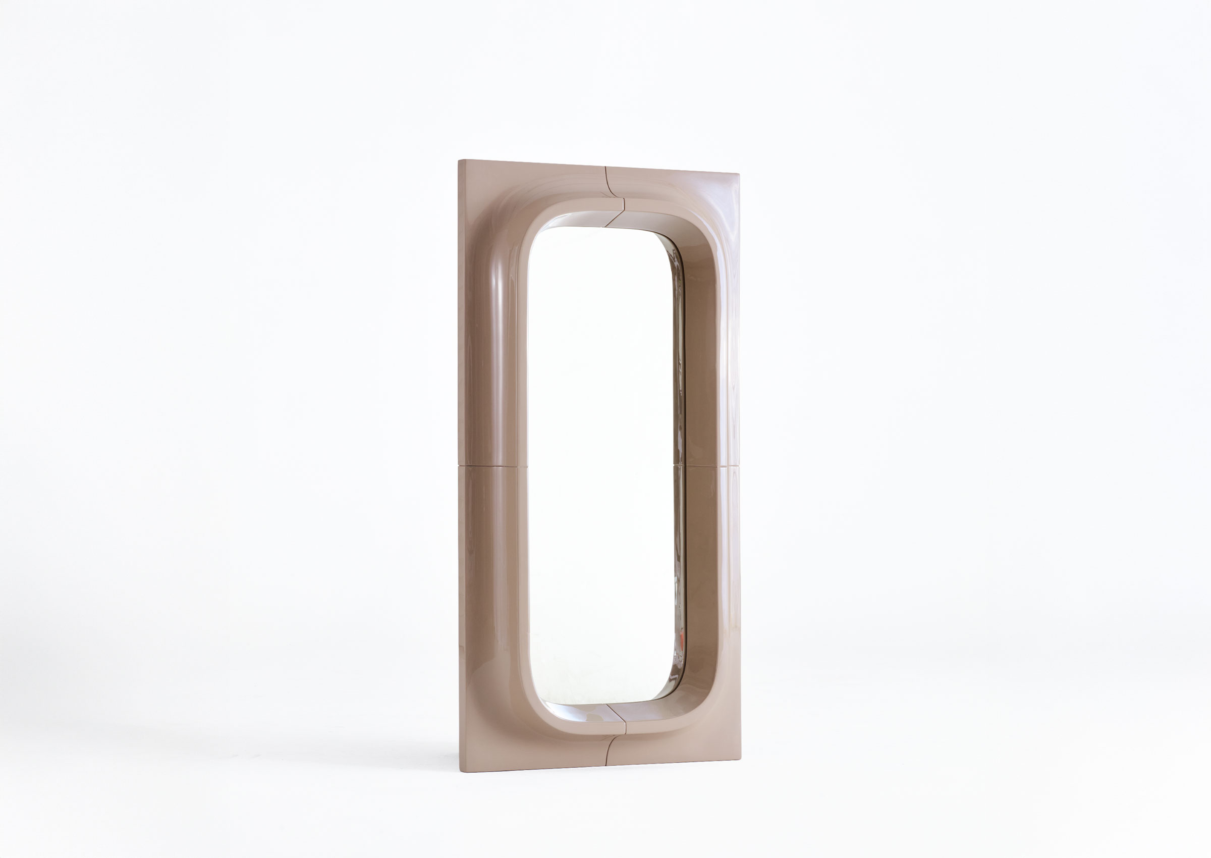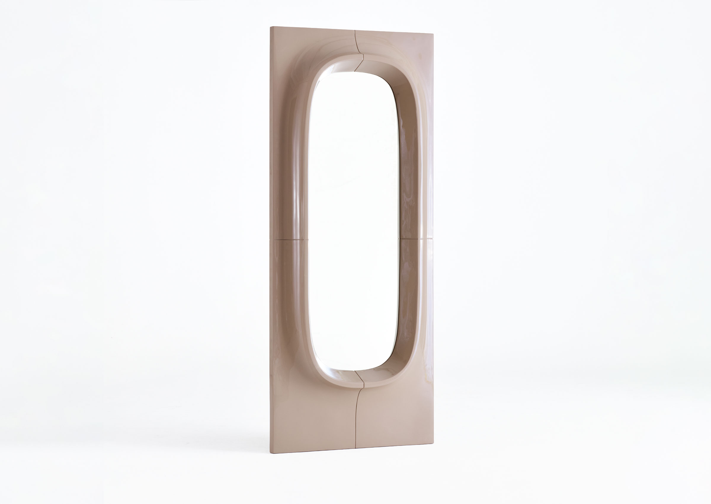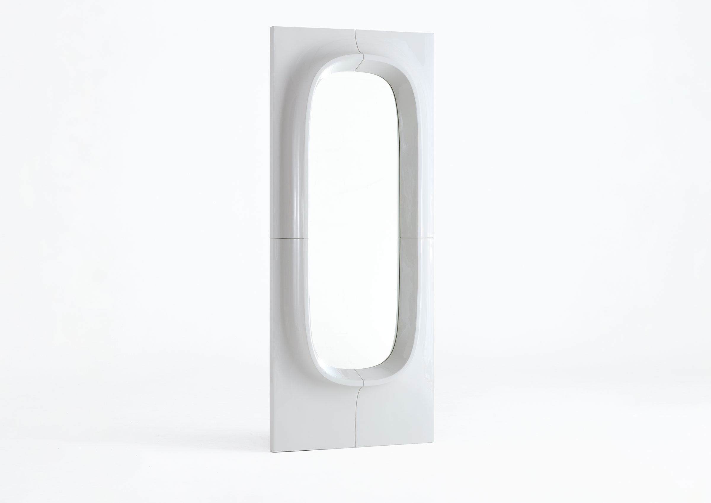 The Porthole Mirror is designed by Willo Perron for NO GA. It’s part of a collection based on the idea of modularity which features six tables and two mirrors in different sizes that can be combined in various configurations. Each Porthole Mirror is meticulously handcrafted by master artisans using fiberglass, which is first cast in molds and then manually coated and polished multiple times to achieve different high-gloss finishes. The Porthole Mirrors come in five colors; white, brown, green, red and anthracite.
