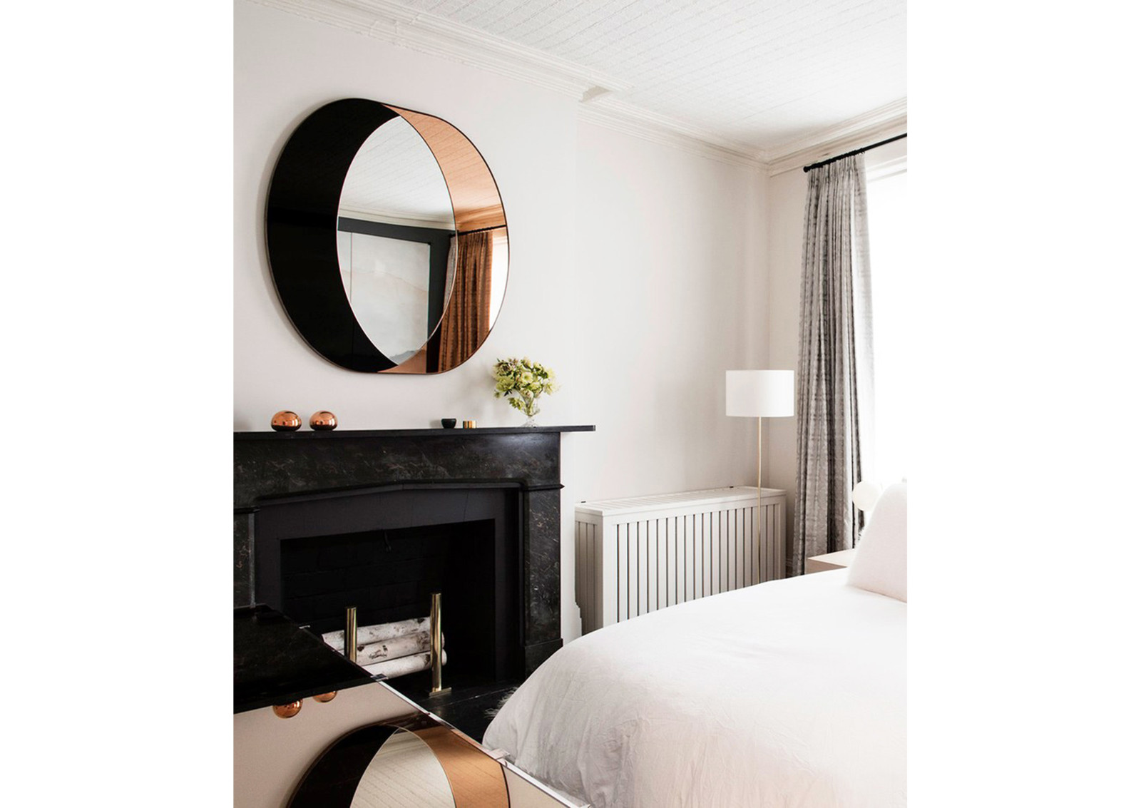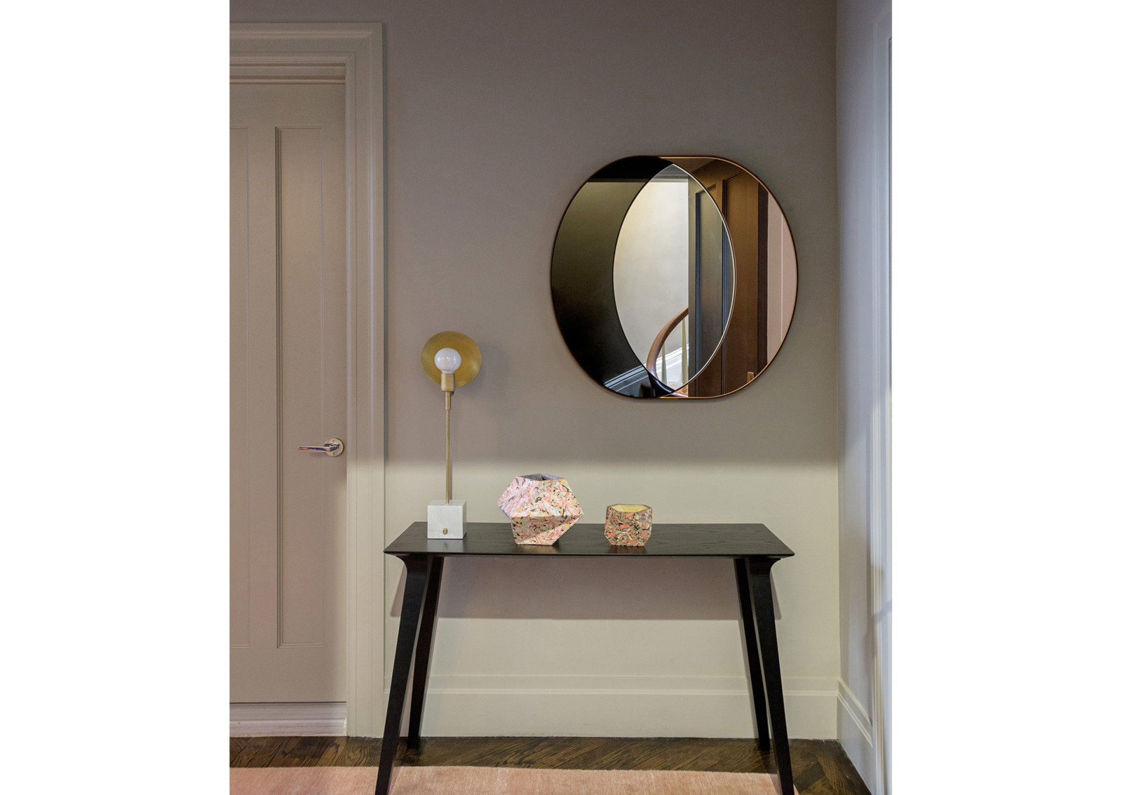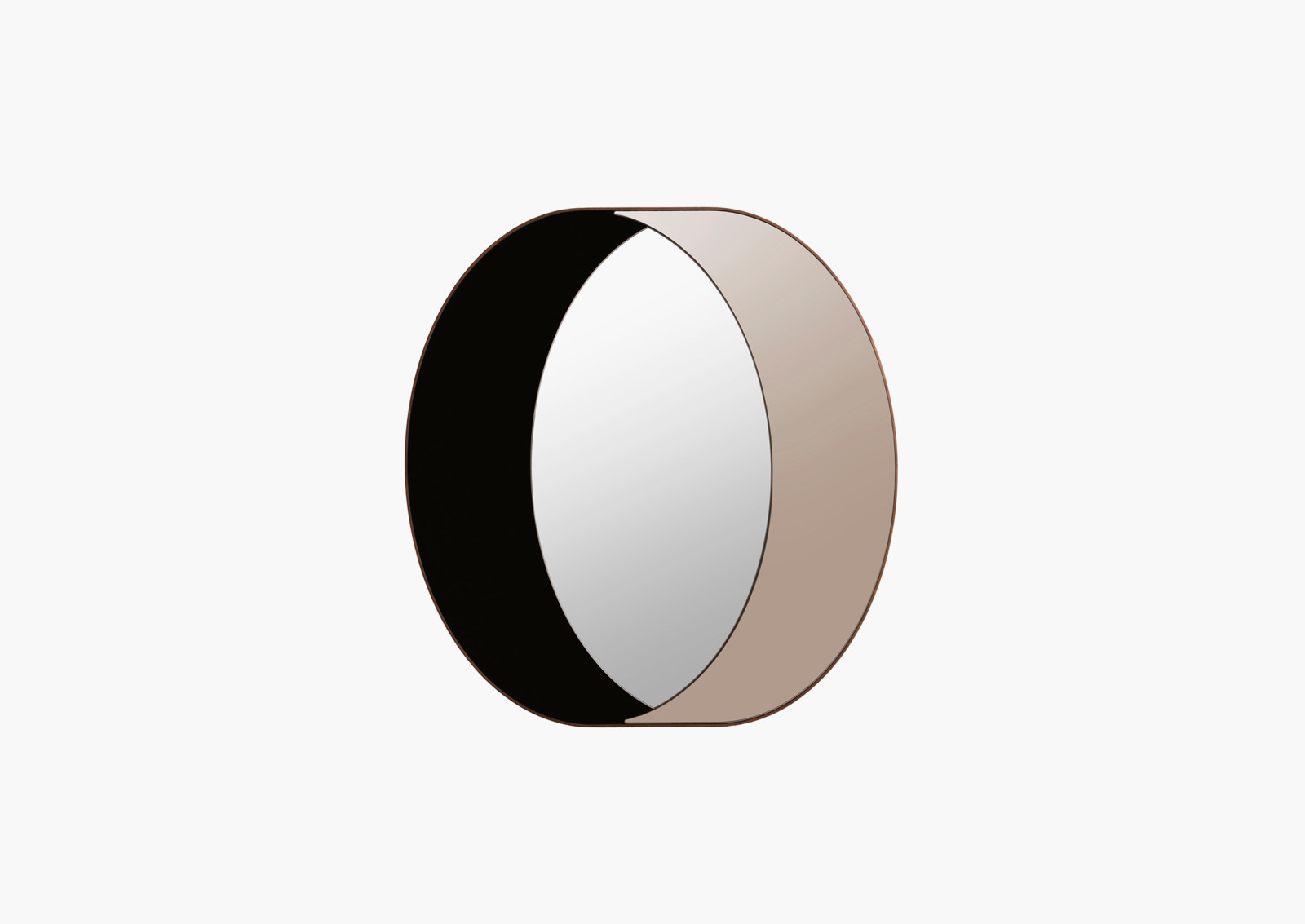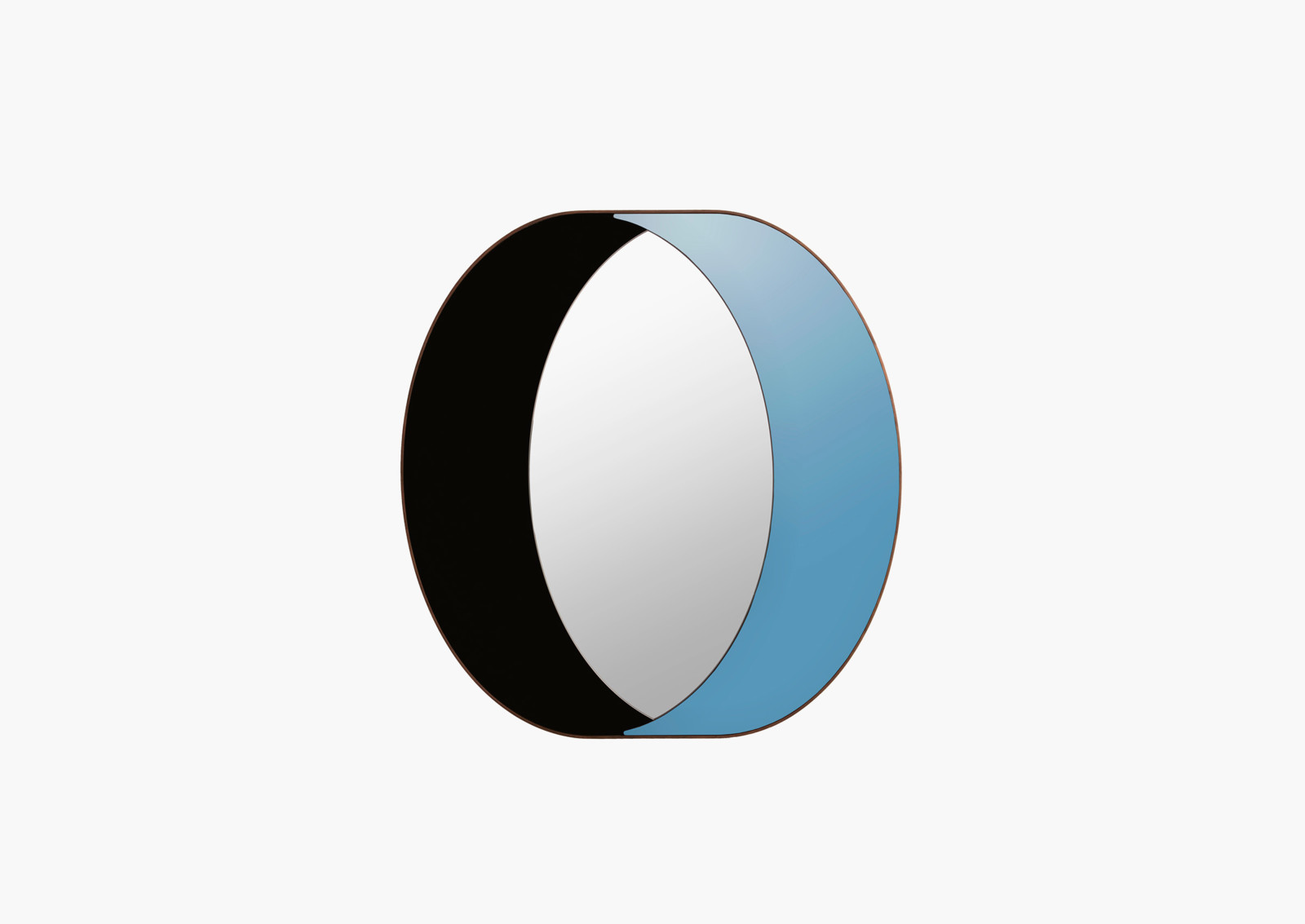 Three different colors of tinted mirror are arranged to give the illusion of a three-dimensional ring. The clear center mirror makes the piece both a functional and decorative addition to any space.
