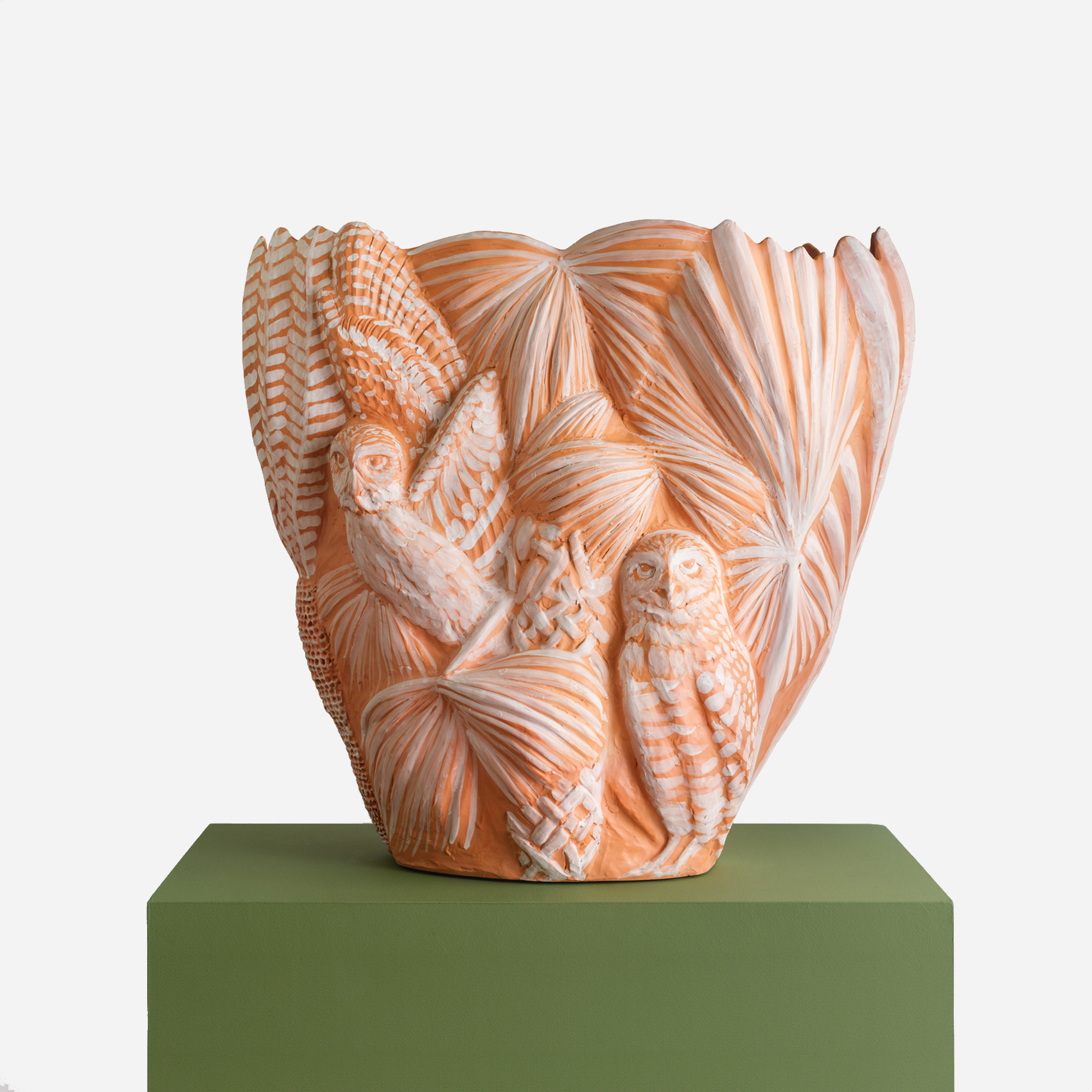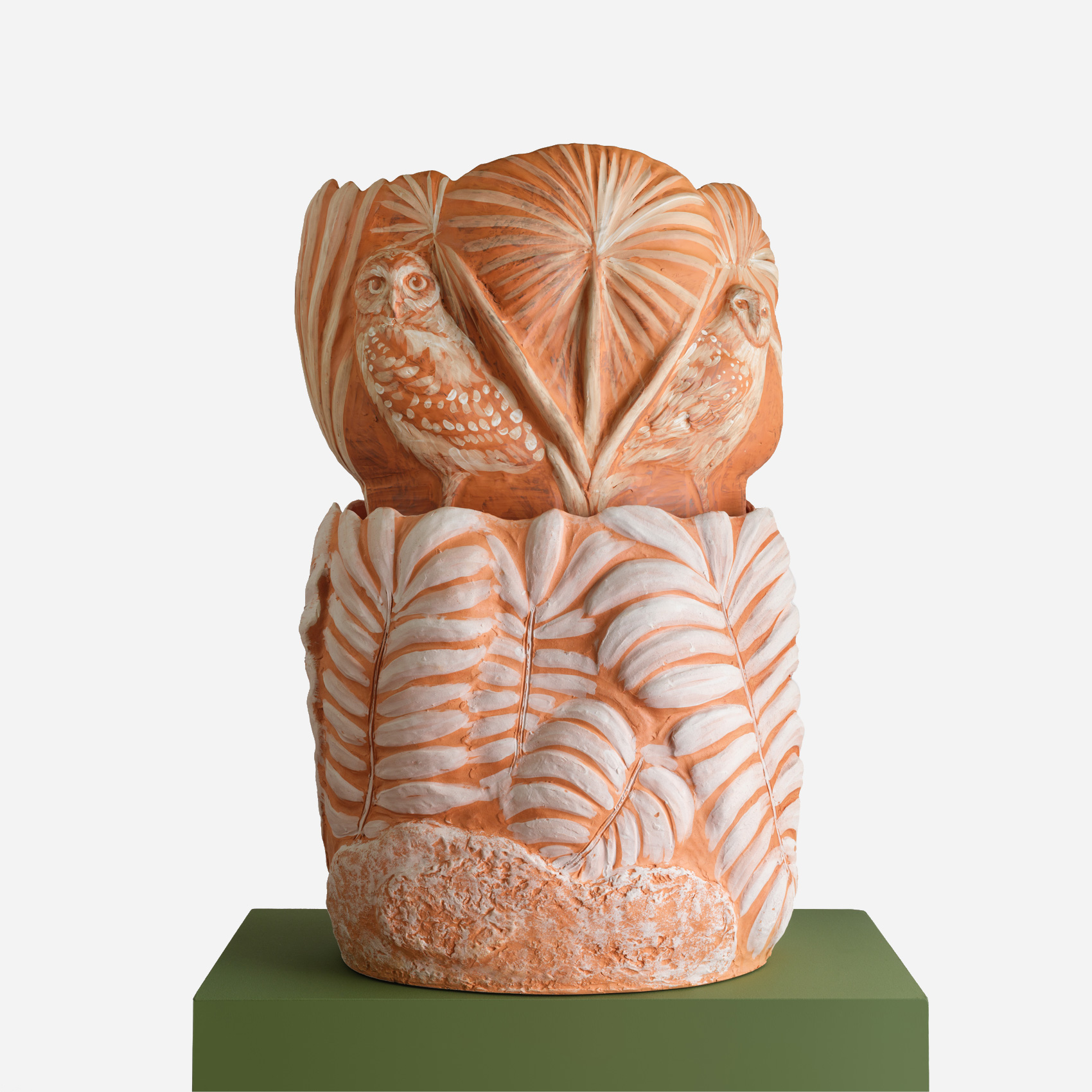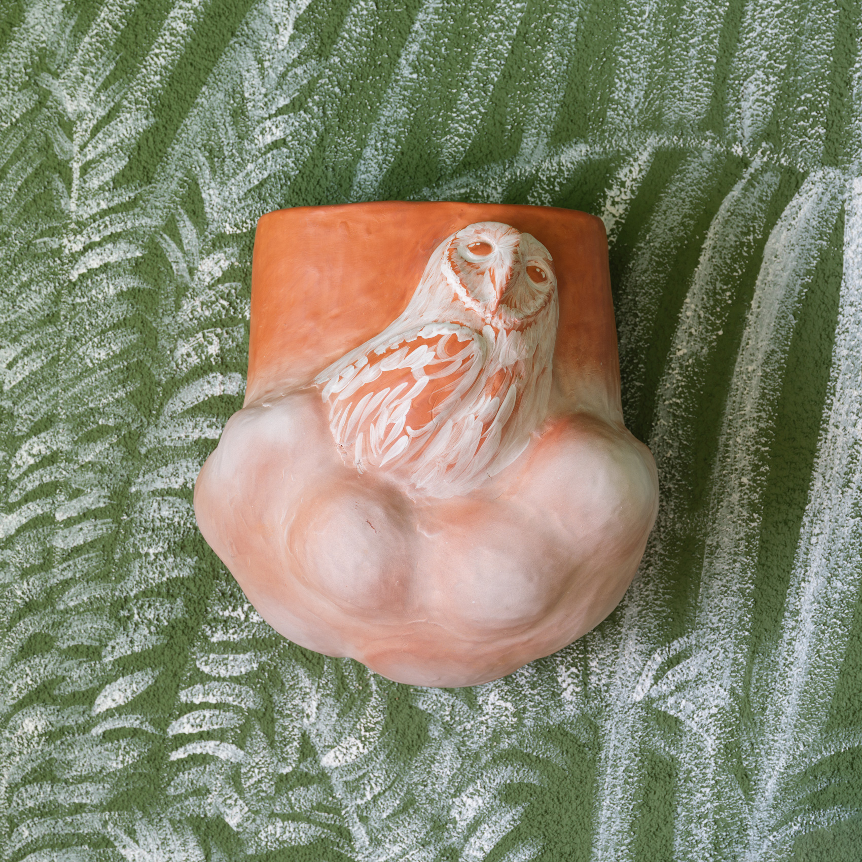 Myungjin Kim’s Hoot & Bloom series explores the artist’s renowned exploration of owls as both an iconographic archetype and an ecological specificity. Rendered in terracotta and possessing a delicate range of color, these works are airy but substantial, presenting a poetic understanding of our world and the place of life within it.