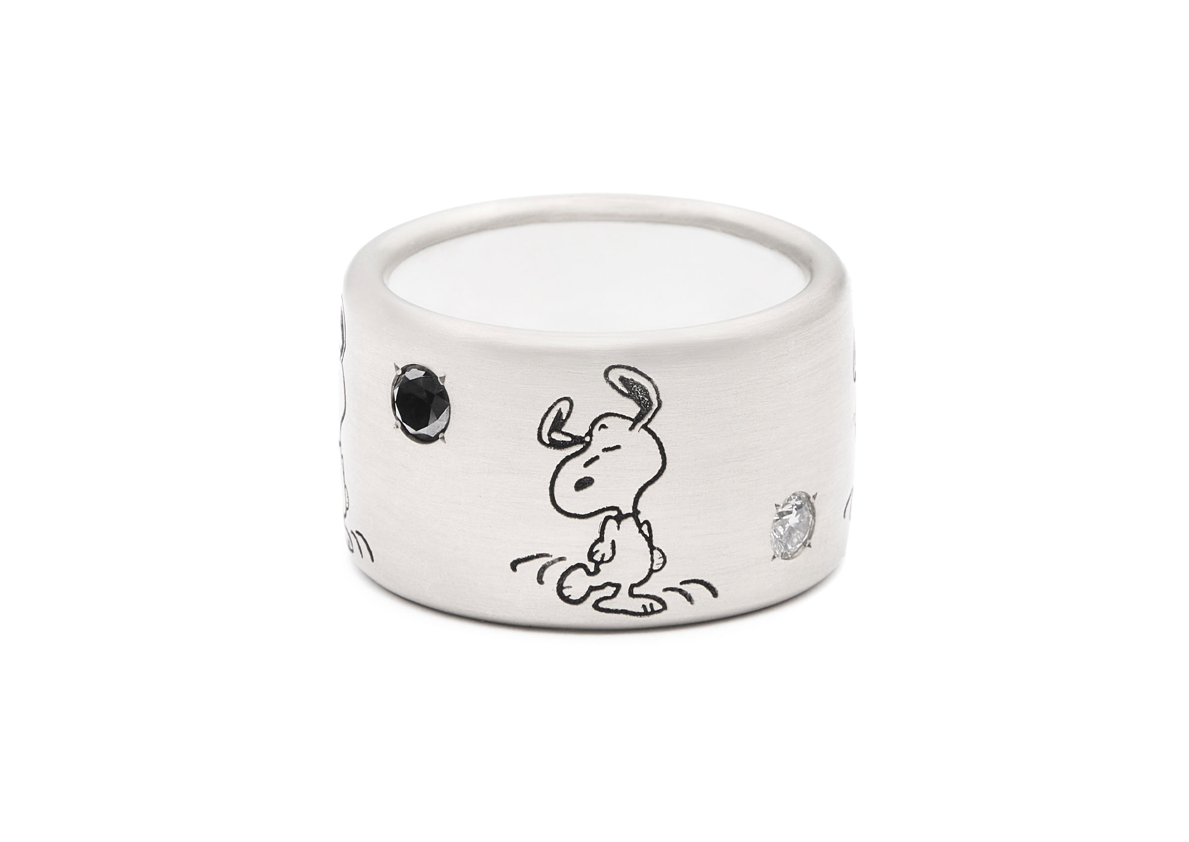 White and black diamonds create a lively rhythm across the polished white gold band.