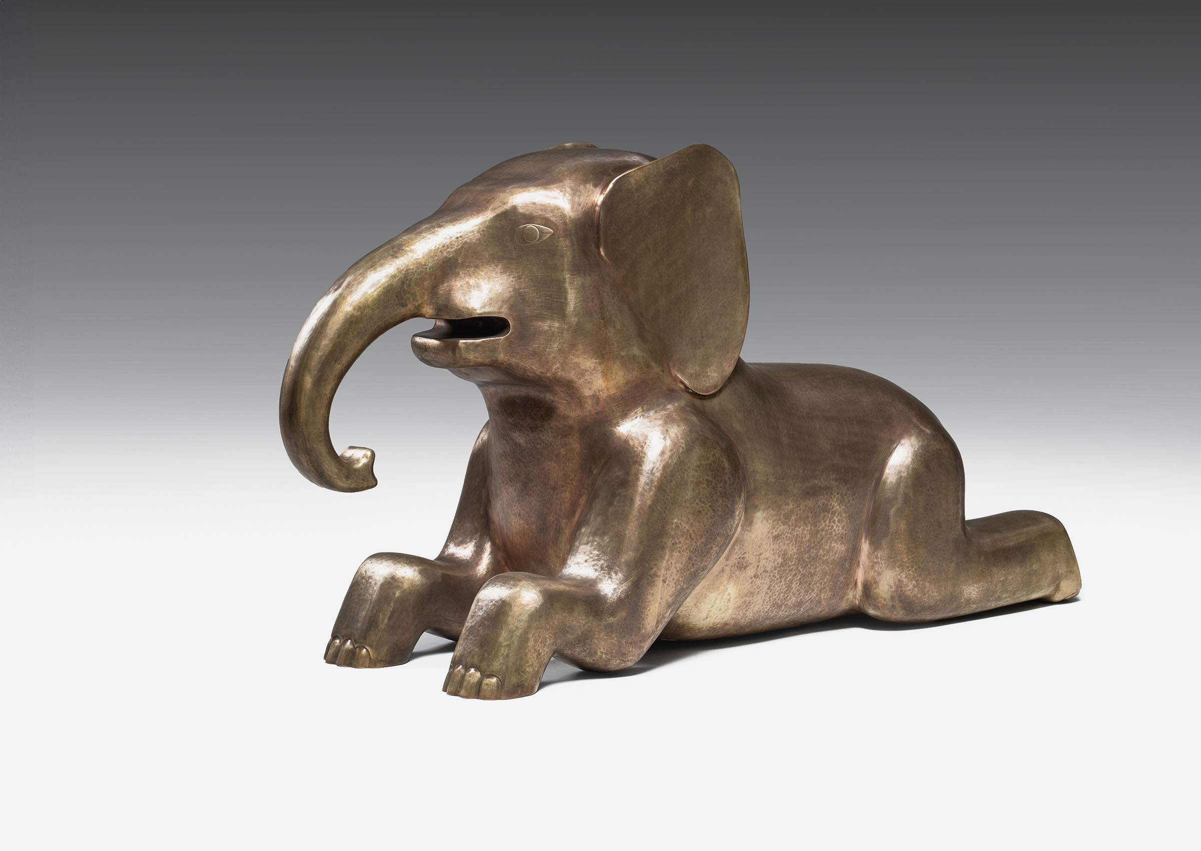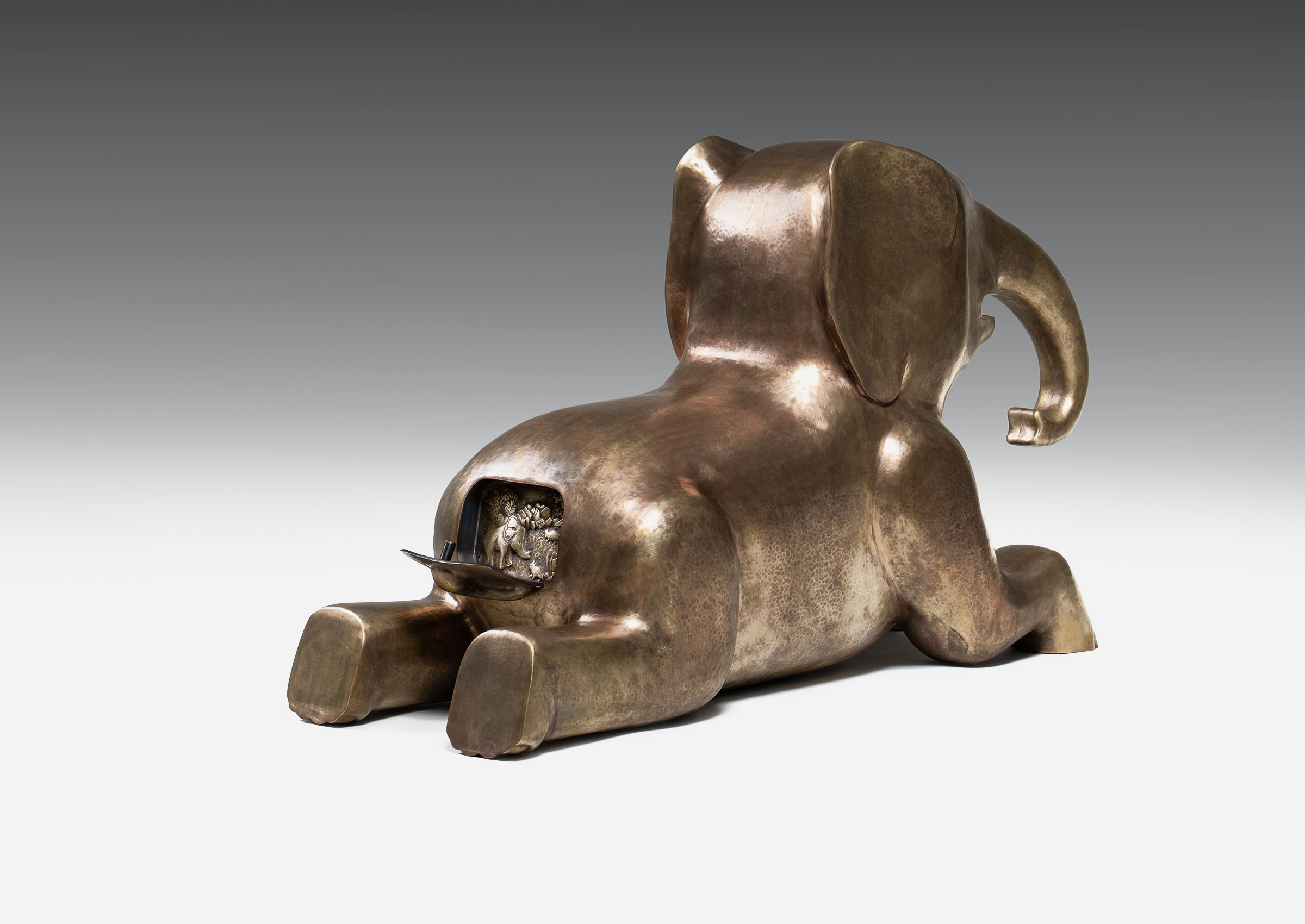From the tranquil forests of India, a baby elephant sits at ease — playful, unguarded, and full of spirit. In Indian lore, young elephants symbolize harmony, carrying within them a gentleness that reflects nature’s balance: innocence holding its own alongside strength. This infant becomes a playful seating, both inviting and lighthearted. Hidden within its sculpted body lies a Panchatantra fable — the tale of the Mice and the Elephant — where kindness begets kindness, proving that no act of compassion is ever too small to matter. Crafted in brass through a union of hollowed joinery and intricate repoussé, the baby elephant blends play with purpose.