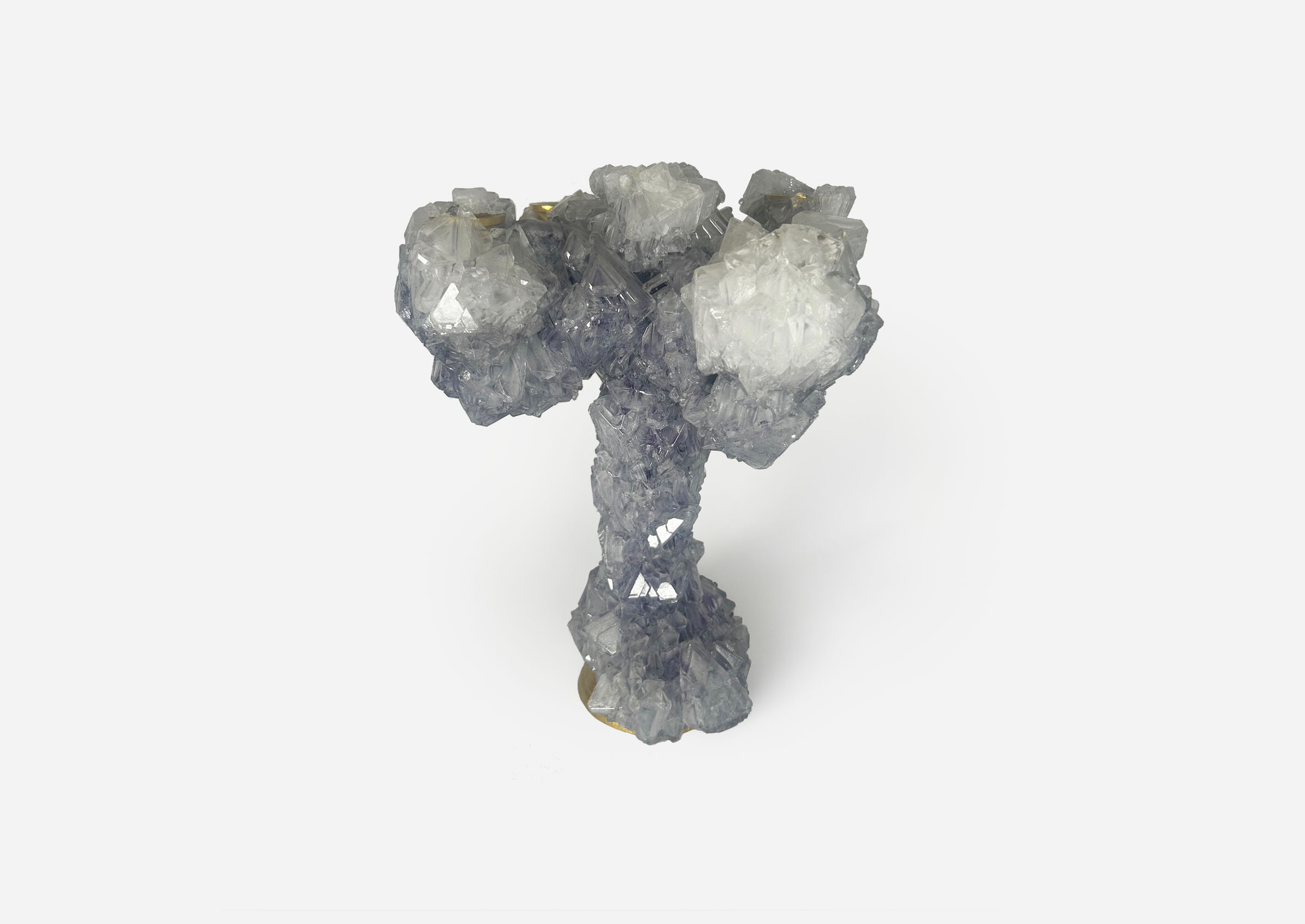 Atelier Mark Sturkenboom designed a fluid, based on minerals, which allows objects to grow crystals over a period of time. He reclaimed antique French chandeliers and candelabra and created the perfect conditions to set a hyper-evolution in motion where every object grows out to be a unique piece, a modern interpretation of a crystal chandelier. These pieces are part of Sturkenboom’s ongoing fascination of the influence that hyper-deterioration has on modern life, glimpsing in the future.