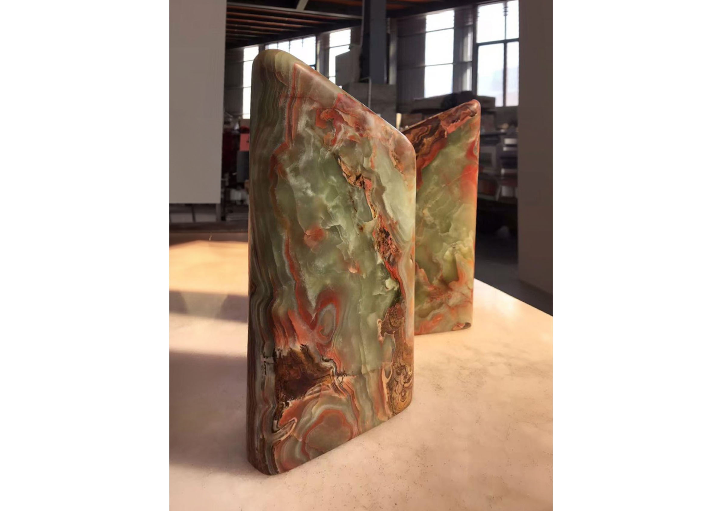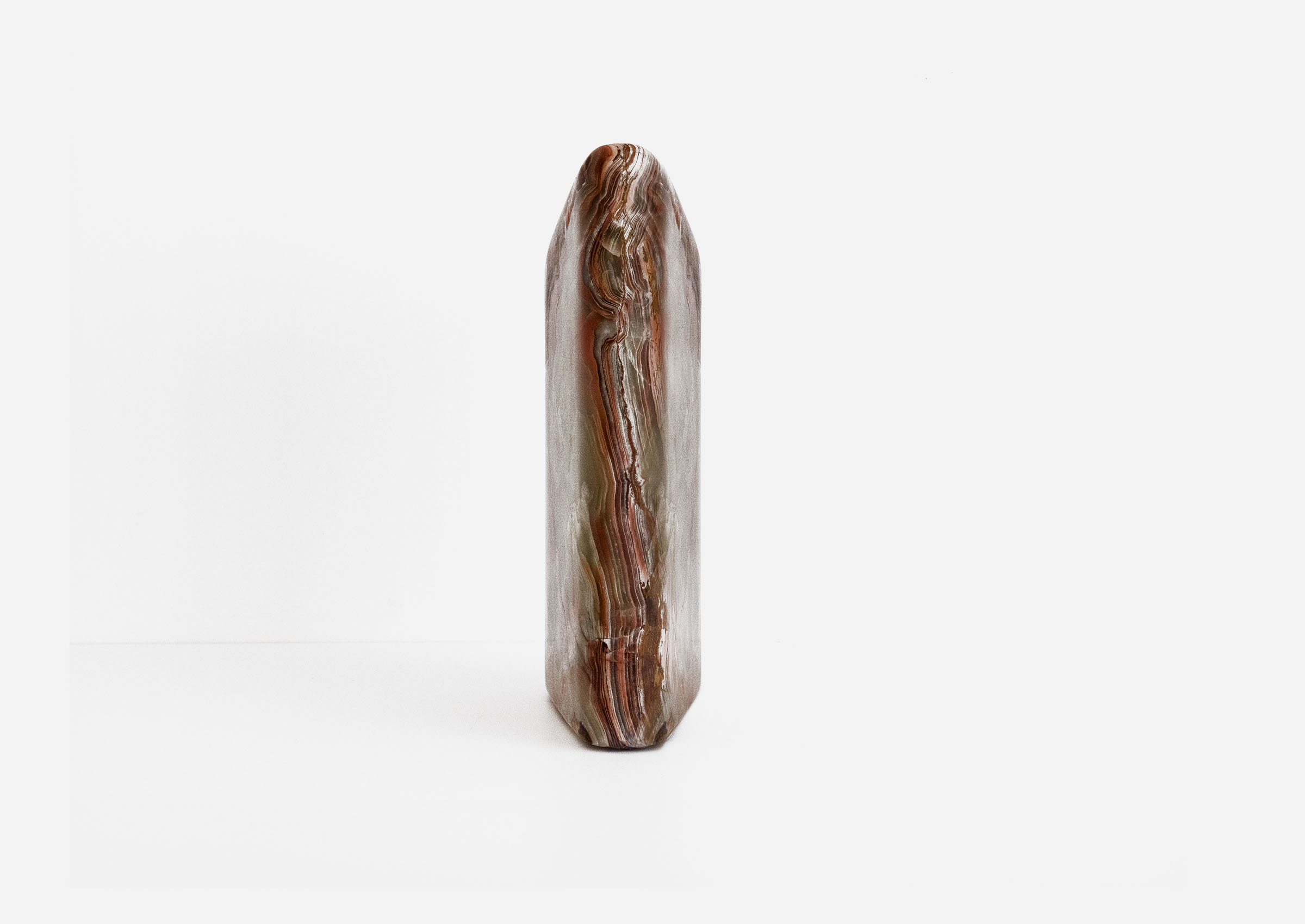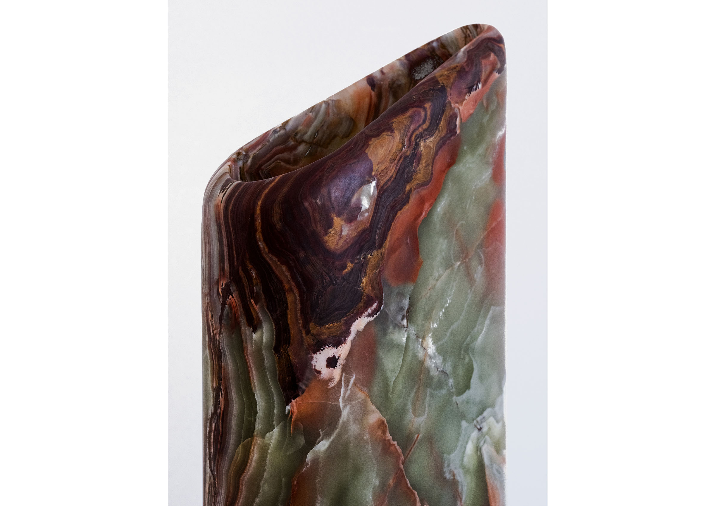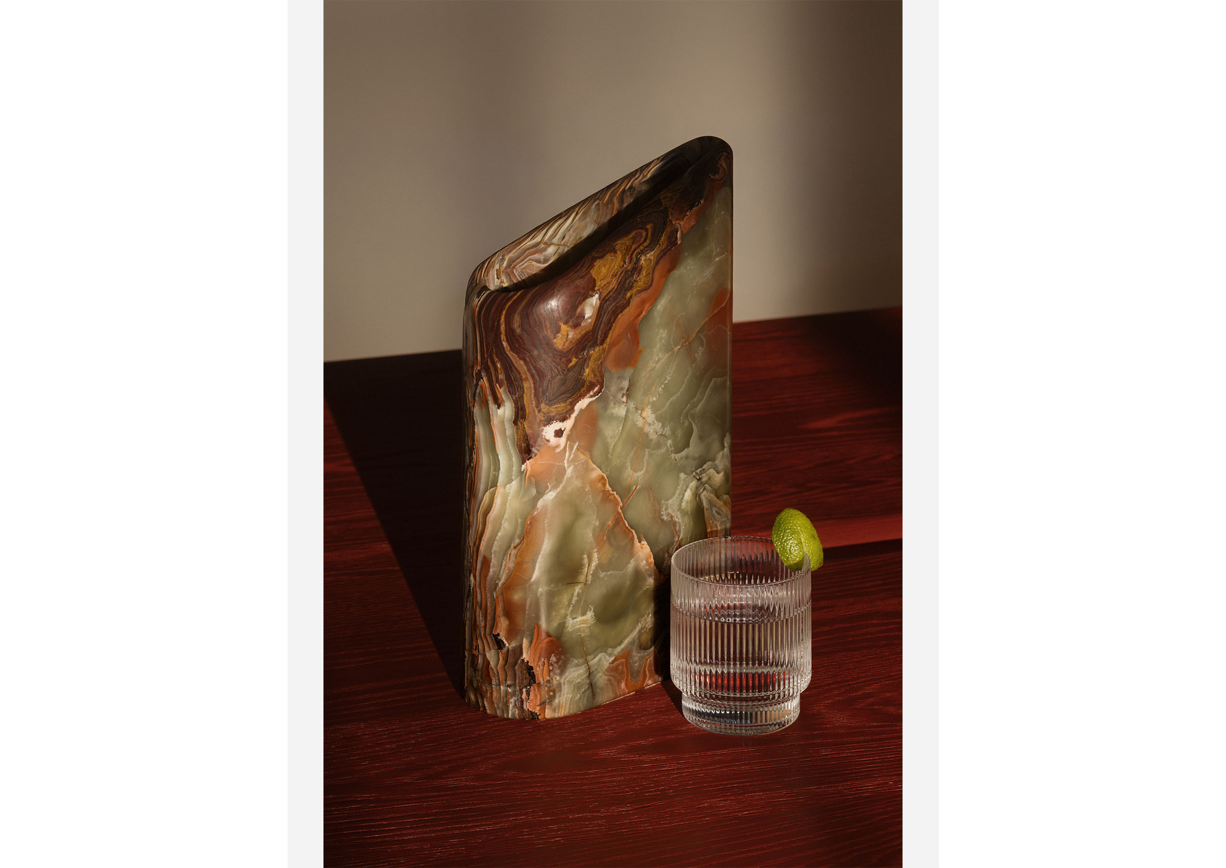 Arthur Vallin’s Lithos Jug, carved from a single block of Onyx Verde with a honed finish, reinterprets the utilitarian vessel through the language of sculpture. Its tapered body and gently canted opening are carefully shaped to guide the flow of water. The weight of the stone is concentrated low in the form to create natural stability on the table. removing the necessity for a handle, inviting the hand to engage directly with the material. As light passes slightly through the onyx, mineral layers in soft green, cream, and rust tones become visible, making each jug entirely unique.