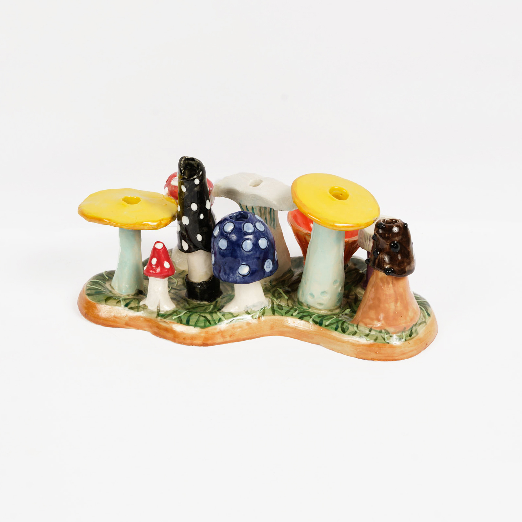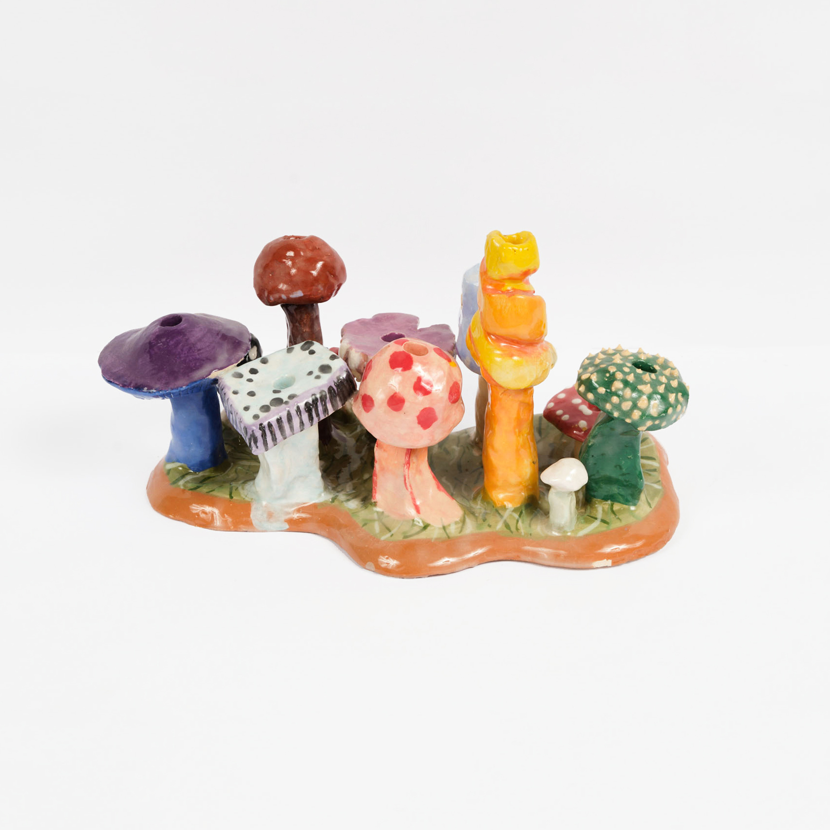 Los Angeles artist Ben Wolf Noam started this series as an object for his family to celebrate a centuries-old tradition, to be used during Hanukkah, but also displayed throughout the year as a reminder of his cultural heritage. He drew on the California Clay Movement to create a psychedelic fantasy rooted in Jewish stories. The mushrooms form architectural villages—like a shtetl—inspired by the bright colors of Chagall, Jewish modernism, and the forest mushrooms that emerge with the changing of the seasons.