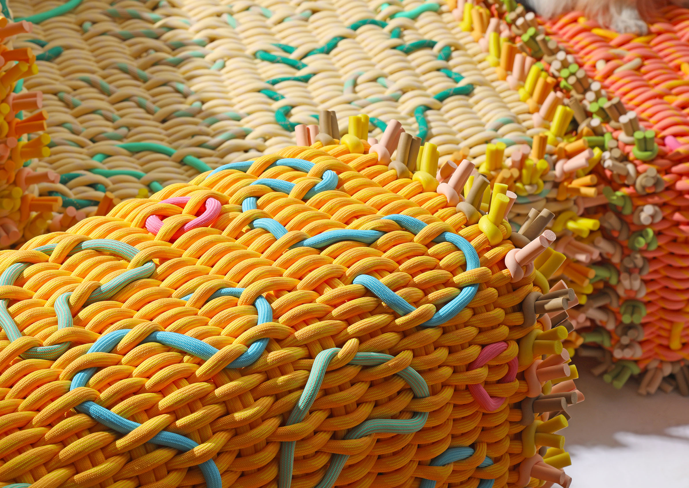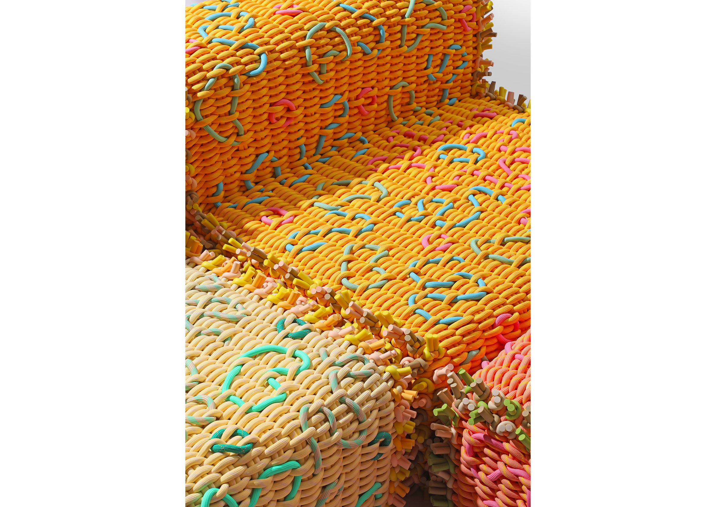 Extra Trimmings reimagines the joyful maximalism of 1970s upholstery through Shore’s structural woven rope and Bethan Laura Wood’s expressive ornamental language. Inspired by an era when sofas became symbols of comfort, intimacy, and self-expression, the collection translates Wood’s hand-drawn floral motifs, scallops, and ruffled detailing into dimensional woven structure and sculptural appliqué. What was once printed surface becomes tactile construction. Rather than looking back in nostalgia, Extra Timmings uses the language of 1970s interior decoration as a point of departure to explore how ornamentation, structure, and material expression can coexist today. The collection feels both familiar and newly invented, translating the warmth and generosity of domestic design into a contemporary material vocabulary.