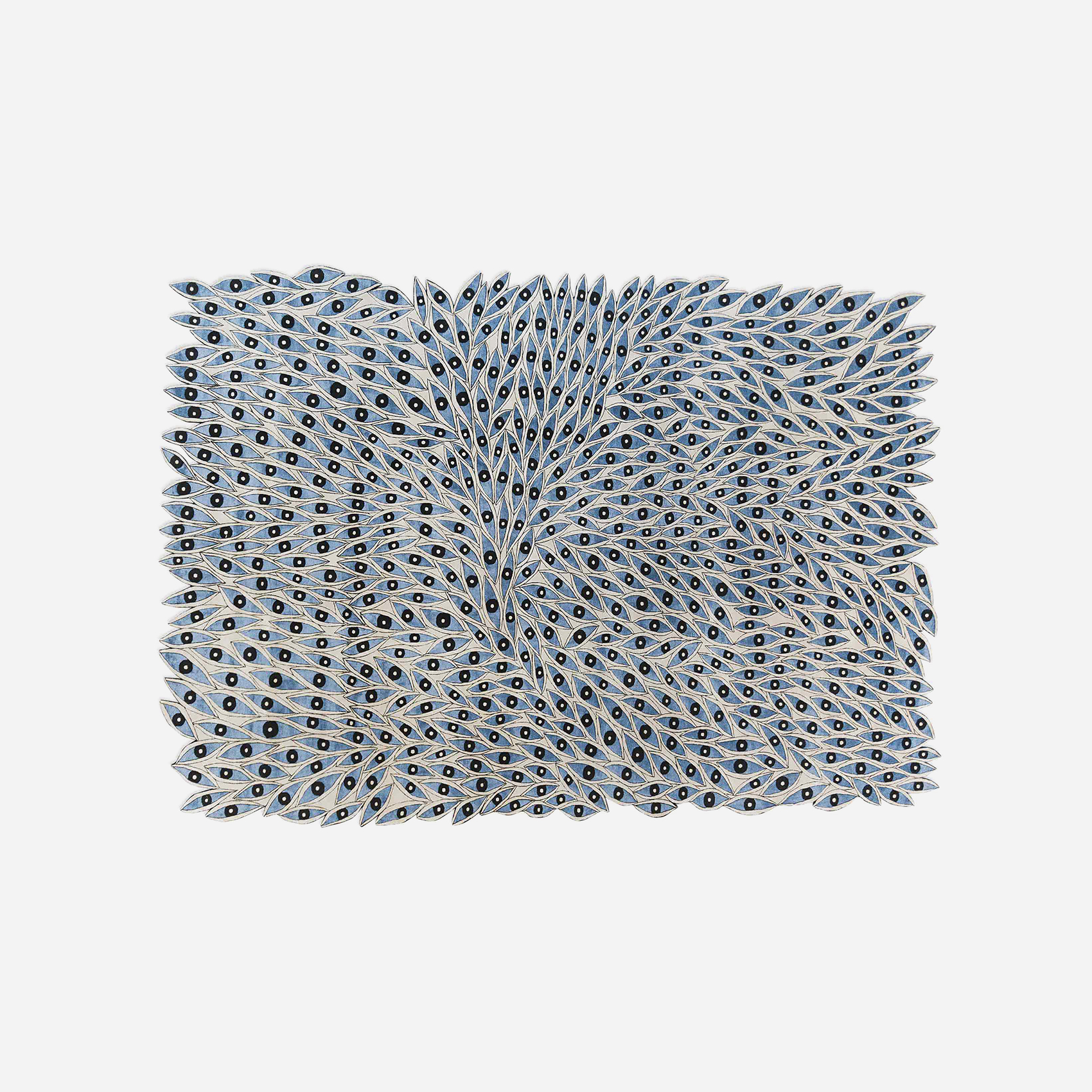 Inspired by the bird’s eye view of a village in Kazakhstan, a beautiful maze-like vision emerges. Born from a harmony of textures and colors in wool and silk, all delicately scissored in various heights to form a multi-dimensional interpretation.