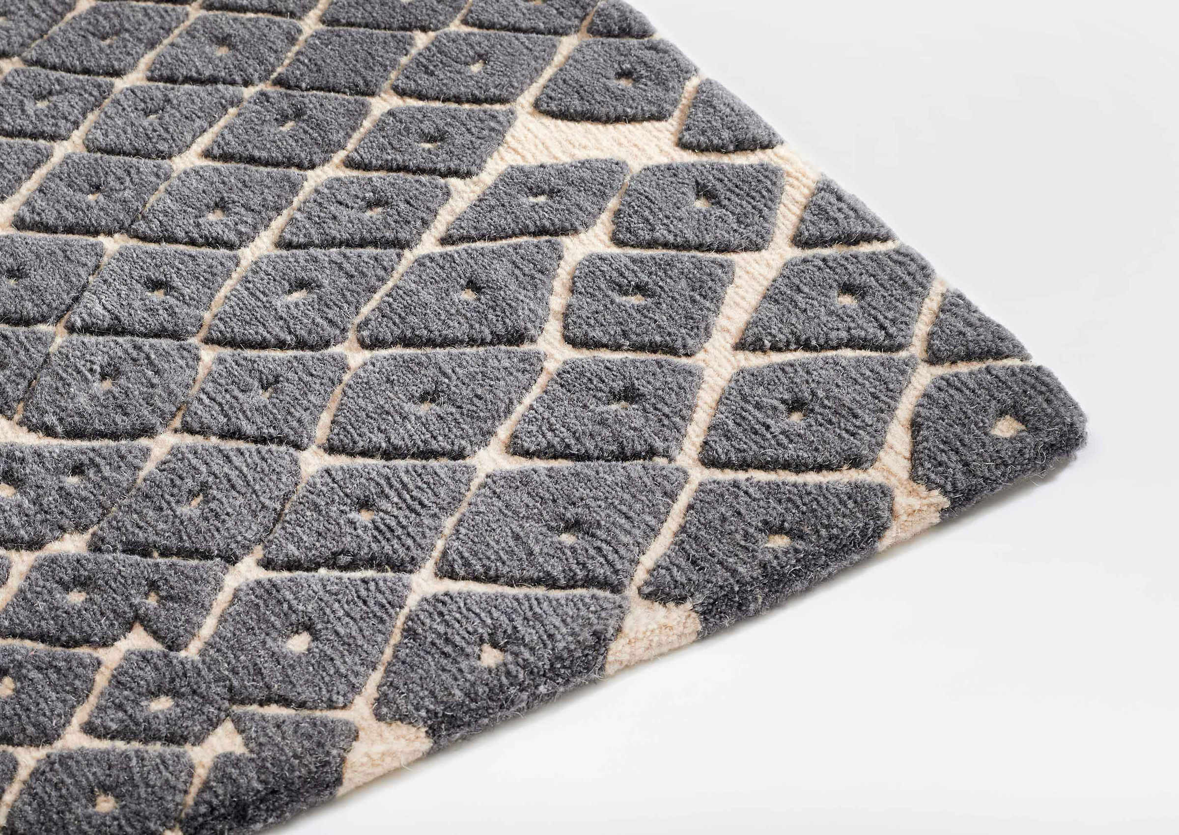 Kimono alludes to a collage of several print textiles, seemingly sewn together in an irregular yet homogenous manner. The contorted diamonds are lifted from their woollen base enhancing ones perspective.