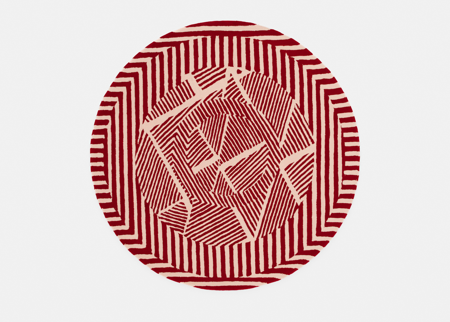 Taking on a large circular rug, the Orcal has a dominant linear pattern which is divided into ringed shapes, mirroring the rug's surface area. Inspired by the Irish summer sunrise, the Orcal rug is imagined in a red and cream colorway.