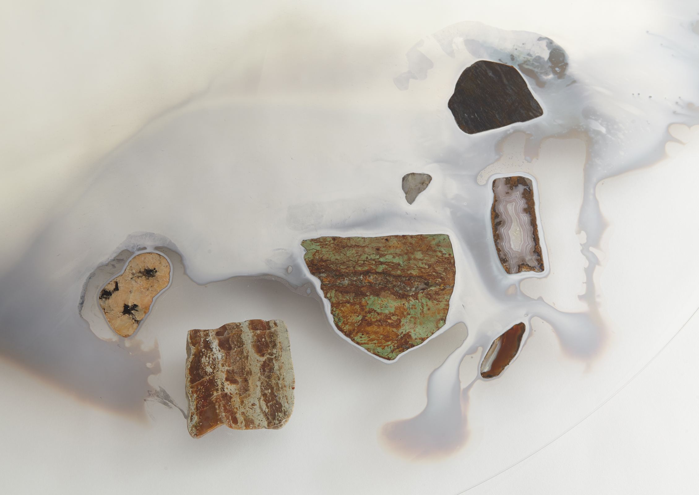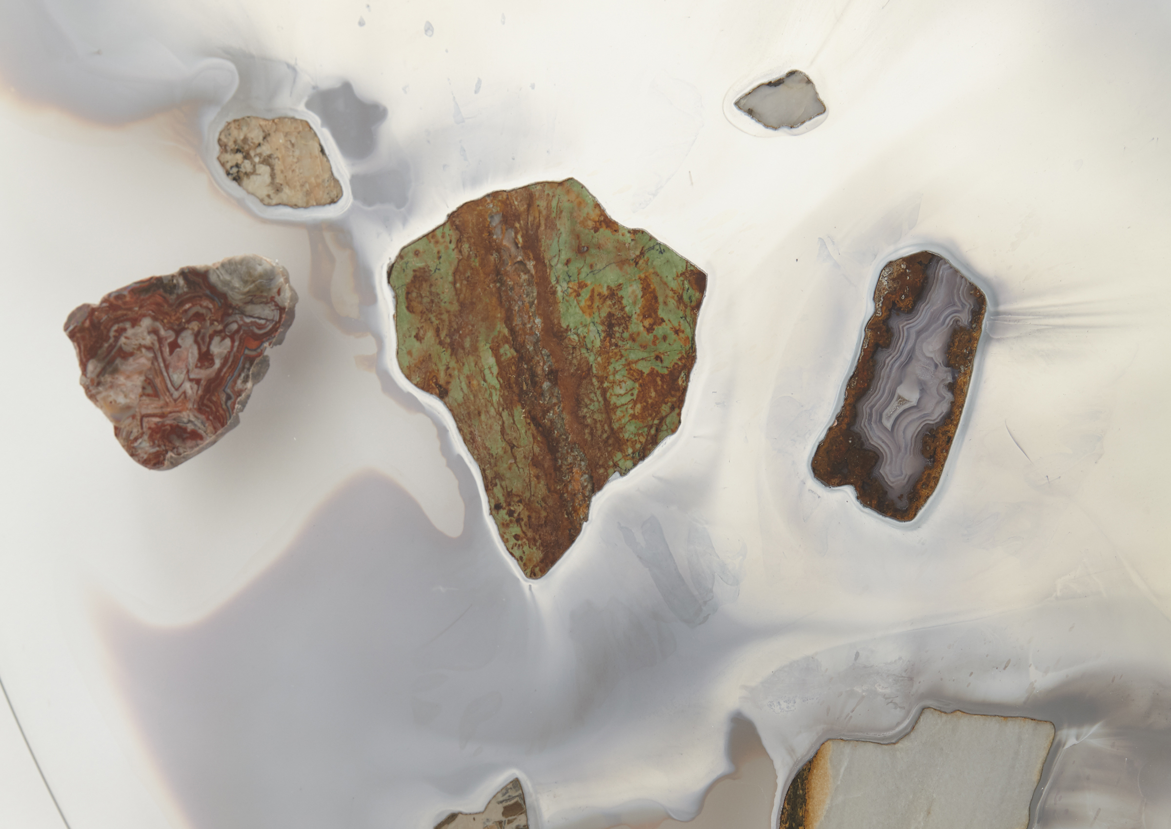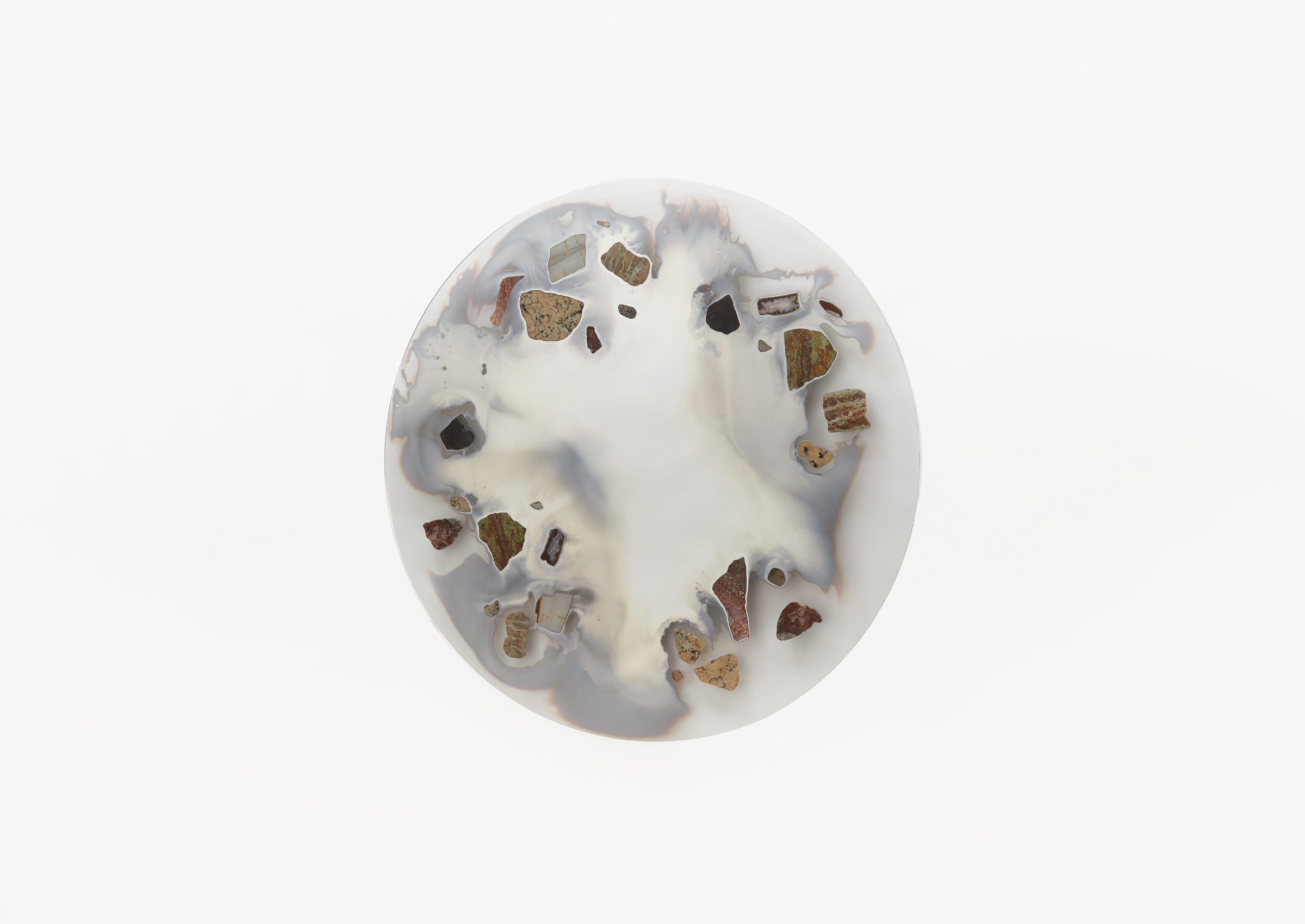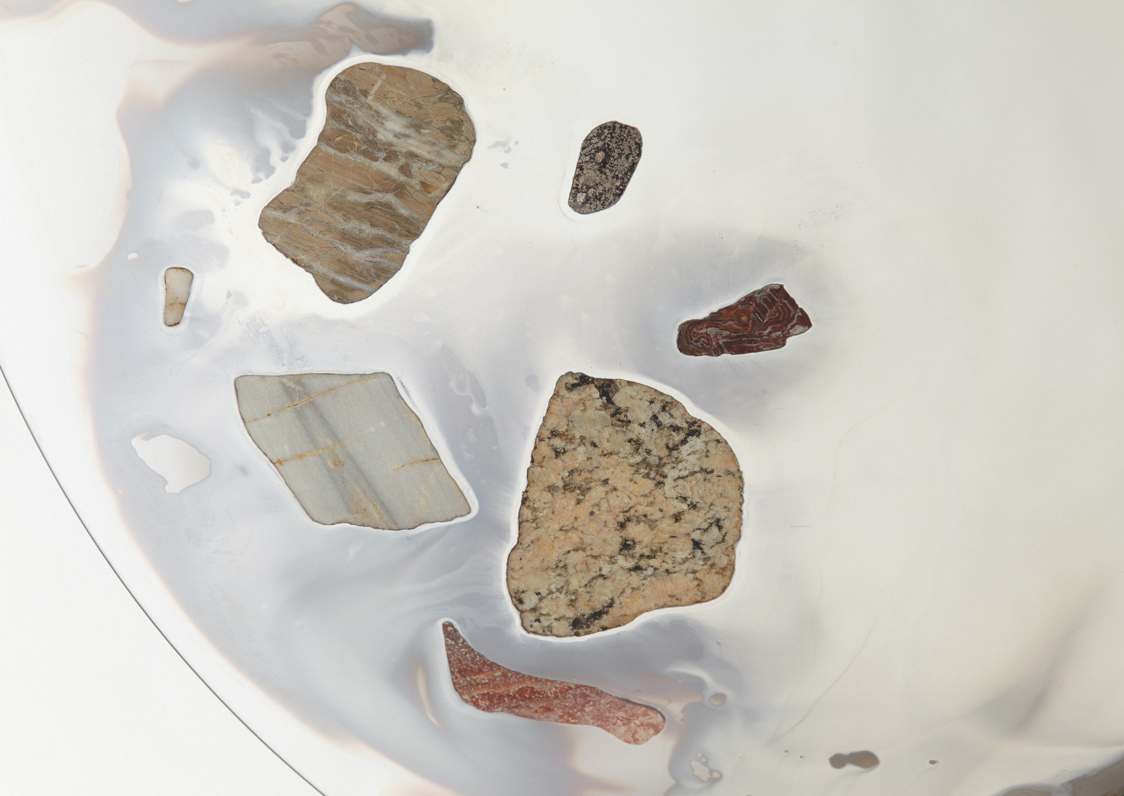 Chen Chen and Kai Williams have skillfully combined contrasting elements and materials to create a truly captivating collection of mirrors. Known as the Transition Mirrors, their name is inspired by the classification of silver as a "transition metal." These mirrors are meticulously crafted through a unique process, where a silver nitrate solution is carefully poured onto clear glass, creating a chemical bond with its surface. The defining feature of these mirrors lies at the contoured edge of the silver, where a deliberate point of fragility exists. This intentional design choice results in a moment of delicate beauty, adding an extraordinary touch to the overall construction.