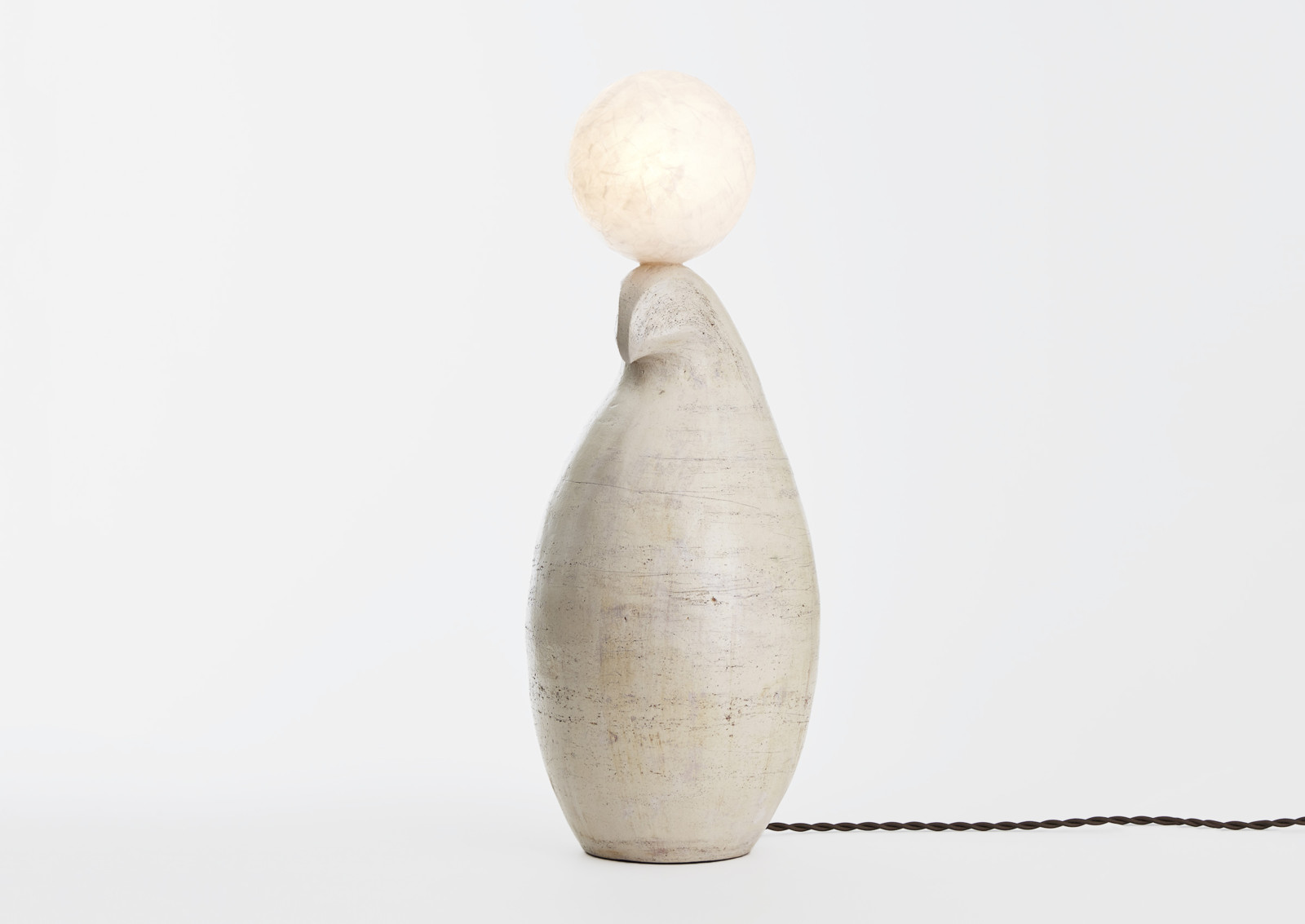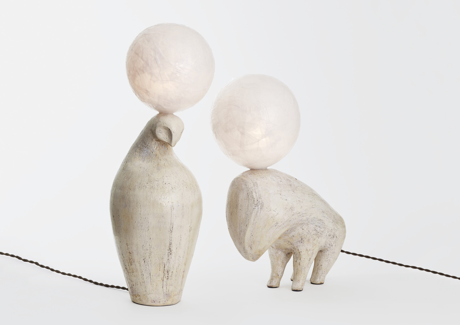 Glazed Ceramic (Raku Clay) and Vellum spherical shades. Twisted Black Cloth cord