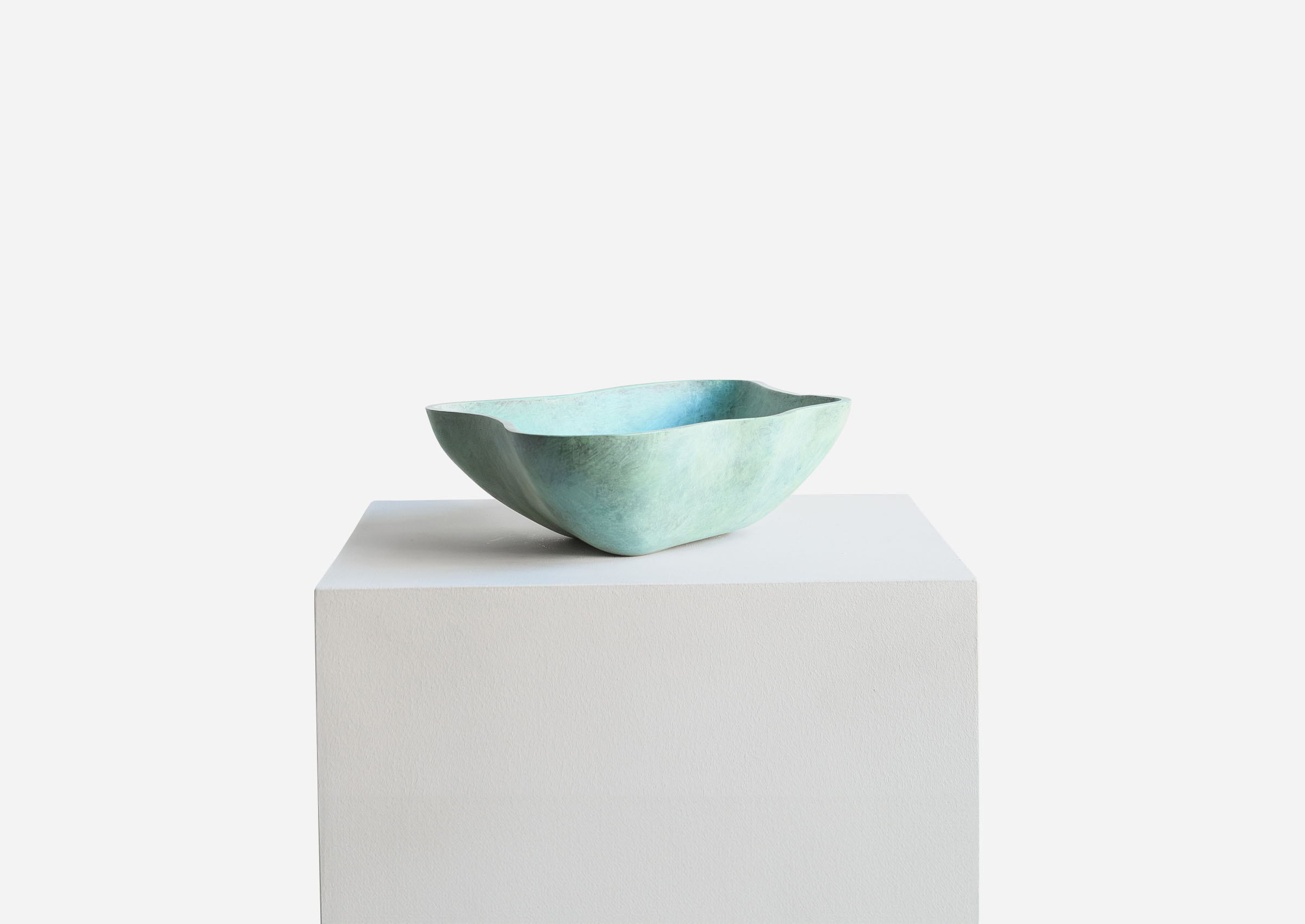The Los Angeles Kidney Bean Pool Shaped Bathtub is crafted in bronze with a verdigris patina. Its weight and patina bring a sense of permanence, functioning as both a vessel and a sculptural accent.