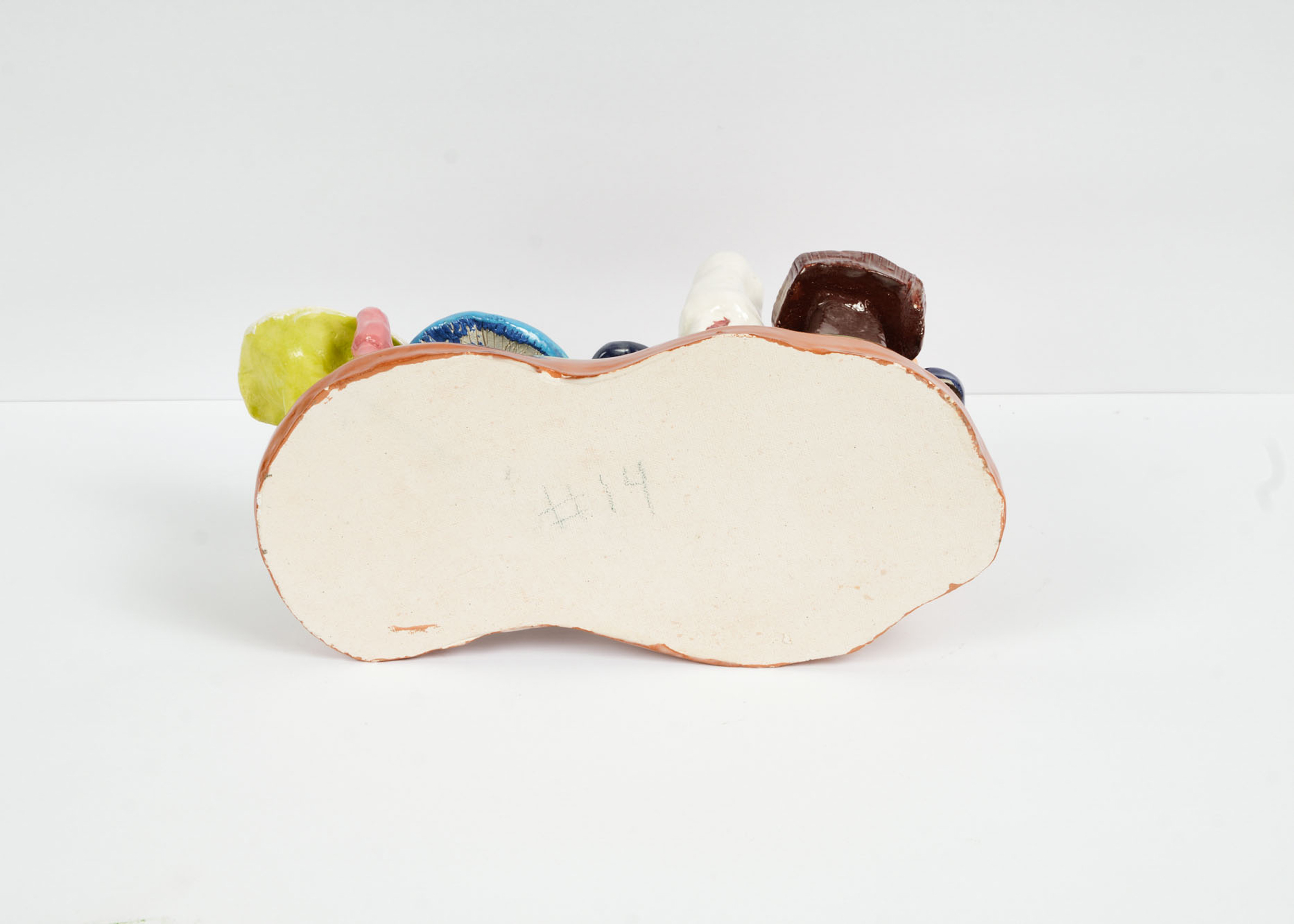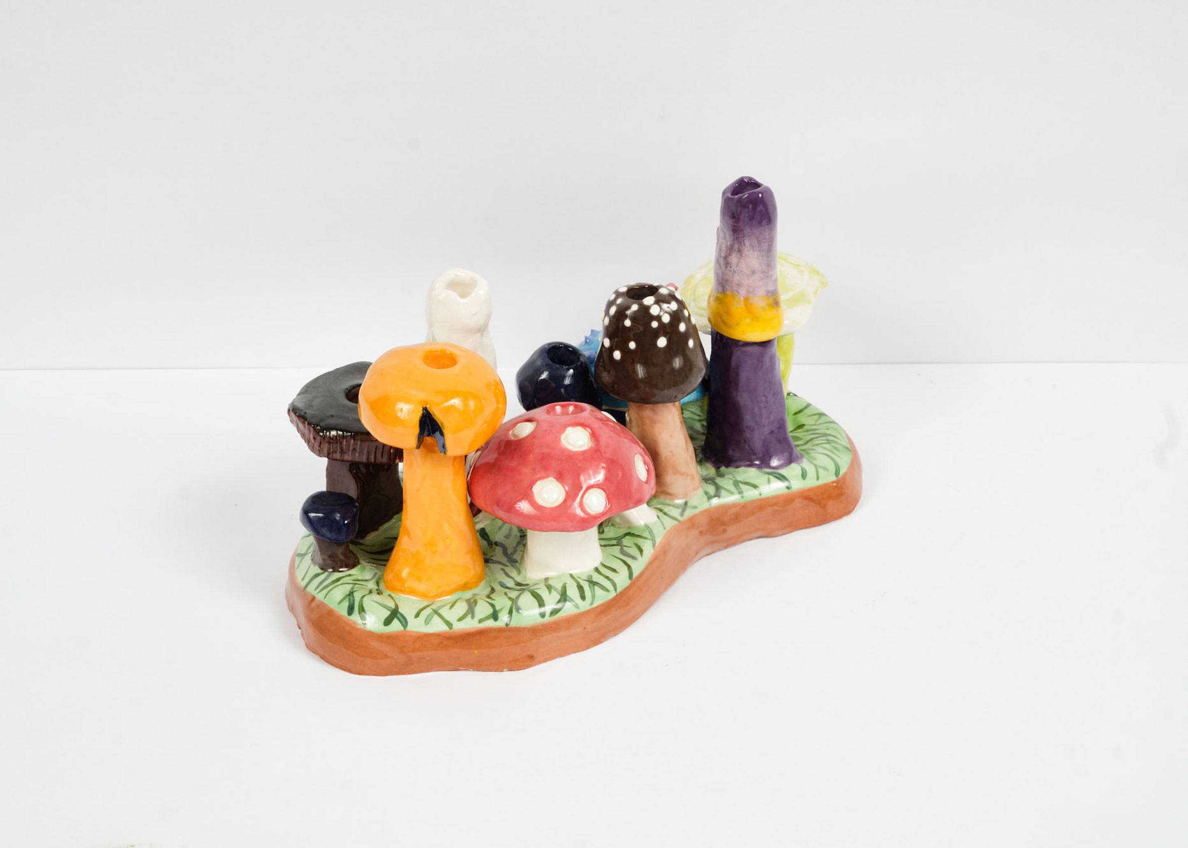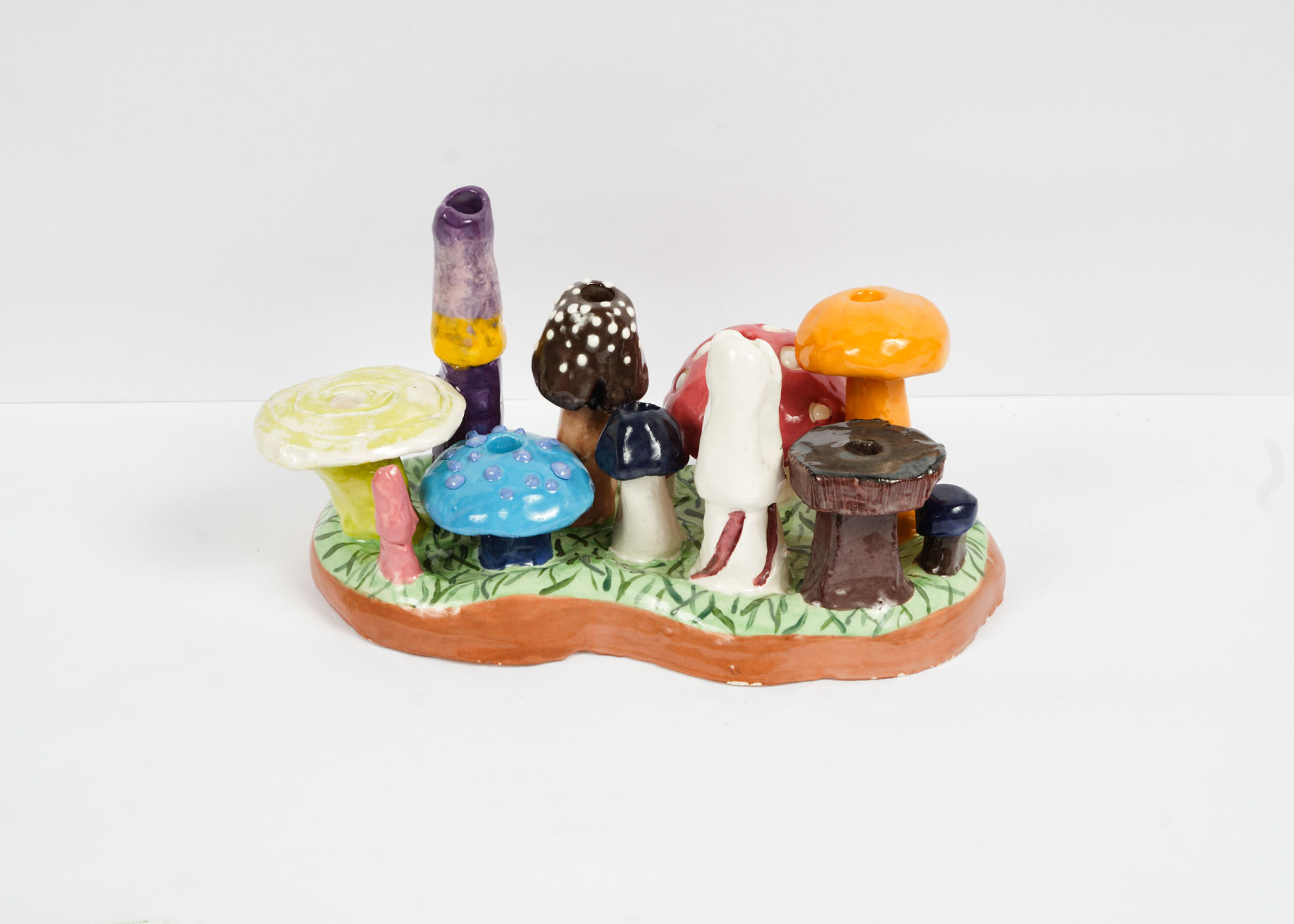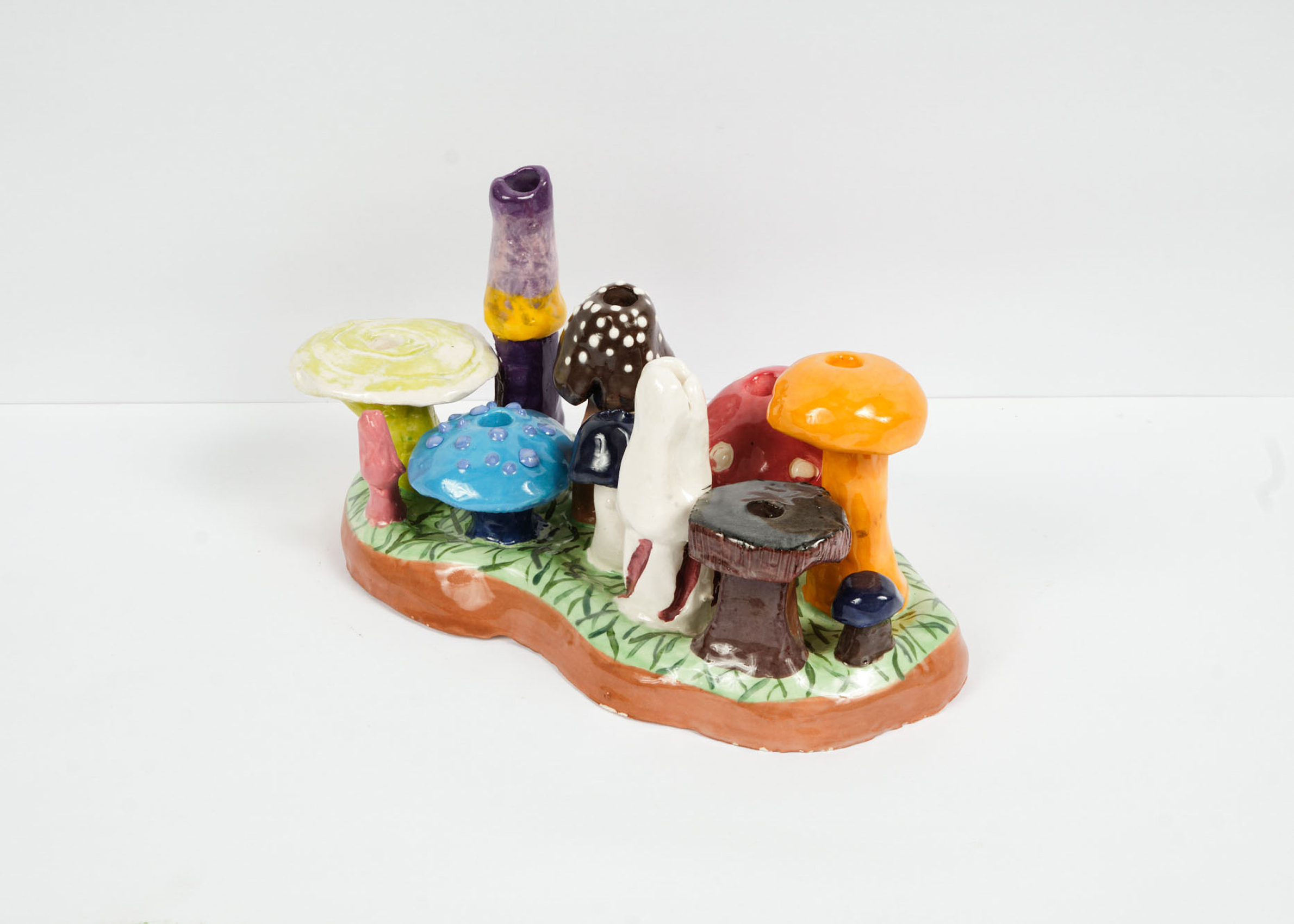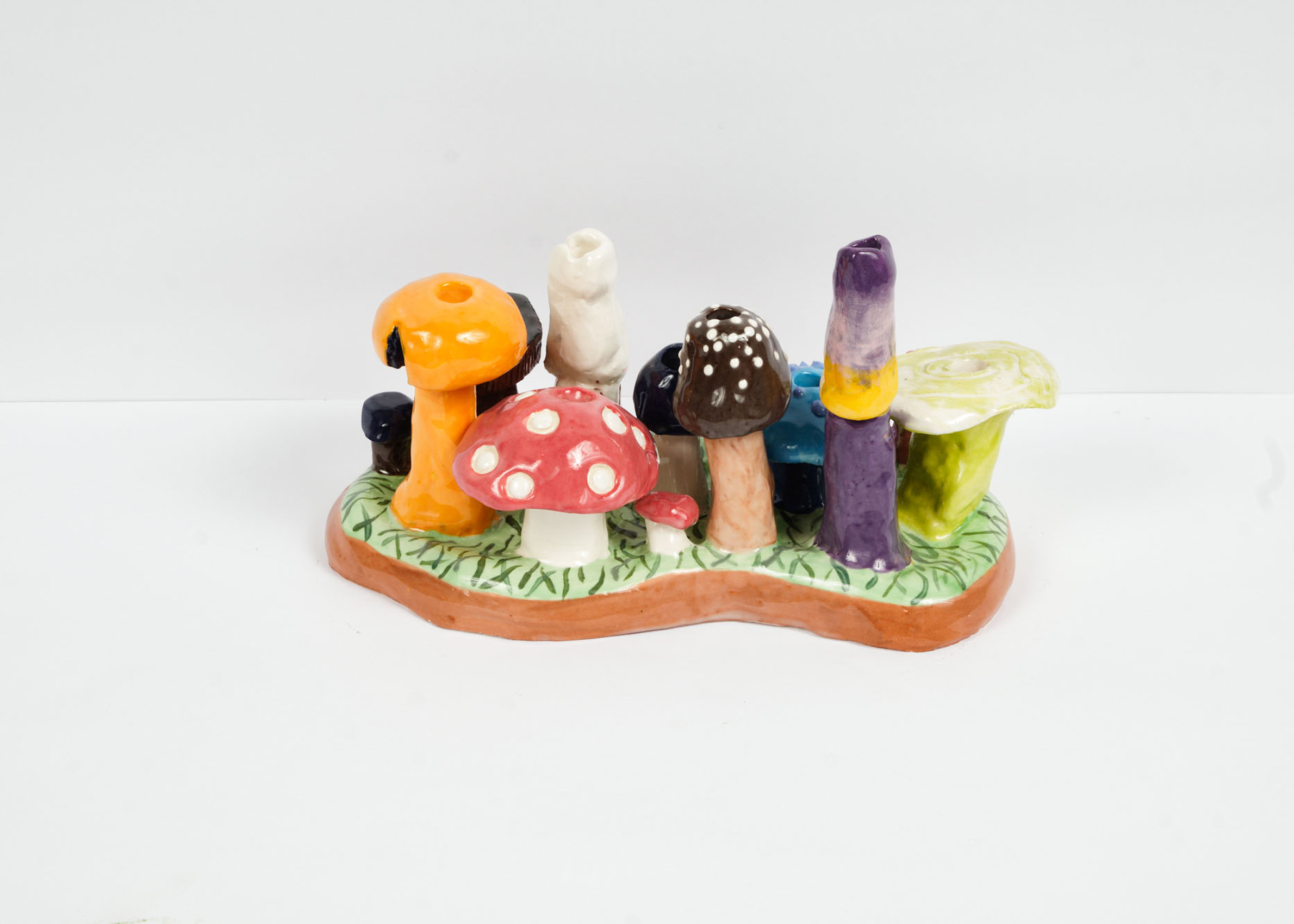 Los Angeles artist Ben Wolf Noam started this series as an object for his family to celebrate a centuries-old tradition, to be used during Hanukkah, but also displayed throughout the year as a reminder of his cultural heritage. He drew on the California Clay Movement to create a psychedelic fantasy rooted in Jewish stories. The mushrooms form architectural villages—like a shtetl—inspired by the bright colors of Chagall, Jewish modernism, and the forest mushrooms that emerge with the changing of the seasons.