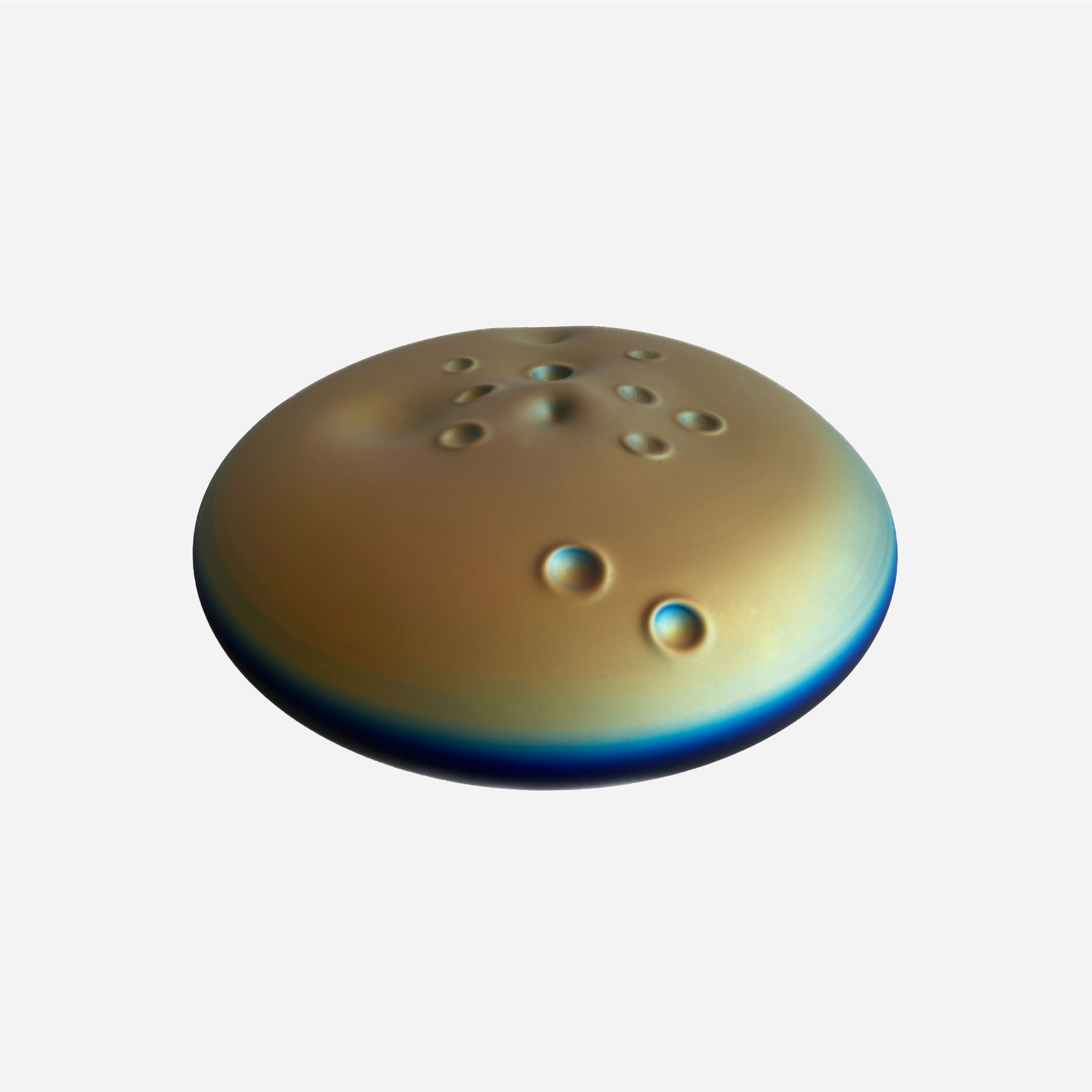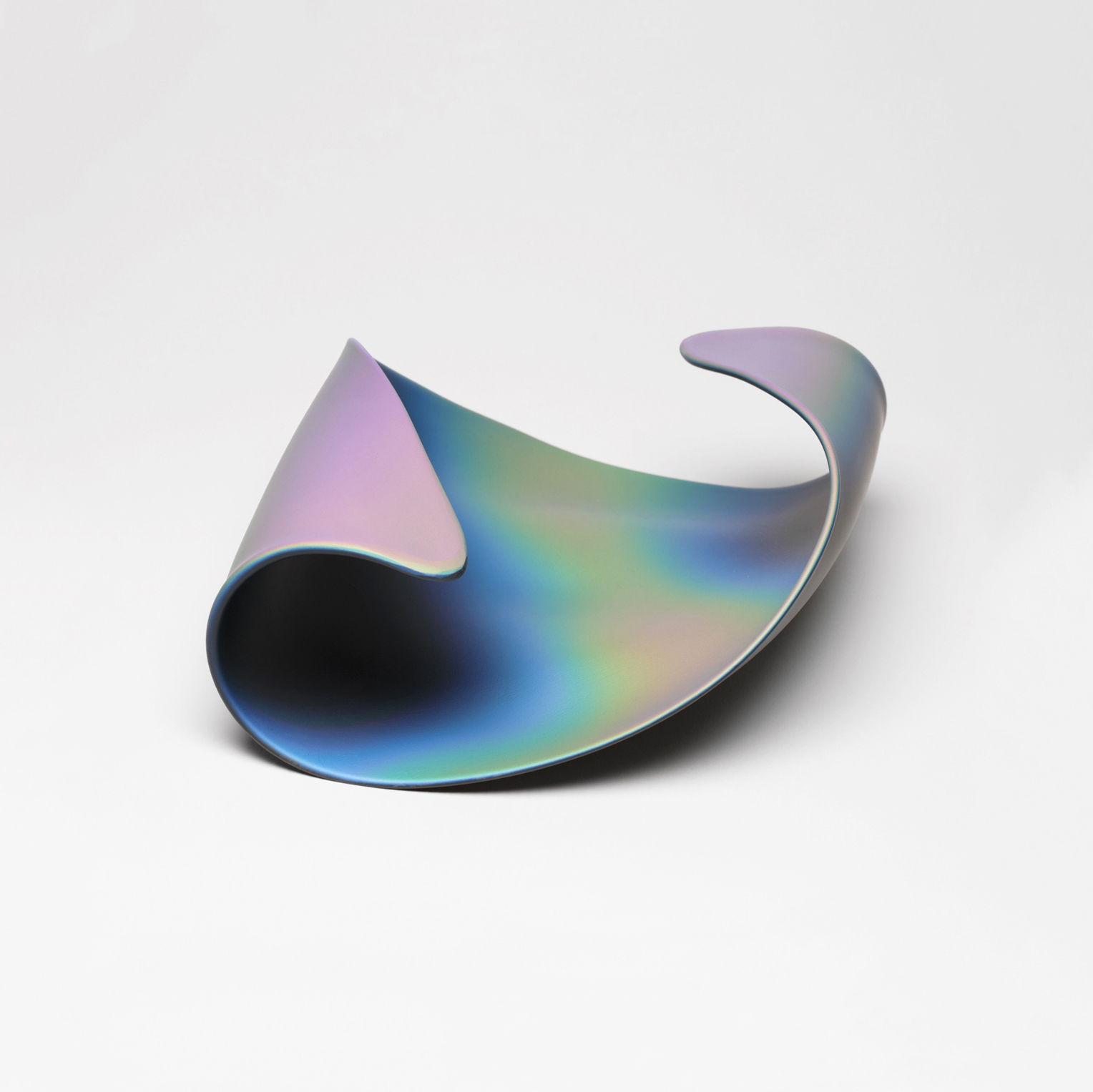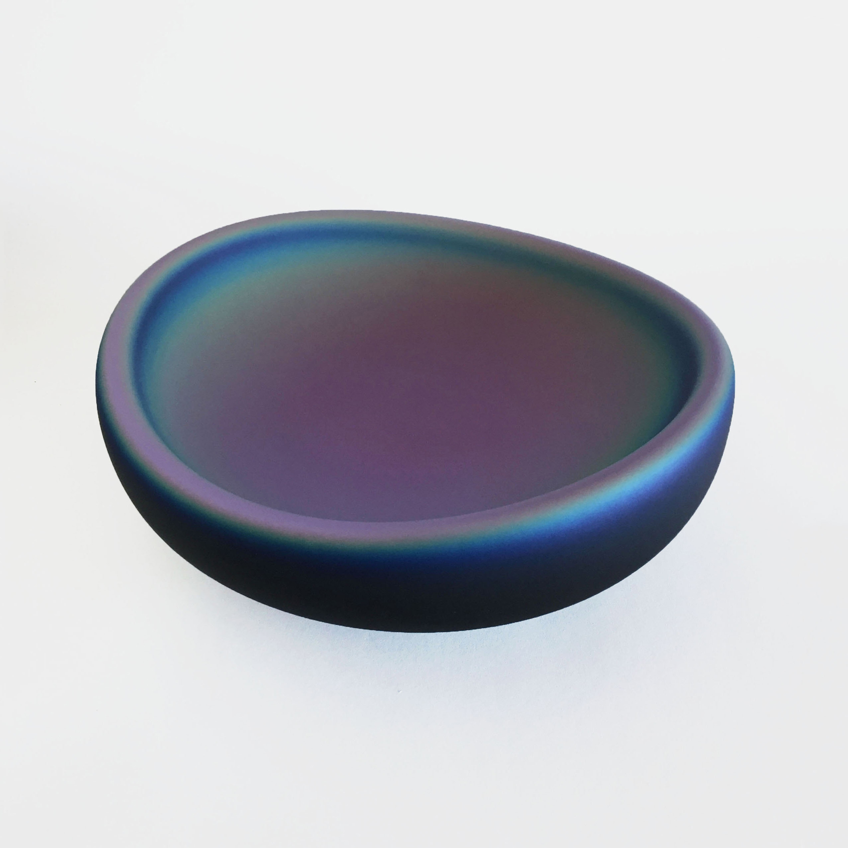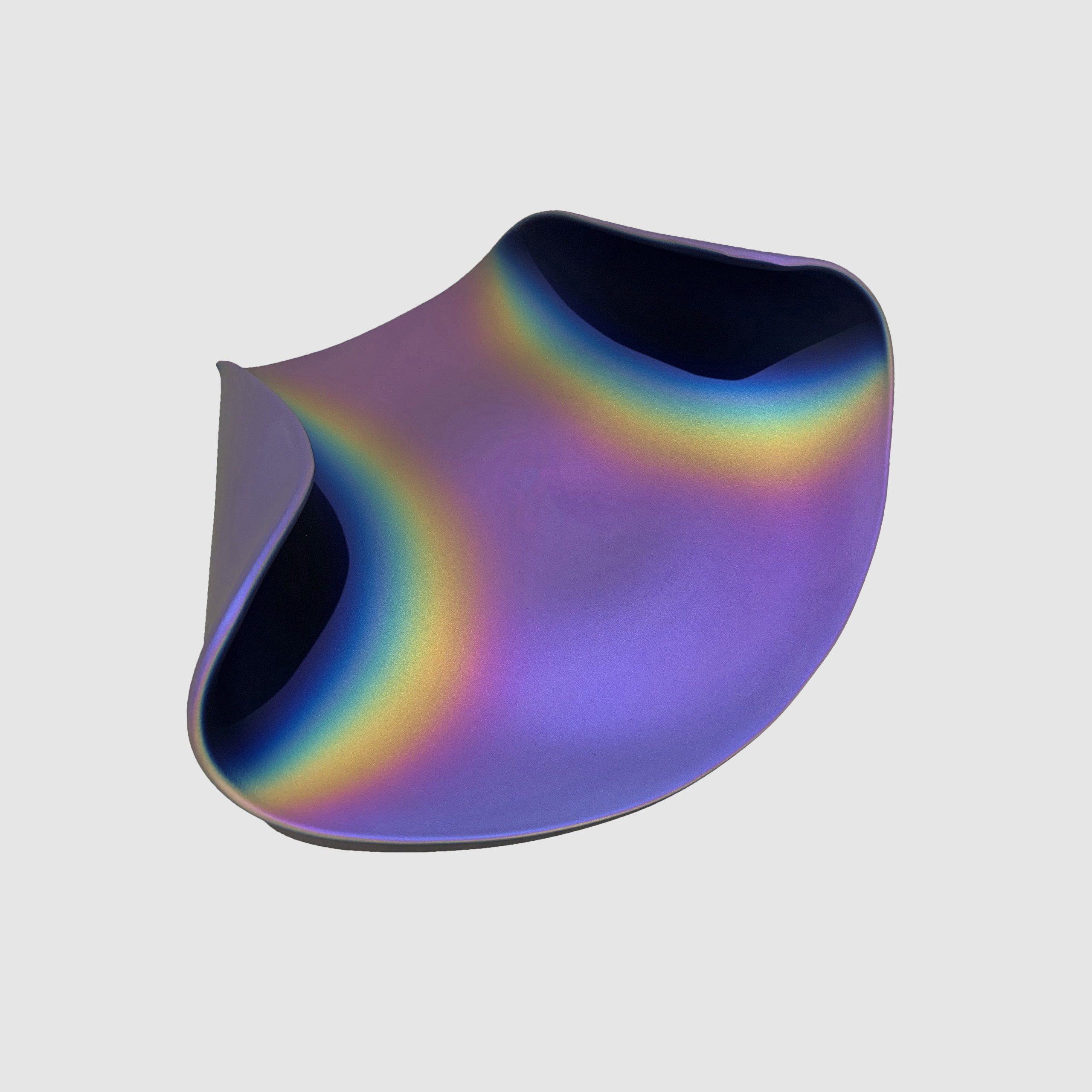 Artist Katherine Gray stumbled upon the bowl's unique design while experimenting with iridescent surfaces, inspired by James Turrell's "Perceptual Cell." To recreate a captivating play of pure color and light on a smaller scale, she employed NASA-developed technology, using microscopically thin layers of metallic oxides and vaporized quartz. The sandblasted surface's distinct distribution of deposits causes the glass to exhibit varying colors from different angles, while Gray's forms evoke hints of body parts and skin, blending palpability with mystery.