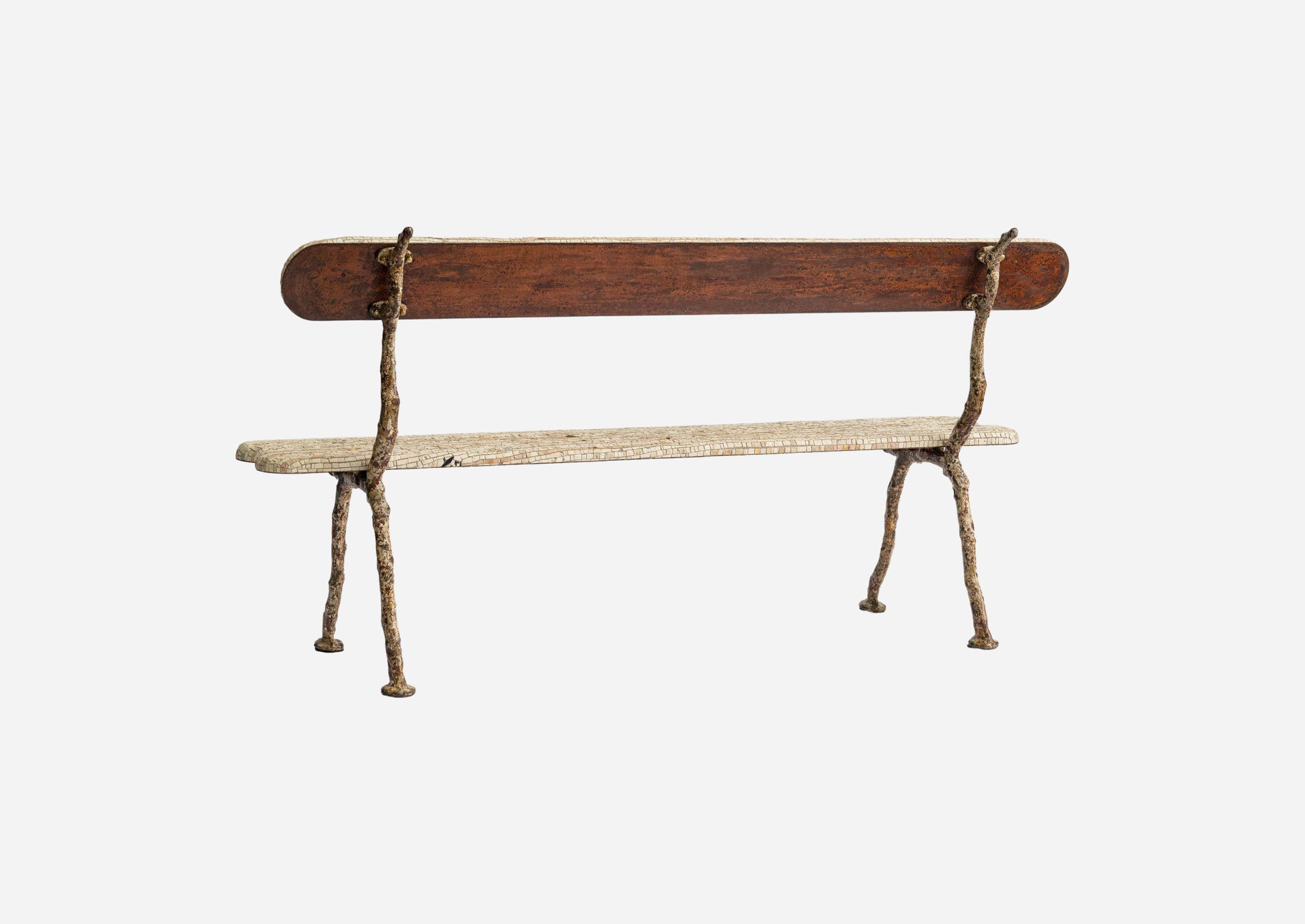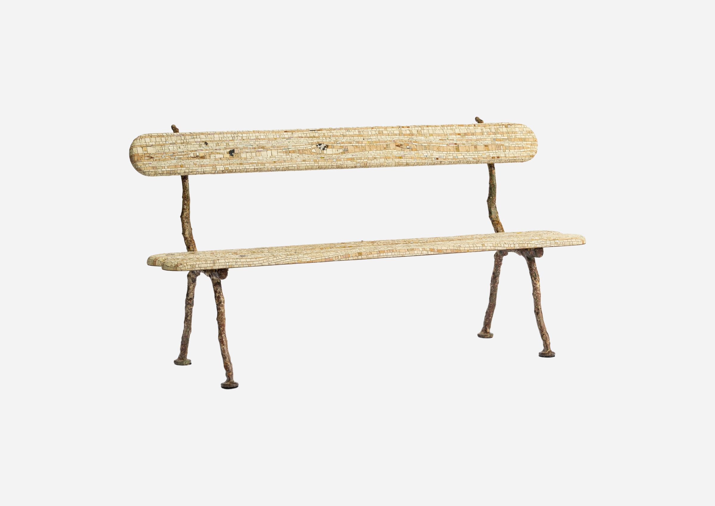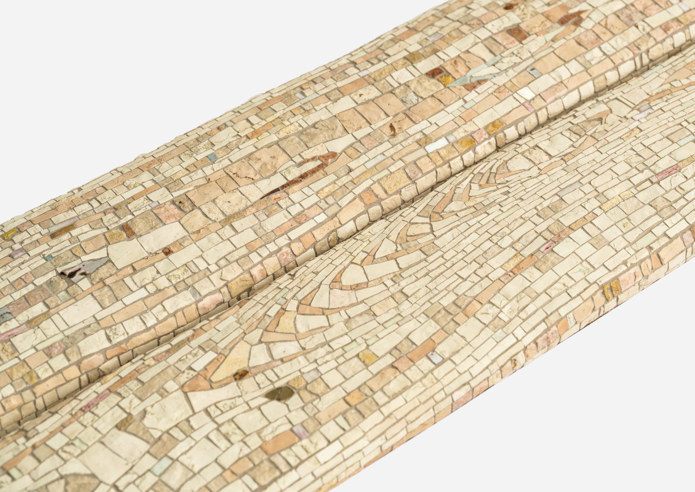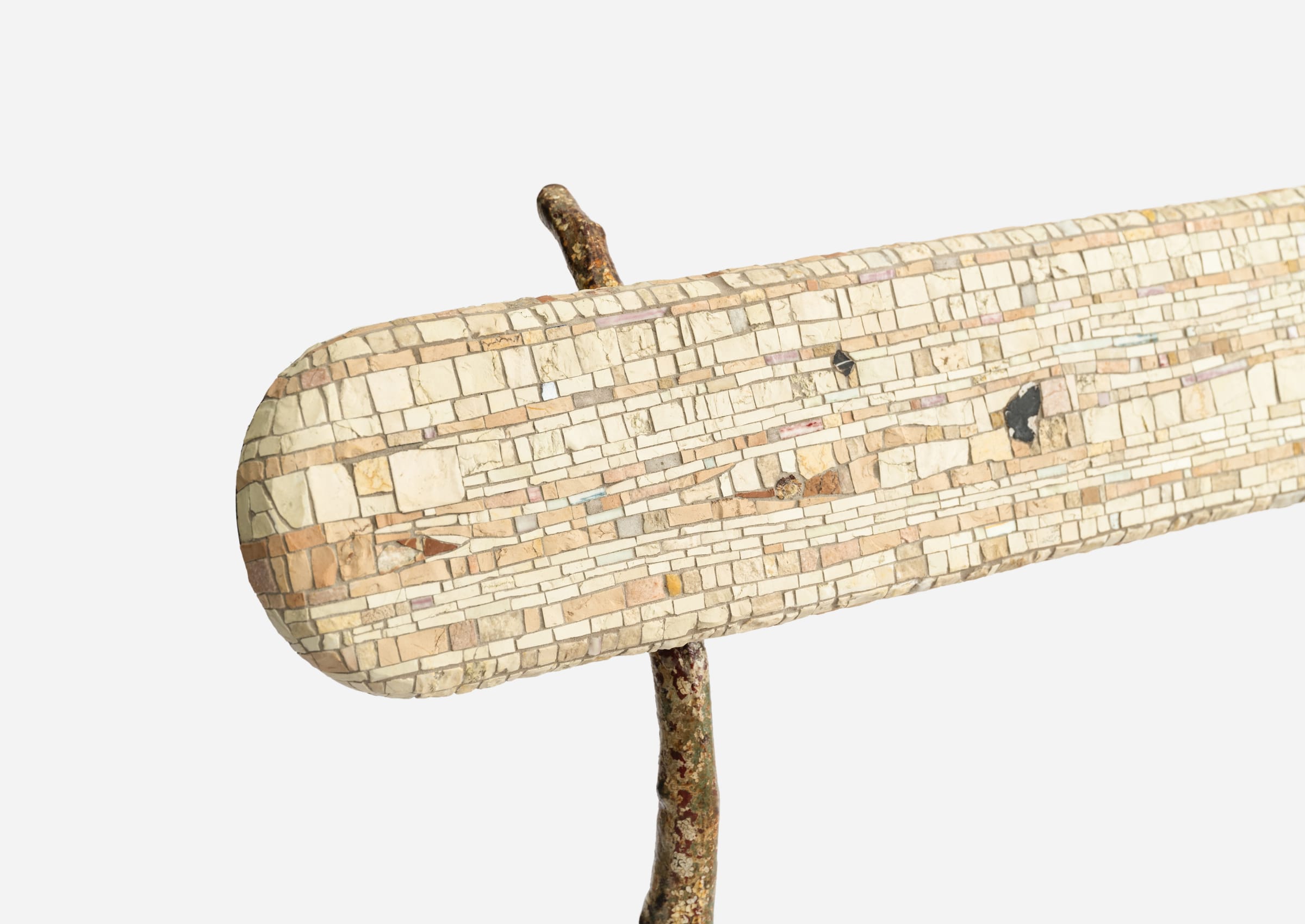 Panchina Bianca, designed by Yukiko Nagai, is a striking bench that fuses an antique iron frame with a beautifully crafted mosaic seat and backrest. The intricate arrangement of marble and stone tiles mimics the natural elegance of wood grain, offering a refined yet organic aesthetic. Nagai's vision emphasizes the innovative use of materials, focusing exclusively on marble and stone to create a surprising tactile and visual experience.