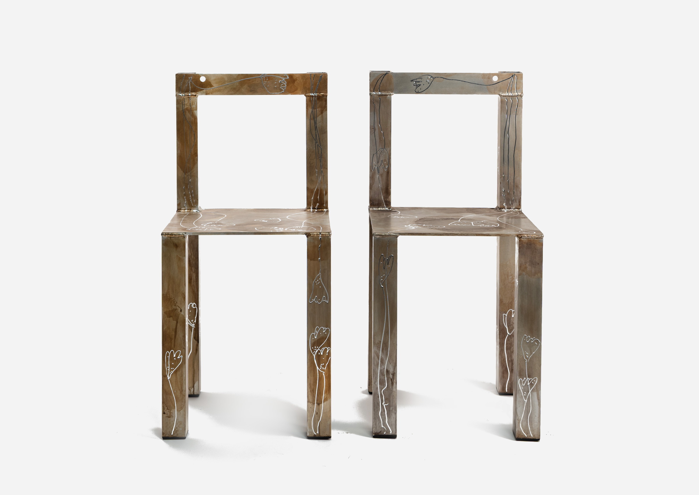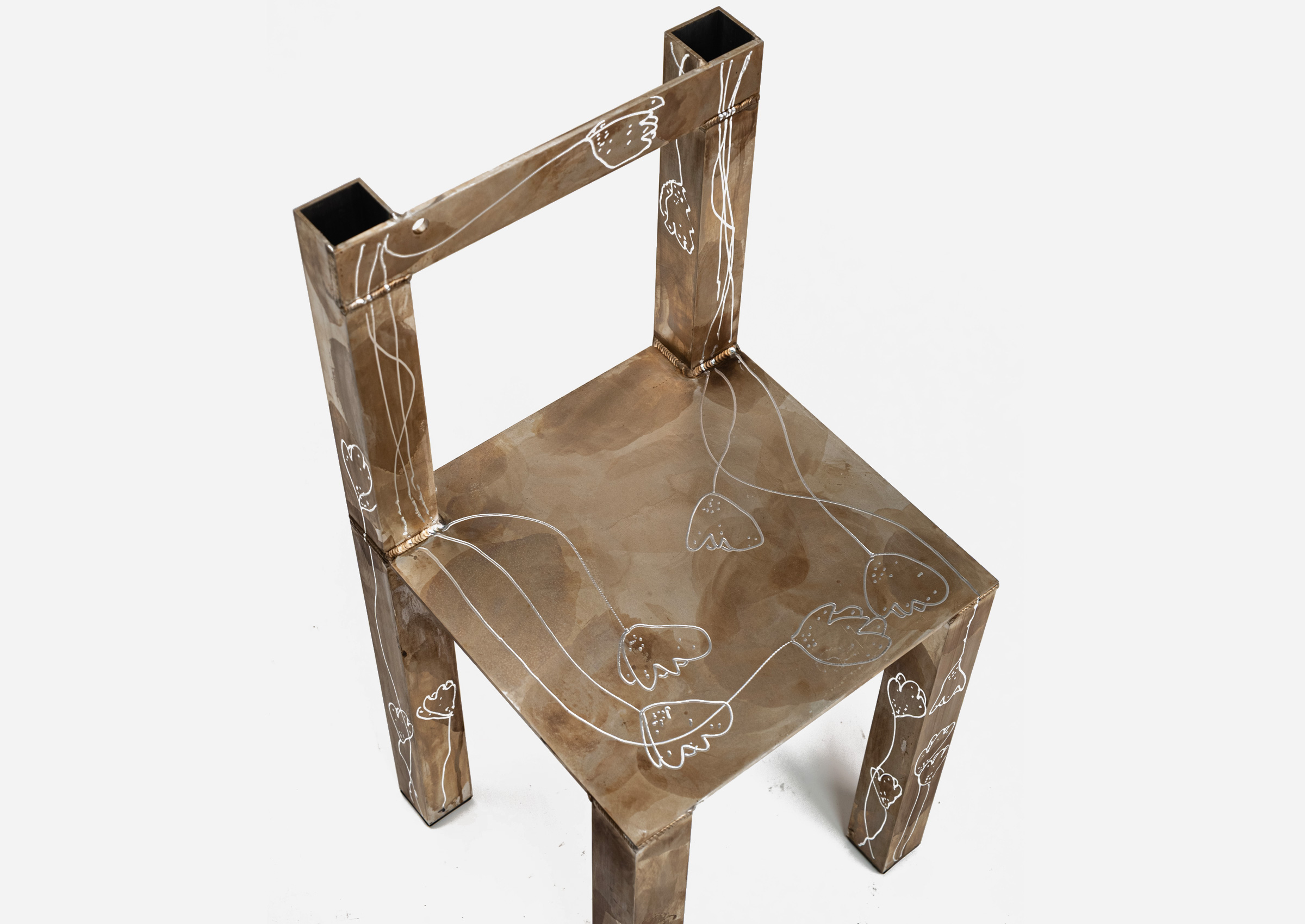 A sculptural chair crafted in patinated aluminum, this piece explores the grid through its clean geometry, softened by a hand-applied surface finish that recalls organic variation. A study in balance between utility and artistry.