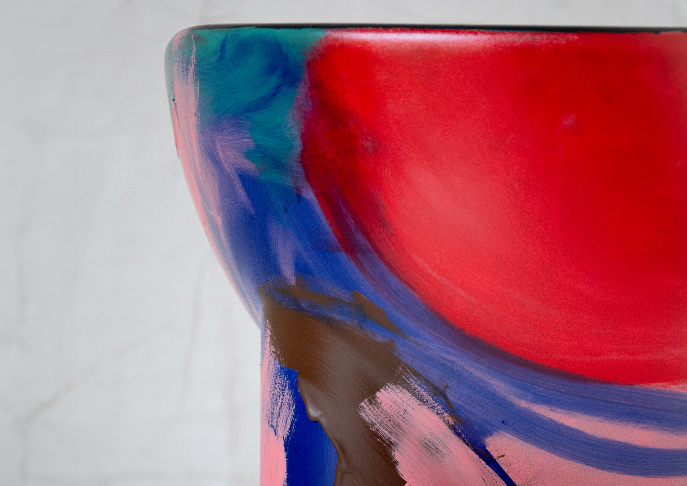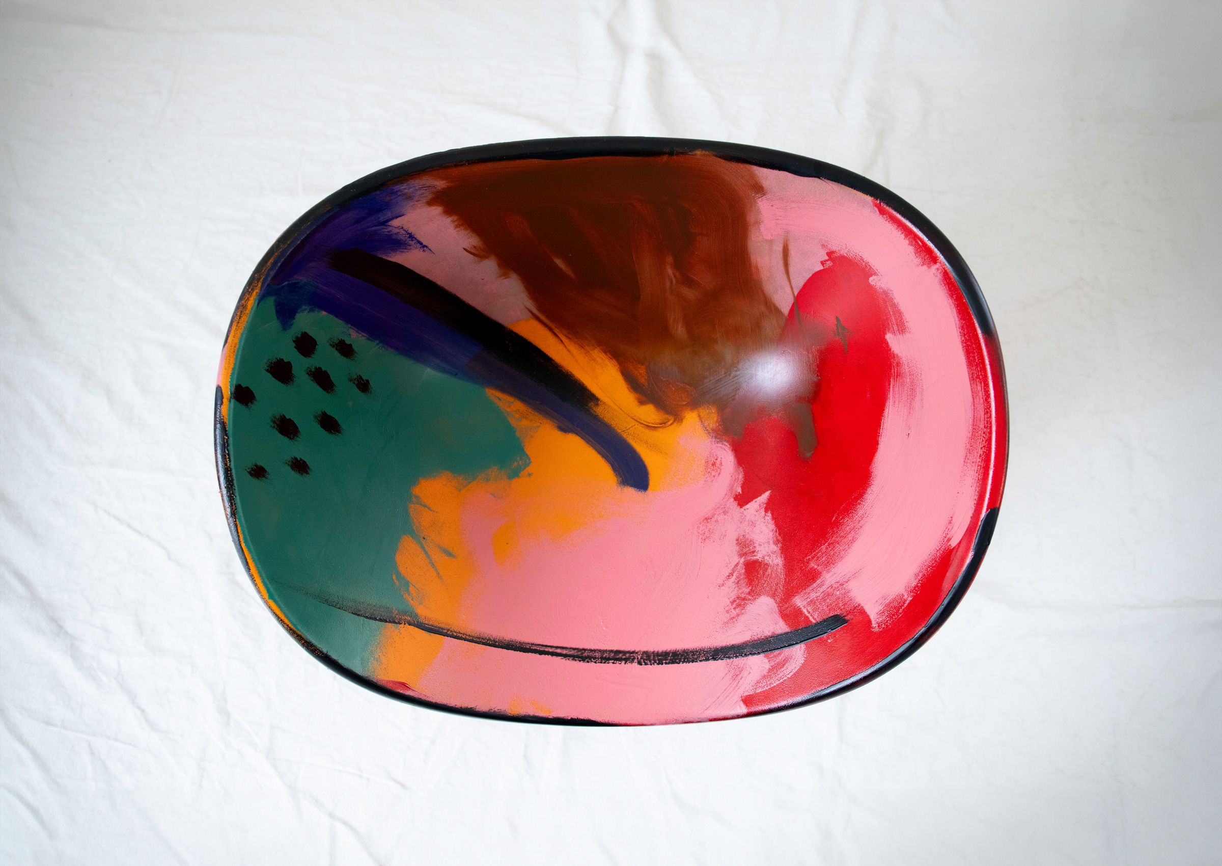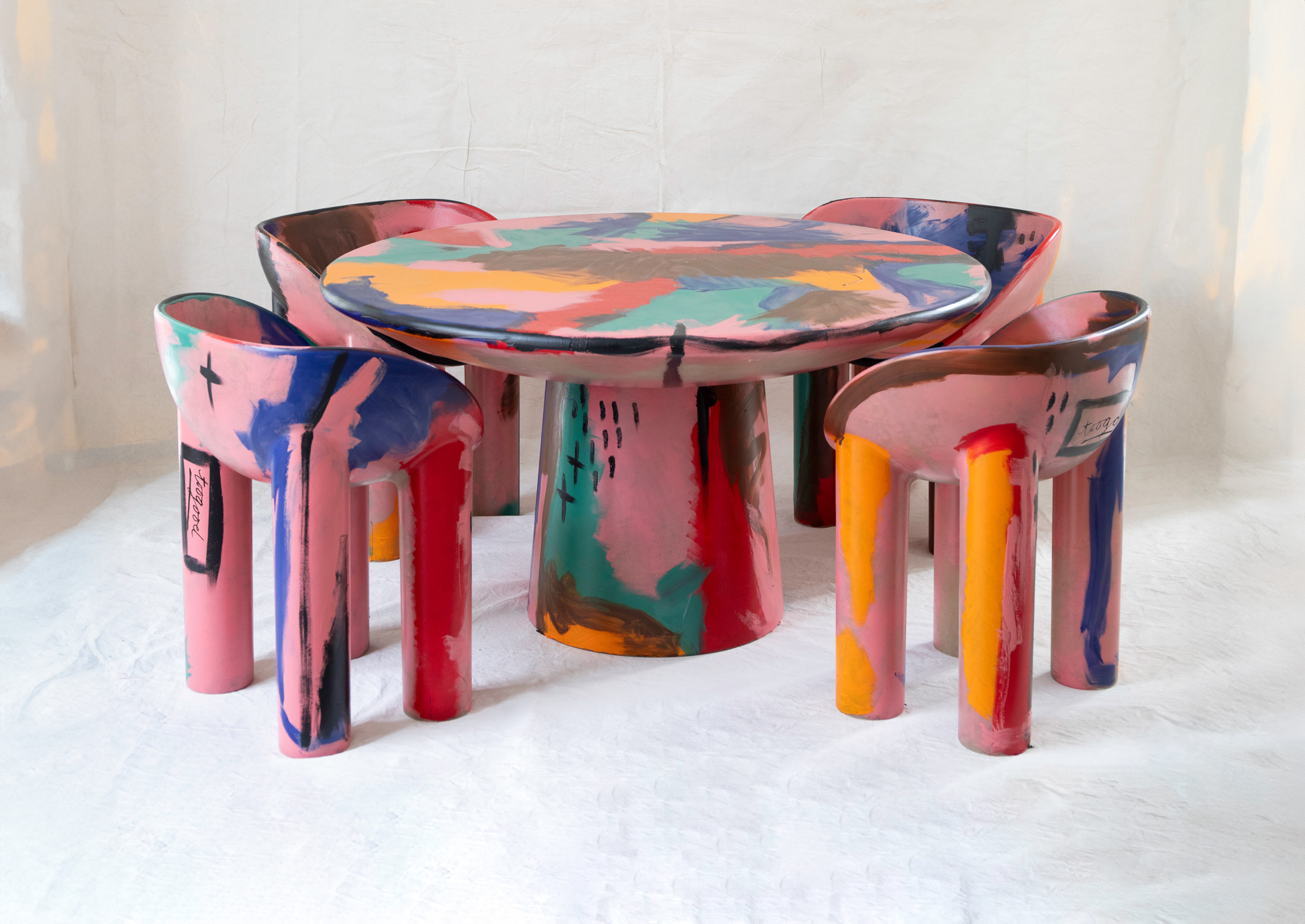 These chairs are sculptural and soft-edged, and their iconic silhouette becomes a canvas—each uniquely painted in fluid, gestural marks. No two are the same, each one a fleeting vision made permanent. Each invites gathering, but more than that—they invite presence.