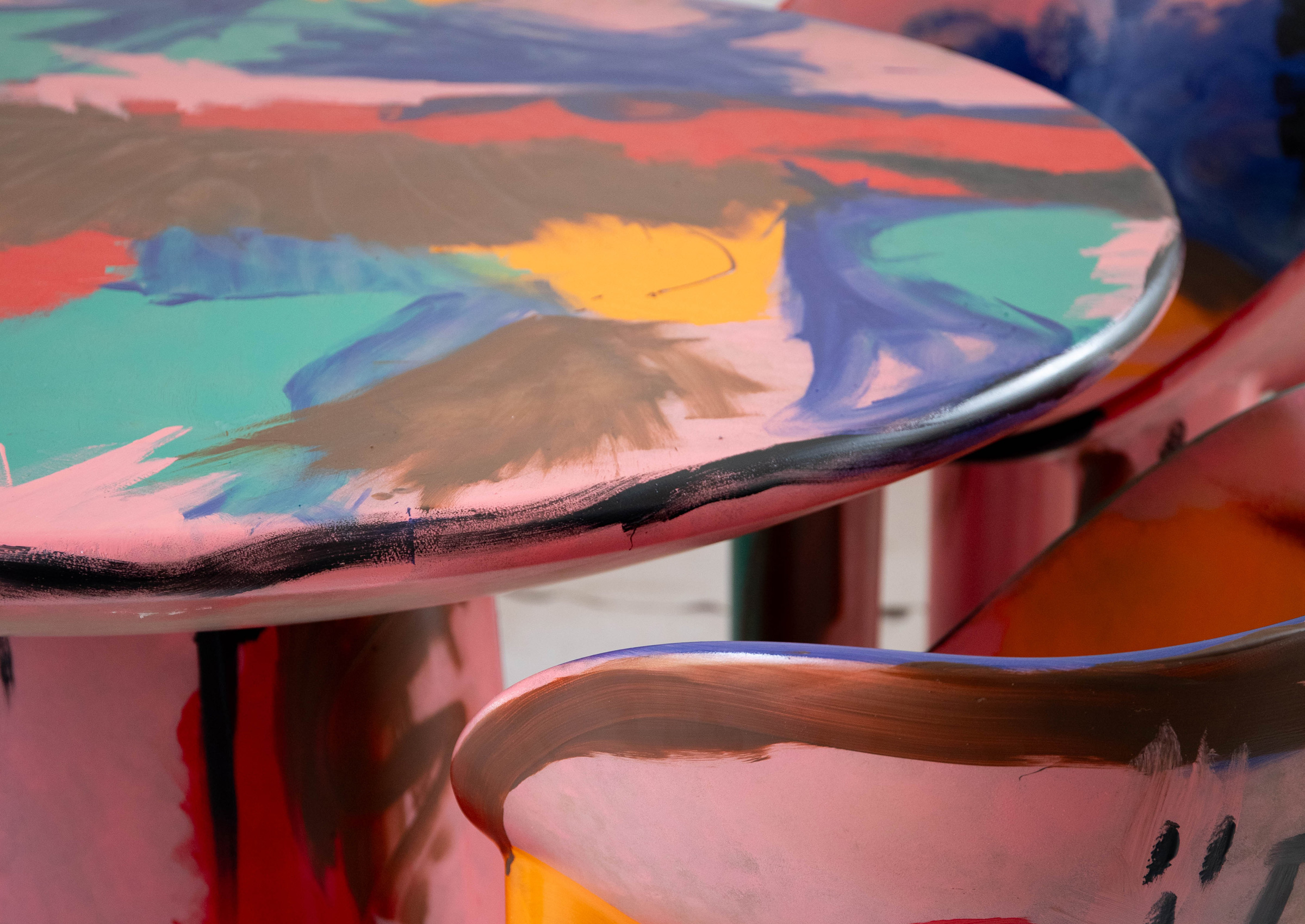 A centerpiece of ceremony and intuition, the hand-painted dining table offers more than surface—it offers atmosphere. Circular, grounding, and ringed with the artist’s unconscious gestures, it transforms the act of gathering into something mythic. A table not just for meals, but for meaning.