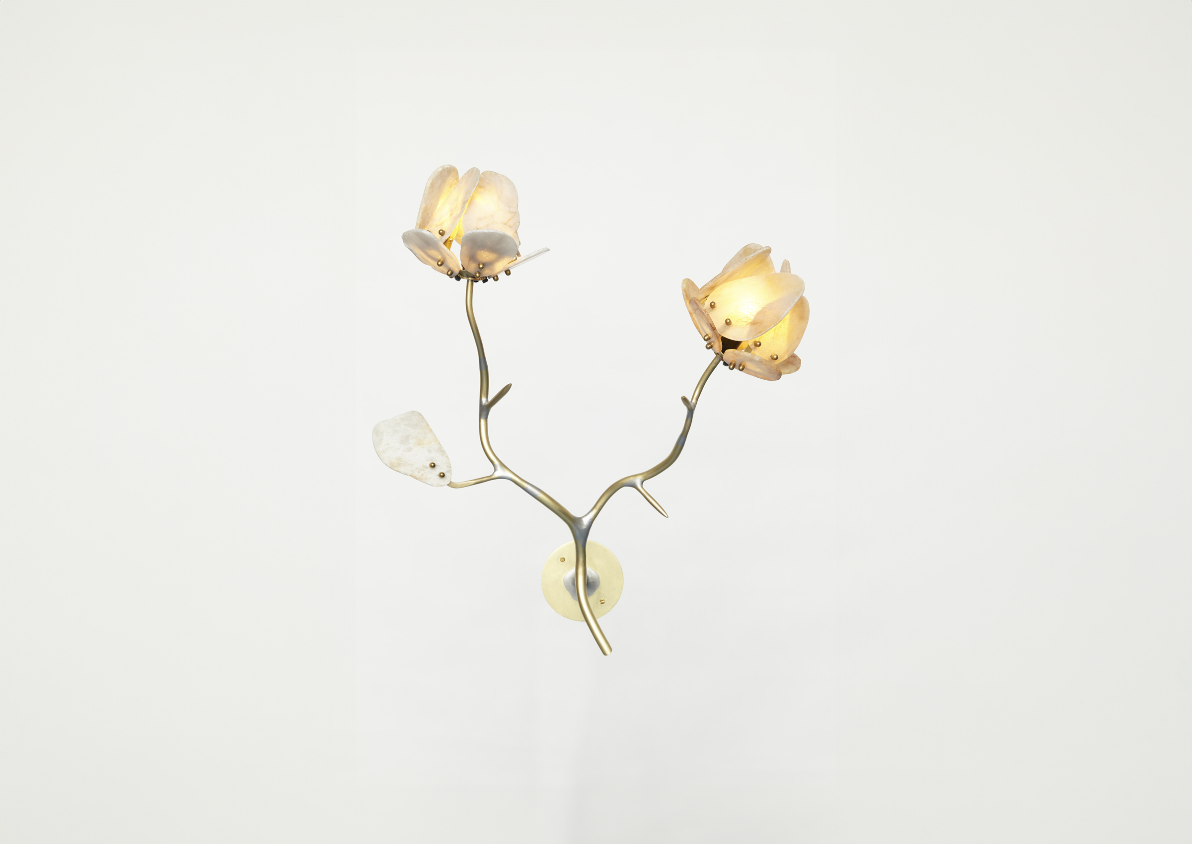 The Stone Rose Sconce is a captivating counterpart to the substantial Geology mirrors from Chen Chen & Kai Williams. Each rose is meticulously crafted from thinly sliced petals, carefully hewn from quartz stones discovered along the North Shore of Long Island. These remarkable stones originated from the glacial retreat that occurred approximately 16,000 to 20,000 years ago, infusing the sconce with a sense of timeless natural beauty. Experience the allure of the Stone Rose Sconce, where delicate craftsmanship meets geological wonder.