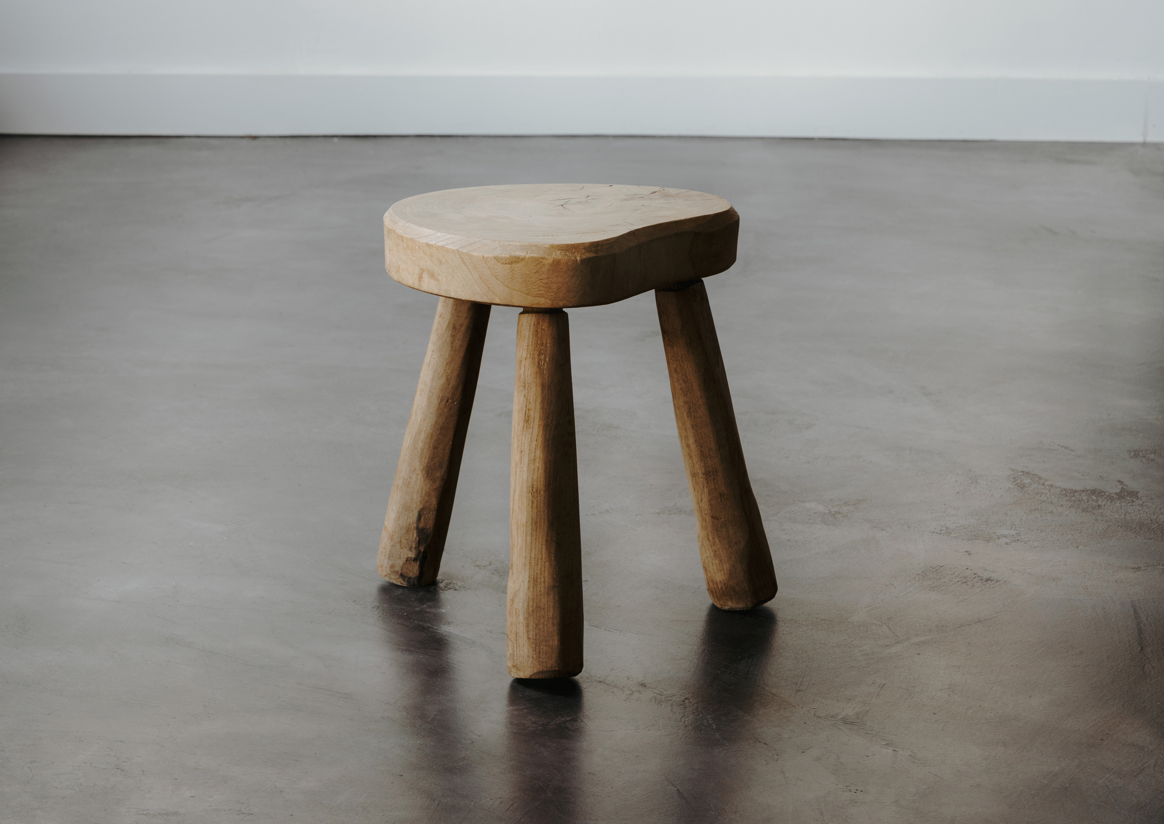 This 1940's rustic French Milking Stool is a work of functional design that was made to assist in "Dairying", which was traditionally Women's work. The short, tripod legs created a low center of gravity and the small scale allowed for portability. This piece makes visible both the labor of its maker and that of its intended user (often one and the same woman).