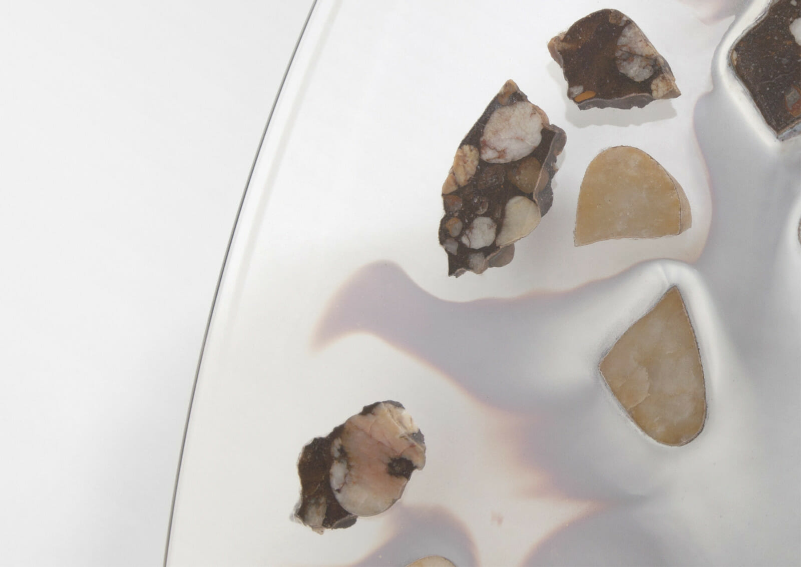 Chen Chen and Kai Williams have skillfully combined contrasting elements and materials to create a truly captivating collection of mirrors. Known as the Transition Mirrors, their name is inspired by the classification of silver as a "transition metal." These mirrors are meticulously crafted through a unique process, where a silver nitrate solution is carefully poured onto clear glass, creating a chemical bond with its surface. The defining feature of these mirrors lies at the contoured edge of the silver, where a deliberate point of fragility exists. This intentional design choice results in a moment of delicate beauty, adding an extraordinary touch to the overall construction.
