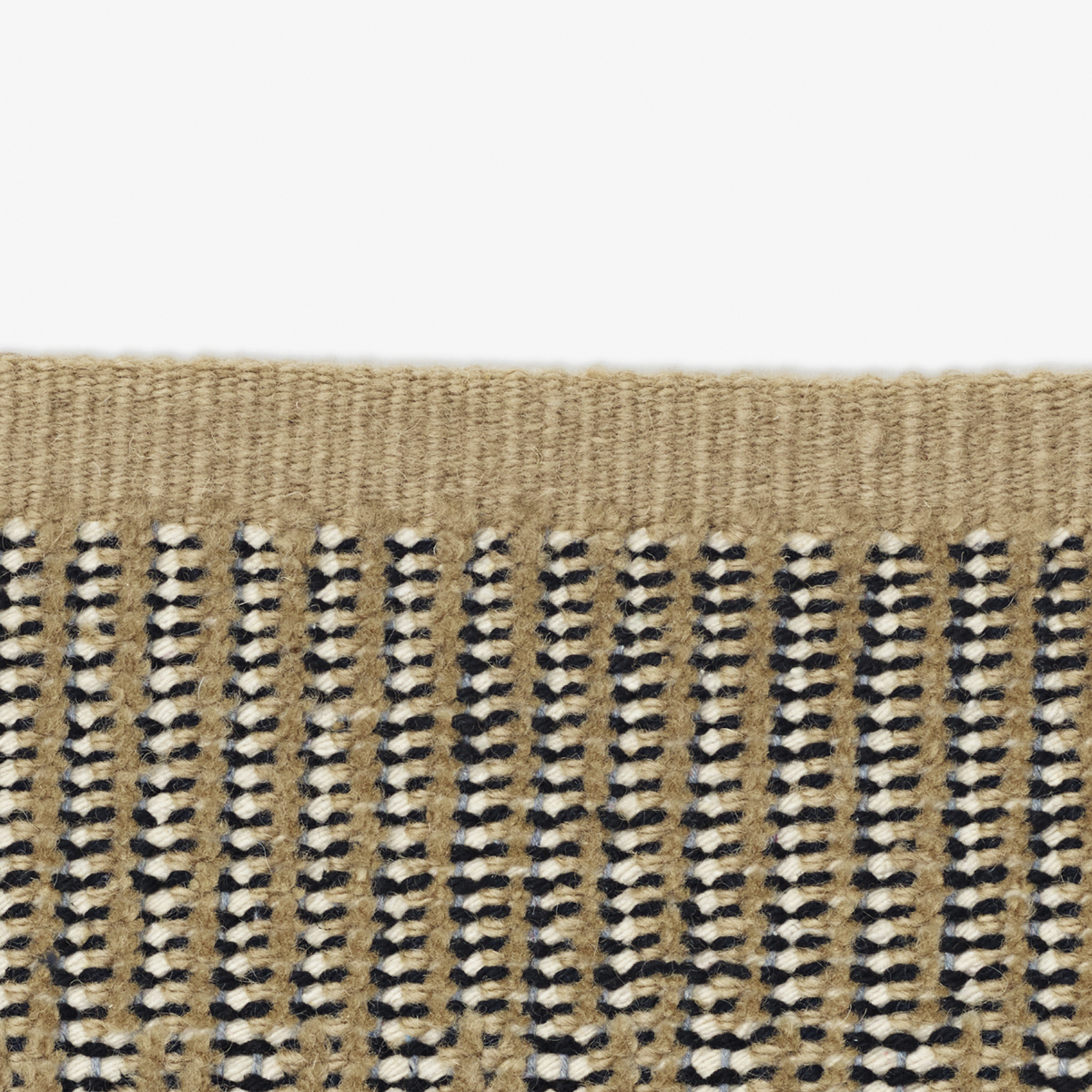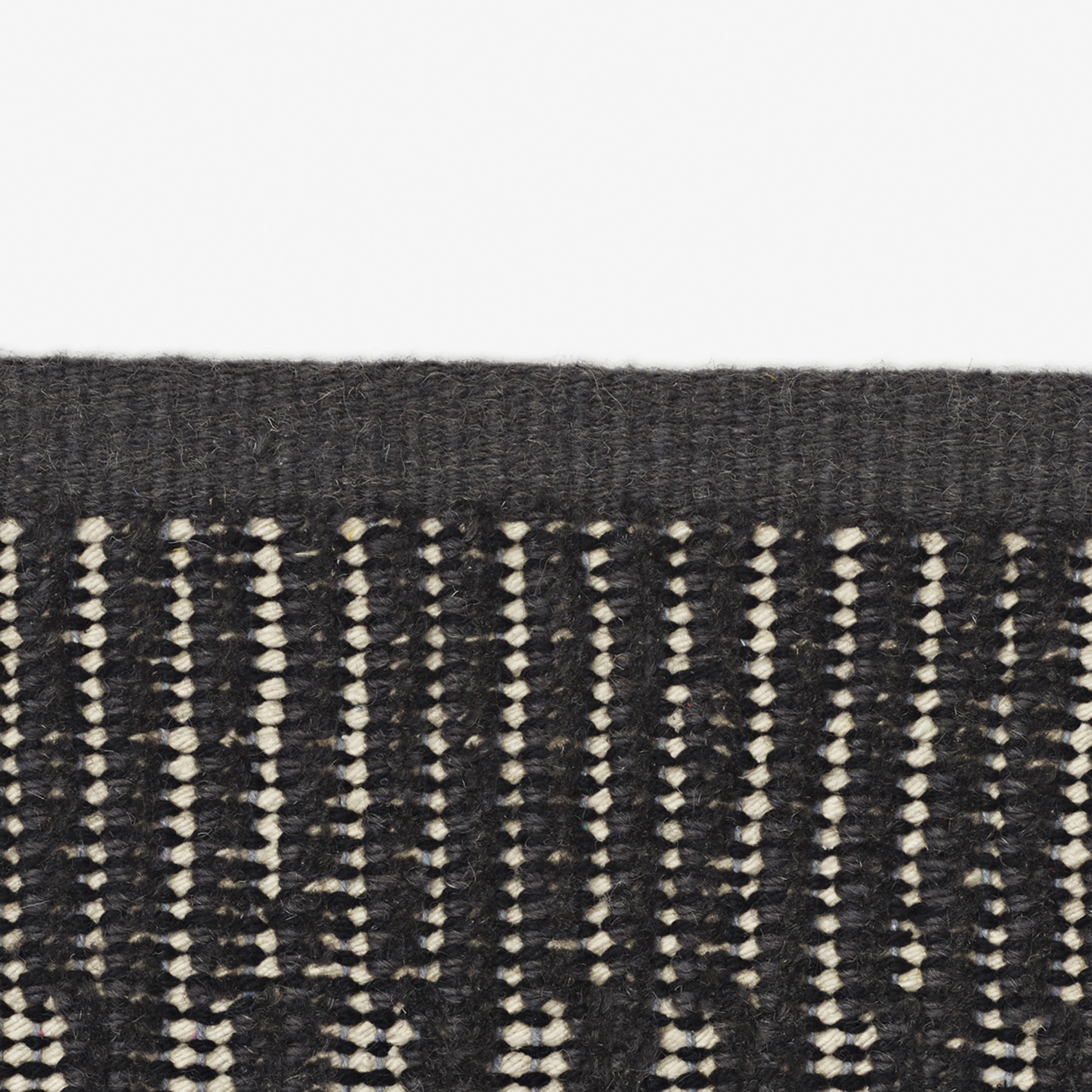 Kanon Pattern Plow reinterprets the archetypal construction of Kanon. It alternates a unicoloured pile with pile-free ribs to create a rhythmic, tactile structure. An interplay of black and white cotton yarns forms the rug’s background. Borders crafted with a denser ribbed structure complete its expression.