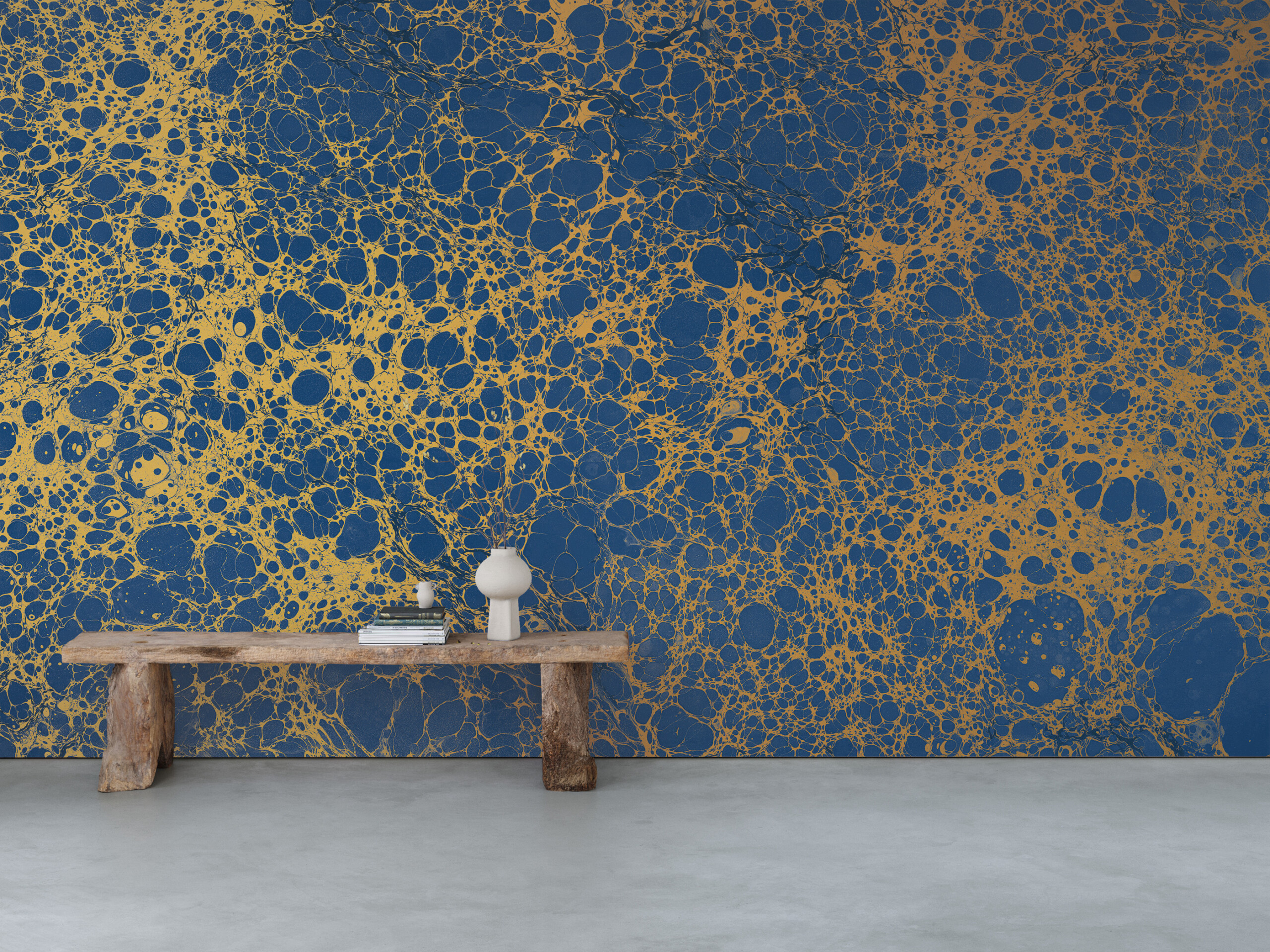 Calico Wallpaper's method embodies years of research in the various disciplines in paper marbling, which have spanned the globe. The arts of Suminagashi and Ebru, emanating from Japan and Turkey respectively centuries ago are both evident in the collection. However, it is their expansion of these practices that makes Calico Wallpapers truly unique. By drawing from each of these forms they have created something entirely different. The origins of Wabi are found in the landscapes of the ancient east, conjuring the feel of water flowing over pebbles.